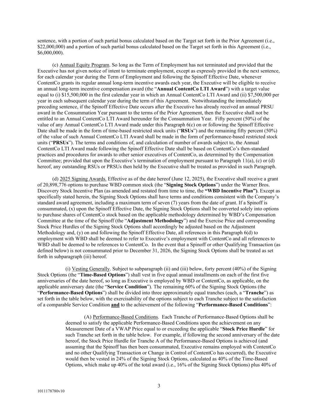 3 1011178780v10 sentence, with a portion of such partial bonus calculated based on the Target set forth in the Prior Agreement (i.e., $22,000,000) and a portion of such partial bonus calculated based on the Target set forth in this Agreement (i.e., $6,000,000). (c) Annual Equity Program. So long as the Term of Employment has not terminated and provided that the Executive has not given notice of intent to terminate employment, except as expressly provided in the next sentence, for each calendar year during the Term of Employment and following the Spinoff Effective Date, whenever ContentCo grants its regular annual long-term incentive awards each year, the Executive will be eligible to receive an annual long-term incentive compensation award (the “Annual ContentCo LTI Award”) with a target value equal to (i) $15,500,000 in the first calendar year in which an Annual ContentCo LTI Award and (ii) $7,500,000 per year in each subsequent calendar year during the term of this Agreement. Notwithstanding the immediately preceding sentence, if the Spinoff Effective Date occurs after the Executive has already received an annual PRSU award in the Consummation Year pursuant to the terms of the Prior Agreement, then the Executive shall not be entitled to an Annual ContentCo LTI Award hereunder for the Consummation Year. Fifty percent (50%) of the value of any Annual ContentCo LTI Award made under this Paragraph 6(c) on or following the Spinoff Effective Date shall be made in the form of time-based restricted stock units (“RSUs”) and the remaining fifty percent (50%) of the value of such Annual ContentCo LTI Award shall be made in the form of performance-based restricted stock units (“PRSUs”). The terms and conditions of, and calculation of number of awards subject to, the Annual ContentCo LTI Award made following the Spinoff Effective Date shall be based on ContentCo’s then-standard practices and procedures for awards to other senior executives of ContentCo, as determined by the Compensation Committee; provided that upon the Executive’s termination of employment pursuant to Paragraph 11(a), (c) or (d) hereof, any outstanding RSUs or PRSUs then held by the Executive shall be treated as provided in such Paragraph. (d) 2025 Signing Awards. Effective as of the date hereof (June 12, 2025), the Executive shall receive a grant of 20,898,776 options to purchase WBD common stock (the “Signing Stock Options”) under the Warner Bros. Discovery Stock Incentive Plan (as amended and restated from time to time, the “WBD Incentive Plan”). Except as specifically stated herein, the Signing Stock Options shall have terms and conditions consistent with the Company’s standard award agreement, including a maximum term of seven (7) years from the date of grant. If a Spinoff is consummated, (x) upon the Spinoff Effective Date, the Signing Stock Options shall be converted solely into options to purchase shares of ContentCo stock based on the applicable methodology determined by WBD’s Compensation Committee at the time of the Spinoff (the “Adjustment Methodology”) and the Exercise Price and corresponding Stock Price Hurdles of the Signing Stock Options shall accordingly be adjusted based on the Adjustment Methodology and, (y) on and following the Spinoff Effective Date, all references in this Paragraph 6(d) to employment with WBD shall be deemed to refer to Executive’s employment with ContentCo and all references to WBD shall be deemed to be references to ContentCo. In the event that a Spinoff or other Qualifying Transaction (as defined below) is not consummated prior to December 31, 2026, the Signing Stock Options shall be treated as set forth in subparagraph (iii) hereof. (i) Vesting Generally. Subject to subparagraph (ii) and (iii) below, forty percent (40%) of the Signing Stock Options (the “Time-Based Options”) shall vest in five equal annual installments on each of the first five anniversaries of the date hereof, so long as Executive is employed by WBD or ContentCo, as applicable, on the applicable anniversary date (the “Service Condition”). The remaining 60% of the Signing Stock Options (the “Performance-Based Options”) shall be divided into three approximately equal tranches (each, a “Tranche”) as set forth in the table below, with the exercisability of the options subject to each Tranche subject to the satisfaction of a comparable Service Condition and to the achievement of the following “Performance-Based Conditions”: (A) Performance-Based Conditions. Each Tranche of Performance-Based Options shall be deemed to satisfy the applicable Performance-Based Conditions upon the achievement on any Measurement Date of a VWAP Price equal to or exceeding the applicable “Stock Price Hurdle” for such Tranche set forth in the table below. For example, if following the second anniversary of the date hereof, the Stock Price Hurdle for Tranche A of the Performance-Based Options is achieved (and assuming that the Spinoff has then been consummated, Executive remains employed with ContentCo and no other Qualifying Transaction or Change in Control of ContentCo has occurred), the Executive would then be vested in 24% of the Signing Stock Options, calculated as 40% of the Time-Based Options, which make up 40% of the total award (i.e., 16% of the Signing Stock Options) plus 40% of