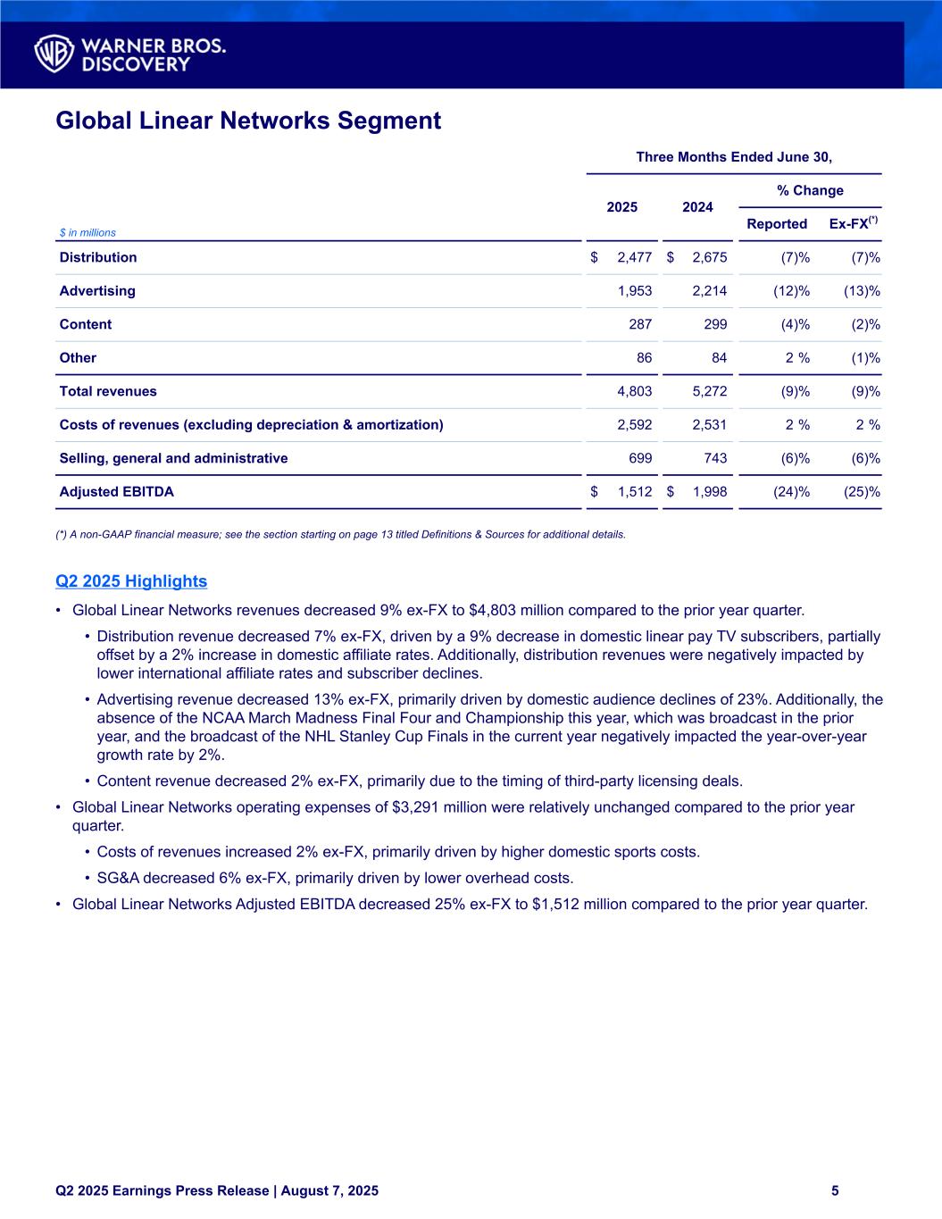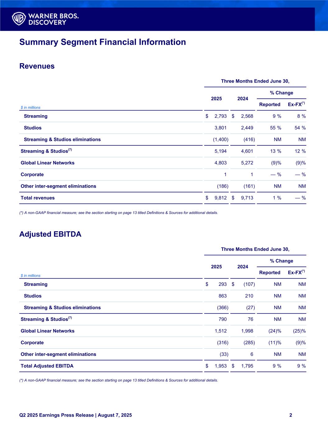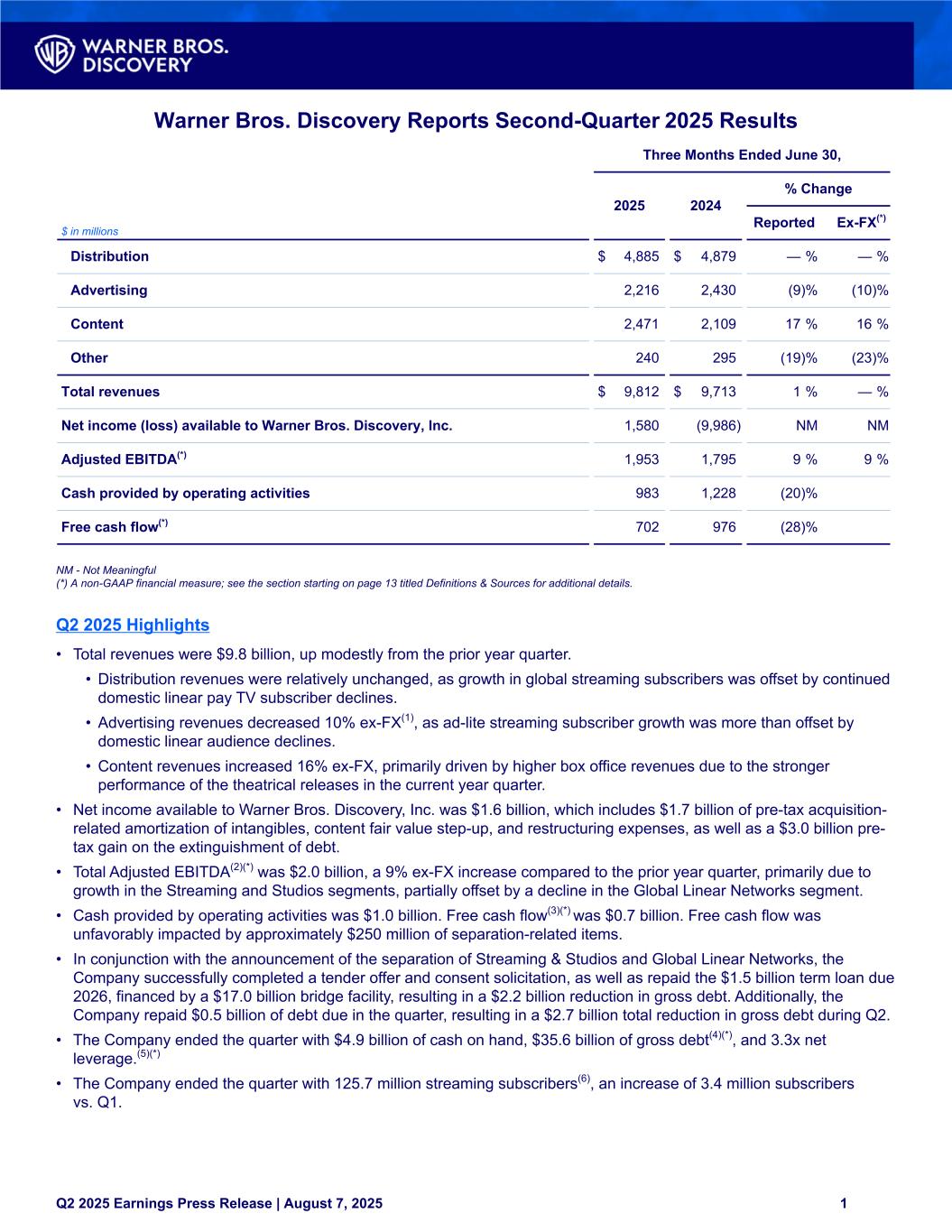 Warner Bros. Discovery Reports Second-Quarter 2025 Results Three Months Ended June 30, 2025 2024 % Change $ in millions Reported Ex-FX(*) Distribution $ 4,885 $ 4,879 — % — % Advertising 2,216 2,430 (9) % (10) % Content 2,471 2,109 17 % 16 % Other 240 295 (19) % (23) % Total revenues $ 9,812 $ 9,713 1 % — % Net income (loss) available to Warner Bros. Discovery, Inc. 1,580 (9,986) NM NM Adjusted EBITDA(*) 1,953 1,795 9 % 9 % Cash provided by operating activities 983 1,228 (20) % Free cash flow(*) 702 976 (28) % NM - Not Meaningful (*) A non-GAAP financial measure; see the section starting on page 13 titled Definitions & Sources for additional details. Q2 2025 Highlights • Total revenues were $9.8 billion, up modestly from the prior year quarter. • Distribution revenues were relatively unchanged, as growth in global streaming subscribers was offset by continued domestic linear pay TV subscriber declines. • Advertising revenues decreased 10% ex-FX(1), as ad-lite streaming subscriber growth was more than offset by domestic linear audience declines. • Content revenues increased 16% ex-FX, primarily driven by higher box office revenues due to the stronger performance of the theatrical releases in the current year quarter. • Net income available to Warner Bros. Discovery, Inc. was $1.6 billion, which includes $1.7 billion of pre-tax acquisition- related amortization of intangibles, content fair value step-up, and restructuring expenses, as well as a $3.0 billion pre- tax gain on the extinguishment of debt. • Total Adjusted EBITDA(2)(*) was $2.0 billion, a 9% ex-FX increase compared to the prior year quarter, primarily due to growth in the Streaming and Studios segments, partially offset by a decline in the Global Linear Networks segment. • Cash provided by operating activities was $1.0 billion. Free cash flow(3)(*) was $0.7 billion. Free cash flow was unfavorably impacted by approximately $250 million of separation-related items. • In conjunction with the announcement of the separation of Streaming & Studios and Global Linear Networks, the Company successfully completed a tender offer and consent solicitation, as well as repaid the $1.5 billion term loan due 2026, financed by a $17.0 billion bridge facility, resulting in a $2.2 billion reduction in gross debt. Additionally, the Company repaid $0.5 billion of debt due in the quarter, resulting in a $2.7 billion total reduction in gross debt during Q2. • The Company ended the quarter with $4.9 billion of cash on hand, $35.6 billion of gross debt(4)(*), and 3.3x net leverage.(5)(*) • The Company ended the quarter with 125.7 million streaming subscribers(6), an increase of 3.4 million subscribers vs. Q1. Q2 2025 Earnings Press Release | August 7, 2025 1