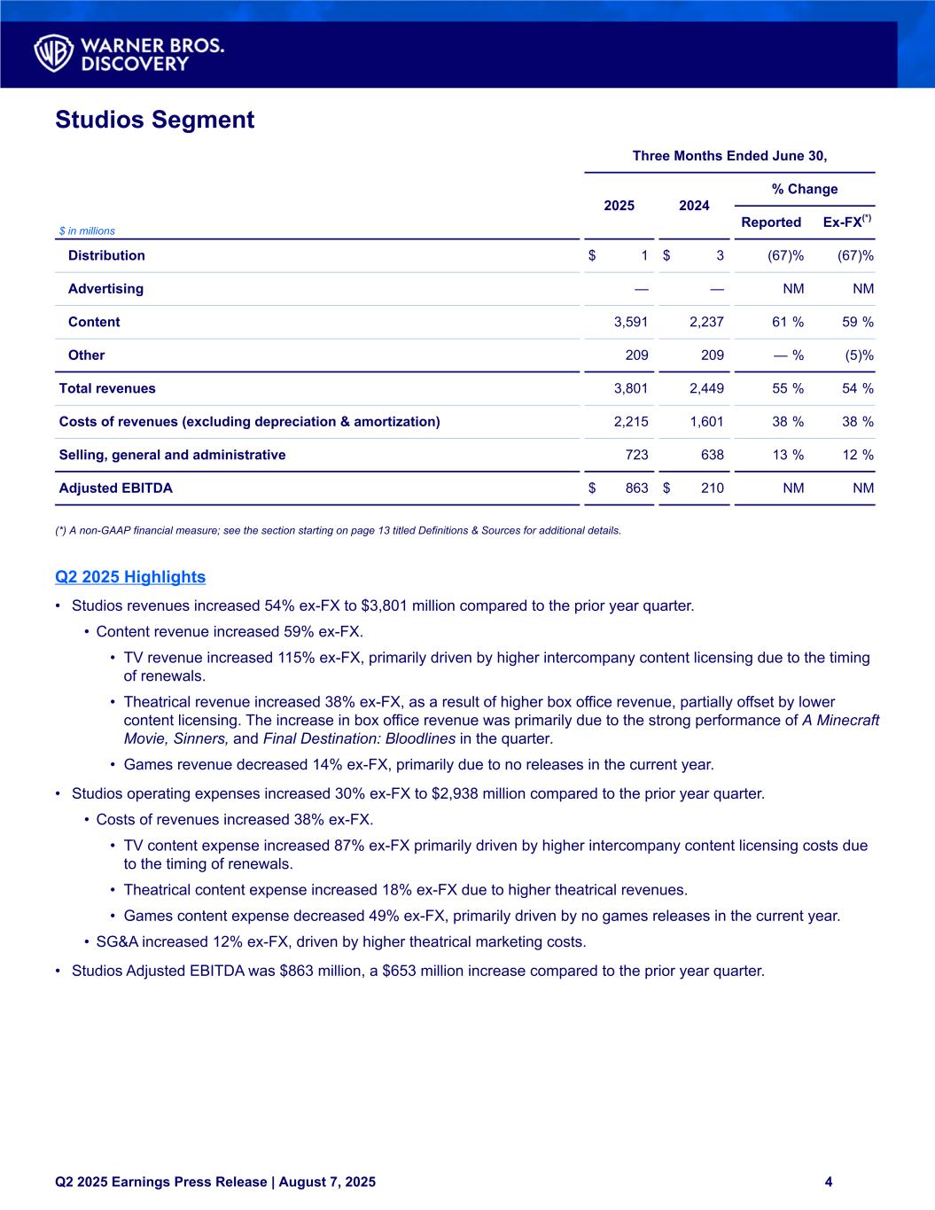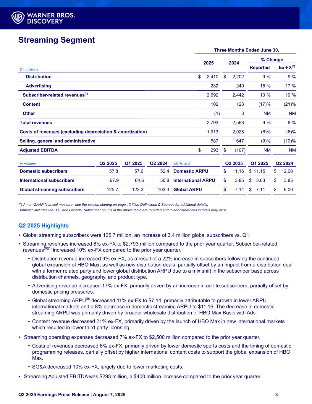 Streaming Segment Three Months Ended June 30, 2025 2024 % Change $ in millions Reported Ex-FX(*) Distribution $ 2,410 $ 2,202 9 % 9 % Advertising 282 240 18 % 17 % Subscriber-related revenues(*) 2,692 2,442 10 % 10 % Content 102 123 (17) % (21) % Other (1) 3 NM NM Total revenues 2,793 2,568 9 % 8 % Costs of revenues (excluding depreciation & amortization) 1,913 2,028 (6) % (6) % Selling, general and administrative 587 647 (9) % (10) % Adjusted EBITDA $ 293 $ (107) NM NM In millions Q2 2025 Q1 2025 Q2 2024 ARPU in $ Q2 2025 Q1 2025 Q2 2024 Domestic subscribers 57.8 57.6 52.4 Domestic ARPU $ 11.16 $ 11.15 $ 12.08 International subscribers 67.9 64.6 50.8 International ARPU $ 3.85 $ 3.63 $ 3.85 Global streaming subscribers 125.7 122.3 103.3 Global ARPU $ 7.14 $ 7.11 $ 8.00 (*) A non-GAAP financial measure; see the section starting on page 13 titled Definitions & Sources for additional details. Domestic includes the U.S. and Canada. Subscriber counts in the above table are rounded and minor differences in totals may exist. Q2 2025 Highlights • Global streaming subscribers were 125.7 million, an increase of 3.4 million global subscribers vs. Q1. • Streaming revenues increased 8% ex-FX to $2,793 million compared to the prior year quarter. Subscriber-related revenues(8)(*) increased 10% ex-FX compared to the prior year quarter. • Distribution revenue increased 9% ex-FX, as a result of a 22% increase in subscribers following the continued global expansion of HBO Max, as well as new distribution deals, partially offset by an impact from a distribution deal with a former related party and lower global distribution ARPU due to a mix shift in the subscriber base across distribution channels, geography, and product type. • Advertising revenue increased 17% ex-FX, primarily driven by an increase in ad-lite subscribers, partially offset by domestic pricing pressures. • Global streaming ARPU(9) decreased 11% ex-FX to $7.14, primarily attributable to growth in lower ARPU international markets and a 8% decrease in domestic streaming ARPU to $11.16. The decrease in domestic streaming ARPU was primarily driven by broader wholesale distribution of HBO Max Basic with Ads. • Content revenue decreased 21% ex-FX, primarily driven by the launch of HBO Max in new international markets which resulted in lower third-party licensing. • Streaming operating expenses decreased 7% ex-FX to $2,500 million compared to the prior year quarter. • Costs of revenues decreased 6% ex-FX, primarily driven by lower domestic sports costs and the timing of domestic programming releases, partially offset by higher international content costs to support the global expansion of HBO Max. • SG&A decreased 10% ex-FX, largely due to lower marketing costs. • Streaming Adjusted EBITDA was $293 million, a $400 million increase compared to the prior year quarter. Q2 2025 Earnings Press Release | August 7, 2025 3