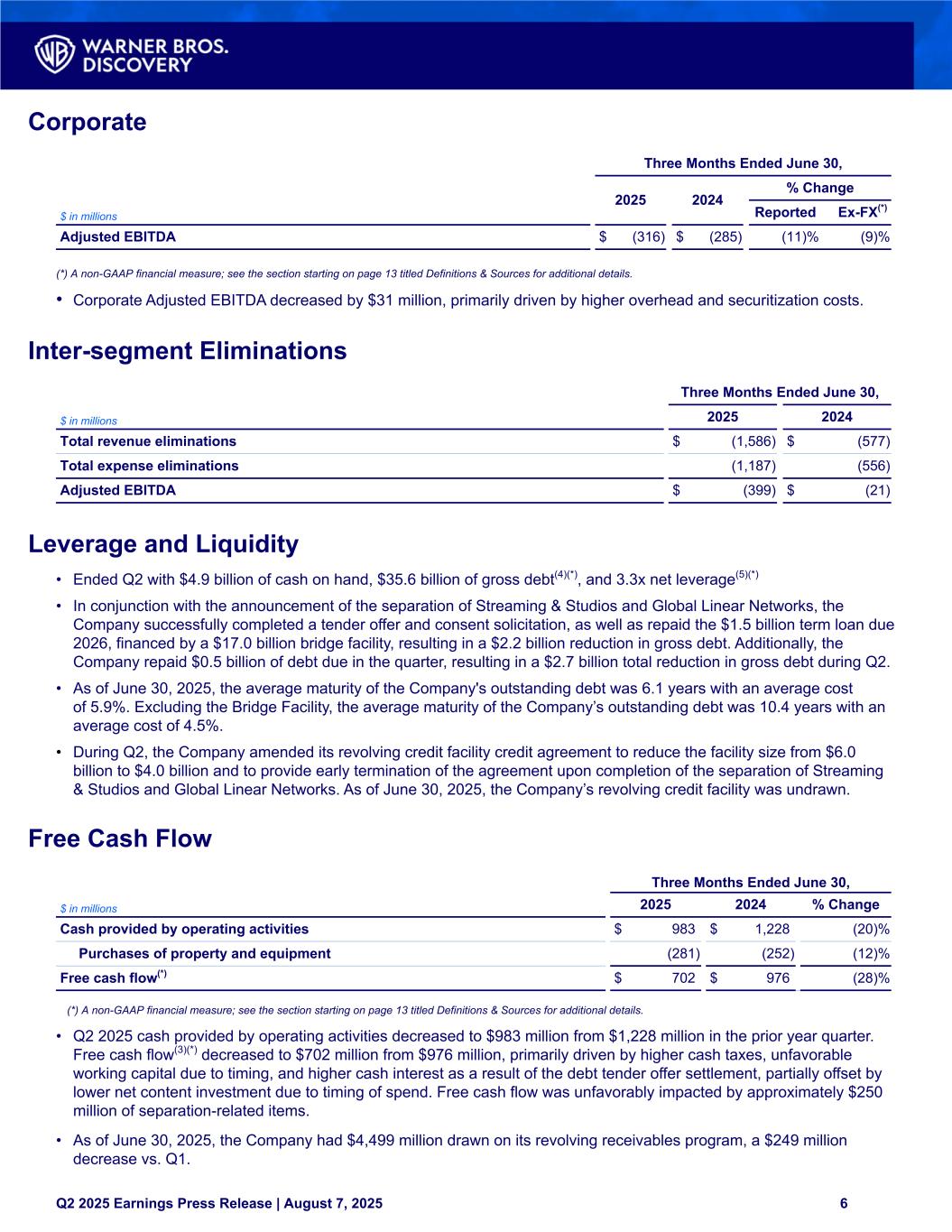Corporate Three Months Ended June 30, 2025 2024 % Change $ in millions Reported Ex-FX(*) Adjusted EBITDA $ (316) $ (285) (11) % (9) % (*) A non-GAAP financial measure; see the section starting on page 13 titled Definitions & Sources for additional details. • Corporate Adjusted EBITDA decreased by $31 million, primarily driven by higher overhead and securitization costs. Inter-segment Eliminations Three Months Ended June 30, $ in millions 2025 2024 Total revenue eliminations $ (1,586) $ (577) Total expense eliminations (1,187) (556) Adjusted EBITDA $ (399) $ (21) Leverage and Liquidity • Ended Q2 with $4.9 billion of cash on hand, $35.6 billion of gross debt(4)(*), and 3.3x net leverage(5)(*) • In conjunction with the announcement of the separation of Streaming & Studios and Global Linear Networks, the Company successfully completed a tender offer and consent solicitation, as well as repaid the $1.5 billion term loan due 2026, financed by a $17.0 billion bridge facility, resulting in a $2.2 billion reduction in gross debt. Additionally, the Company repaid $0.5 billion of debt due in the quarter, resulting in a $2.7 billion total reduction in gross debt during Q2. • As of June 30, 2025, the average maturity of the Company's outstanding debt was 6.1 years with an average cost of 5.9%. Excluding the Bridge Facility, the average maturity of the Company’s outstanding debt was 10.4 years with an average cost of 4.5%. • During Q2, the Company amended its revolving credit facility credit agreement to reduce the facility size from $6.0 billion to $4.0 billion and to provide early termination of the agreement upon completion of the separation of Streaming & Studios and Global Linear Networks. As of June 30, 2025, the Company’s revolving credit facility was undrawn. Free Cash Flow Three Months Ended June 30, $ in millions 2025 2024 % Change Cash provided by operating activities $ 983 $ 1,228 (20) % Purchases of property and equipment (281) (252) (12) % Free cash flow(*) $ 702 $ 976 (28) % (*) A non-GAAP financial measure; see the section starting on page 13 titled Definitions & Sources for additional details. • Q2 2025 cash provided by operating activities decreased to $983 million from $1,228 million in the prior year quarter. Free cash flow(3)(*) decreased to $702 million from $976 million, primarily driven by higher cash taxes, unfavorable working capital due to timing, and higher cash interest as a result of the debt tender offer settlement, partially offset by lower net content investment due to timing of spend. Free cash flow was unfavorably impacted by approximately $250 million of separation-related items. • As of June 30, 2025, the Company had $4,499 million drawn on its revolving receivables program, a $249 million decrease vs. Q1. Q2 2025 Earnings Press Release | August 7, 2025 6