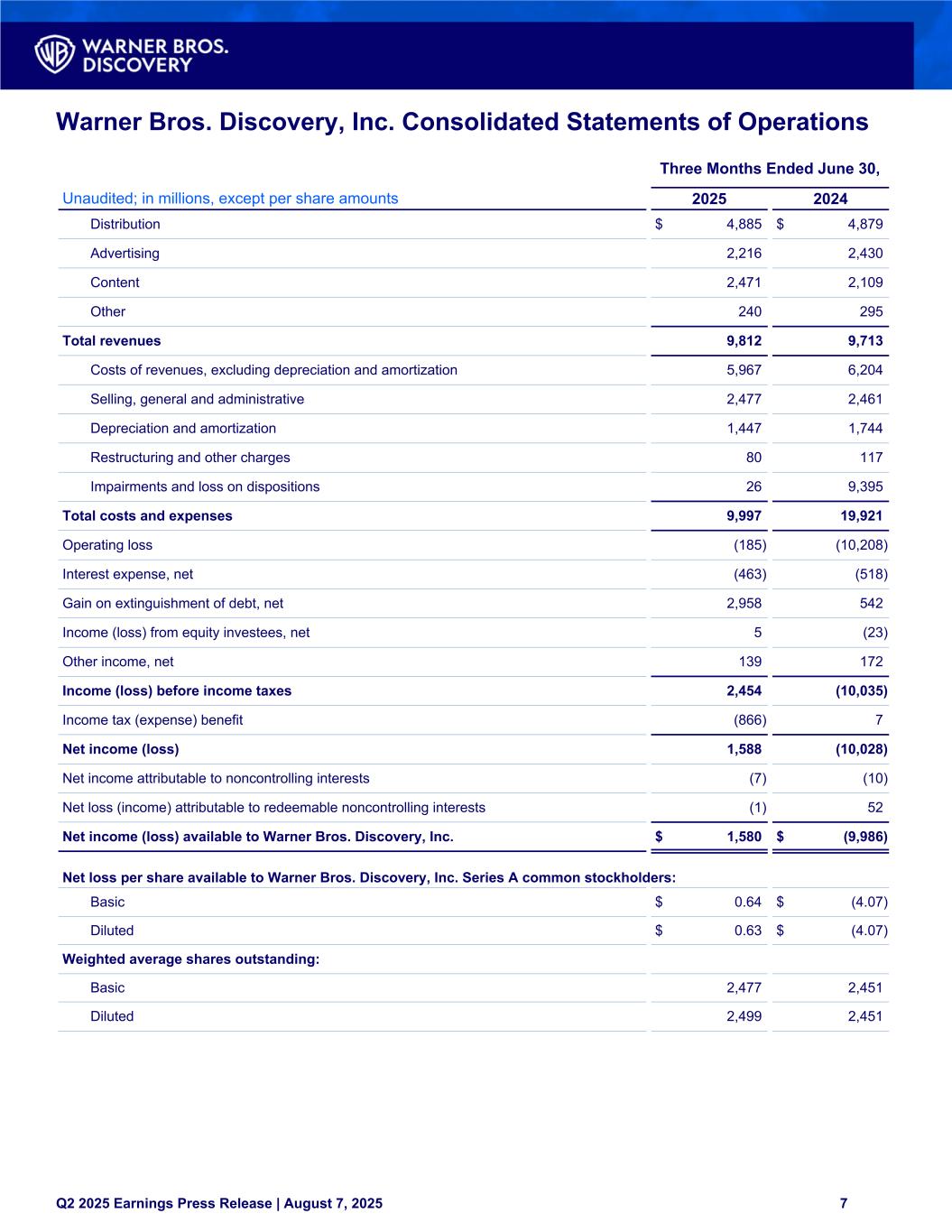 Warner Bros. Discovery, Inc. Consolidated Statements of Operations Three Months Ended June 30, Unaudited; in millions, except per share amounts 2025 2024 Distribution $ 4,885 $ 4,879 Advertising 2,216 2,430 Content 2,471 2,109 Other 240 295 Total revenues 9,812 9,713 Costs of revenues, excluding depreciation and amortization 5,967 6,204 Selling, general and administrative 2,477 2,461 Depreciation and amortization 1,447 1,744 Restructuring and other charges 80 117 Impairments and loss on dispositions 26 9,395 Total costs and expenses 9,997 19,921 Operating loss (185) (10,208) Interest expense, net (463) (518) Gain on extinguishment of debt, net 2,958 542 Income (loss) from equity investees, net 5 (23) Other income, net 139 172 Income (loss) before income taxes 2,454 (10,035) Income tax (expense) benefit (866) 7 Net income (loss) 1,588 (10,028) Net income attributable to noncontrolling interests (7) (10) Net loss (income) attributable to redeemable noncontrolling interests (1) 52 Net income (loss) available to Warner Bros. Discovery, Inc. $ 1,580 $ (9,986) Net loss per share available to Warner Bros. Discovery, Inc. Series A common stockholders: Basic $ 0.64 $ (4.07) Diluted $ 0.63 $ (4.07) Weighted average shares outstanding: Basic 2,477 2,451 Diluted 2,499 2,451 Q2 2025 Earnings Press Release | August 7, 2025 7