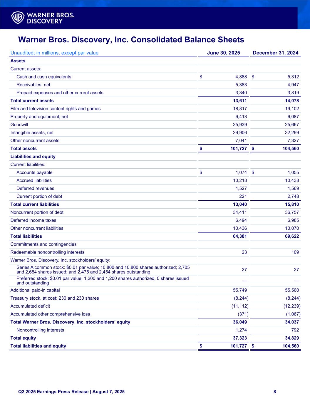 Warner Bros. Discovery, Inc. Consolidated Balance Sheets Unaudited; in millions, except par value June 30, 2025 December 31, 2024 Assets Current assets: Cash and cash equivalents $ 4,888 $ 5,312 Receivables, net 5,383 4,947 Prepaid expenses and other current assets 3,340 3,819 Total current assets 13,611 14,078 Film and television content rights and games 18,817 19,102 Property and equipment, net 6,413 6,087 Goodwill 25,939 25,667 Intangible assets, net 29,906 32,299 Other noncurrent assets 7,041 7,327 Total assets $ 101,727 $ 104,560 Liabilities and equity Current liabilities: Accounts payable $ 1,074 $ 1,055 Accrued liabilities 10,218 10,438 Deferred revenues 1,527 1,569 Current portion of debt 221 2,748 Total current liabilities 13,040 15,810 Noncurrent portion of debt 34,411 36,757 Deferred income taxes 6,494 6,985 Other noncurrent liabilities 10,436 10,070 Total liabilities 64,381 69,622 Commitments and contingencies Redeemable noncontrolling interests 23 109 Warner Bros. Discovery, Inc. stockholders’ equity: Series A common stock: $0.01 par value; 10,800 and 10,800 shares authorized; 2,705 and 2,684 shares issued; and 2,475 and 2,454 shares outstanding 27 27 Preferred stock: $0.01 par value; 1,200 and 1,200 shares authorized, 0 shares issued and outstanding — — Additional paid-in capital 55,749 55,560 Treasury stock, at cost: 230 and 230 shares (8,244) (8,244) Accumulated deficit (11,112) (12,239) Accumulated other comprehensive loss (371) (1,067) Total Warner Bros. Discovery, Inc. stockholders’ equity 36,049 34,037 Noncontrolling interests 1,274 792 Total equity 37,323 34,829 Total liabilities and equity $ 101,727 $ 104,560 Q2 2025 Earnings Press Release | August 7, 2025 8
