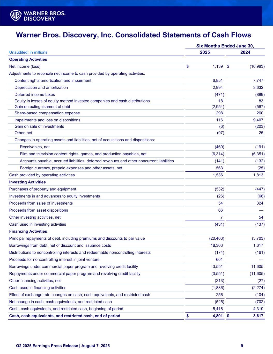 Warner Bros. Discovery, Inc. Consolidated Statements of Cash Flows Six Months Ended June 30, Unaudited; in millions 2025 2024 Operating Activities Net income (loss) $ 1,139 $ (10,983) Adjustments to reconcile net income to cash provided by operating activities: Content rights amortization and impairment 6,851 7,747 Depreciation and amortization 2,994 3,632 Deferred income taxes (471) (889) Equity in losses of equity method investee companies and cash distributions 18 83 Gain on extinguishment of debt (2,954) (567) Share-based compensation expense 298 260 Impairments and loss on dispositions 116 9,407 Gain on sale of investments (6) (203) Other, net (97) 25 Changes in operating assets and liabilities, net of acquisitions and dispositions: Receivables, net (460) (191) Film and television content rights, games, and production payables, net (6,314) (6,351) Accounts payable, accrued liabilities, deferred revenues and other noncurrent liabilities (141) (132) Foreign currency, prepaid expenses and other assets, net 563 (25) Cash provided by operating activities 1,536 1,813 Investing Activities Purchases of property and equipment (532) (447) Investments in and advances to equity investments (26) (68) Proceeds from sales of investments 54 324 Proceeds from asset dispositions 66 — Other investing activities, net 7 54 Cash used in investing activities (431) (137) Financing Activities Principal repayments of debt, including premiums and discounts to par value (20,403) (3,703) Borrowings from debt, net of discount and issuance costs 18,303 1,617 Distributions to noncontrolling interests and redeemable noncontrolling interests (174) (161) Proceeds for noncontrolling interest in joint venture 601 — Borrowings under commercial paper program and revolving credit facility 3,551 11,605 Repayments under commercial paper program and revolving credit facility (3,551) (11,605) Other financing activities, net (213) (27) Cash used in financing activities (1,886) (2,274) Effect of exchange rate changes on cash, cash equivalents, and restricted cash 256 (104) Net change in cash, cash equivalents, and restricted cash (525) (702) Cash, cash equivalents, and restricted cash, beginning of period 5,416 4,319 Cash, cash equivalents, and restricted cash, end of period $ 4,891 $ 3,617 Q2 2025 Earnings Press Release | August 7, 2025 9