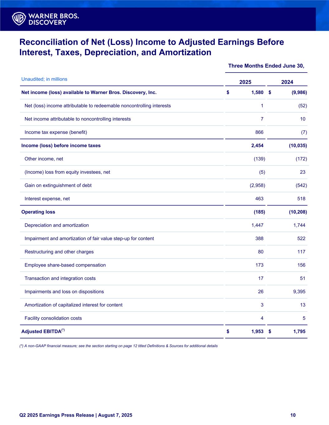 Reconciliation of Net (Loss) Income to Adjusted Earnings Before Interest, Taxes, Depreciation, and Amortization Three Months Ended June 30, Unaudited; in millions 2025 2024 Net income (loss) available to Warner Bros. Discovery, Inc. $ 1,580 $ (9,986) Net (loss) income attributable to redeemable noncontrolling interests 1 (52) Net income attributable to noncontrolling interests 7 10 Income tax expense (benefit) 866 (7) Income (loss) before income taxes 2,454 (10,035) Other income, net (139) (172) (Income) loss from equity investees, net (5) 23 Gain on extinguishment of debt (2,958) (542) Interest expense, net 463 518 Operating loss (185) (10,208) Depreciation and amortization 1,447 1,744 Impairment and amortization of fair value step-up for content 388 522 Restructuring and other charges 80 117 Employee share-based compensation 173 156 Transaction and integration costs 17 51 Impairments and loss on dispositions 26 9,395 Amortization of capitalized interest for content 3 13 Facility consolidation costs 4 5 Adjusted EBITDA(*) $ 1,953 $ 1,795 (*) A non-GAAP financial measure; see the section starting on page 12 titled Definitions & Sources for additional details Q2 2025 Earnings Press Release | August 7, 2025 10