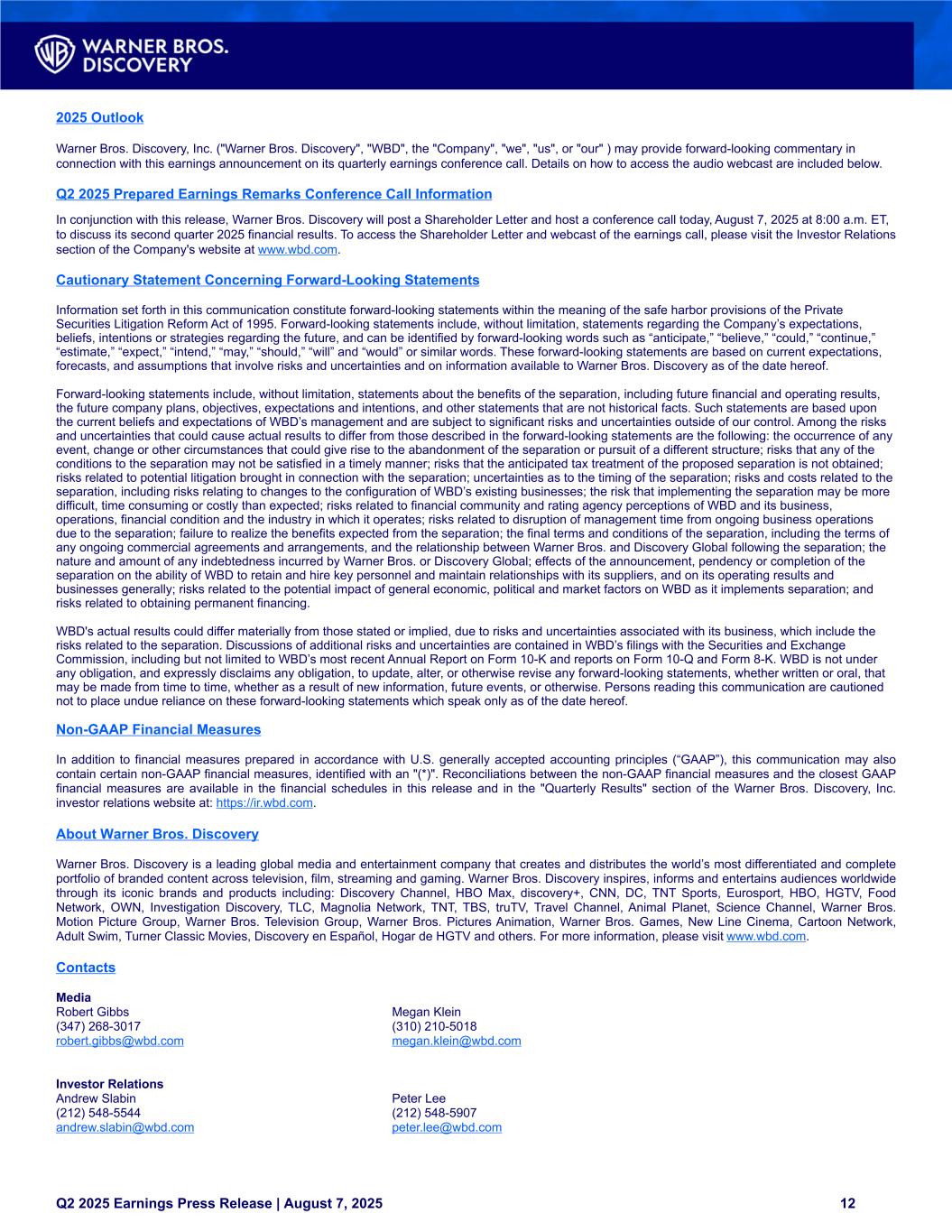 2025 Outlook Warner Bros. Discovery, Inc. ("Warner Bros. Discovery", "WBD", the "Company", "we", "us", or "our" ) may provide forward-looking commentary in connection with this earnings announcement on its quarterly earnings conference call. Details on how to access the audio webcast are included below. Q2 2025 Prepared Earnings Remarks Conference Call Information In conjunction with this release, Warner Bros. Discovery will post a Shareholder Letter and host a conference call today, August 7, 2025 at 8:00 a.m. ET, to discuss its second quarter 2025 financial results. To access the Shareholder Letter and webcast of the earnings call, please visit the Investor Relations section of the Company's website at www.wbd.com. Cautionary Statement Concerning Forward-Looking Statements Information set forth in this communication constitute forward-looking statements within the meaning of the safe harbor provisions of the Private Securities Litigation Reform Act of 1995. Forward-looking statements include, without limitation, statements regarding the Company’s expectations, beliefs, intentions or strategies regarding the future, and can be identified by forward-looking words such as “anticipate,” “believe,” “could,” “continue,” “estimate,” “expect,” “intend,” “may,” “should,” “will” and “would” or similar words. These forward-looking statements are based on current expectations, forecasts, and assumptions that involve risks and uncertainties and on information available to Warner Bros. Discovery as of the date hereof. Forward-looking statements include, without limitation, statements about the benefits of the separation, including future financial and operating results, the future company plans, objectives, expectations and intentions, and other statements that are not historical facts. Such statements are based upon the current beliefs and expectations of WBD’s management and are subject to significant risks and uncertainties outside of our control. Among the risks and uncertainties that could cause actual results to differ from those described in the forward-looking statements are the following: the occurrence of any event, change or other circumstances that could give rise to the abandonment of the separation or pursuit of a different structure; risks that any of the conditions to the separation may not be satisfied in a timely manner; risks that the anticipated tax treatment of the proposed separation is not obtained; risks related to potential litigation brought in connection with the separation; uncertainties as to the timing of the separation; risks and costs related to the separation, including risks relating to changes to the configuration of WBD’s existing businesses; the risk that implementing the separation may be more difficult, time consuming or costly than expected; risks related to financial community and rating agency perceptions of WBD and its business, operations, financial condition and the industry in which it operates; risks related to disruption of management time from ongoing business operations due to the separation; failure to realize the benefits expected from the separation; the final terms and conditions of the separation, including the terms of any ongoing commercial agreements and arrangements, and the relationship between Warner Bros. and Discovery Global following the separation; the nature and amount of any indebtedness incurred by Warner Bros. or Discovery Global; effects of the announcement, pendency or completion of the separation on the ability of WBD to retain and hire key personnel and maintain relationships with its suppliers, and on its operating results and businesses generally; risks related to the potential impact of general economic, political and market factors on WBD as it implements separation; and risks related to obtaining permanent financing. WBD's actual results could differ materially from those stated or implied, due to risks and uncertainties associated with its business, which include the risks related to the separation. Discussions of additional risks and uncertainties are contained in WBD’s filings with the Securities and Exchange Commission, including but not limited to WBD’s most recent Annual Report on Form 10-K and reports on Form 10-Q and Form 8-K. WBD is not under any obligation, and expressly disclaims any obligation, to update, alter, or otherwise revise any forward-looking statements, whether written or oral, that may be made from time to time, whether as a result of new information, future events, or otherwise. Persons reading this communication are cautioned not to place undue reliance on these forward-looking statements which speak only as of the date hereof. Non-GAAP Financial Measures In addition to financial measures prepared in accordance with U.S. generally accepted accounting principles (“GAAP”), this communication may also contain certain non-GAAP financial measures, identified with an "(*)". Reconciliations between the non-GAAP financial measures and the closest GAAP financial measures are available in the financial schedules in this release and in the "Quarterly Results" section of the Warner Bros. Discovery, Inc. investor relations website at: https://ir.wbd.com. About Warner Bros. Discovery Warner Bros. Discovery is a leading global media and entertainment company that creates and distributes the world’s most differentiated and complete portfolio of branded content across television, film, streaming and gaming. Warner Bros. Discovery inspires, informs and entertains audiences worldwide through its iconic brands and products including: Discovery Channel, HBO Max, discovery+, CNN, DC, TNT Sports, Eurosport, HBO, HGTV, Food Network, OWN, Investigation Discovery, TLC, Magnolia Network, TNT, TBS, truTV, Travel Channel, Animal Planet, Science Channel, Warner Bros. Motion Picture Group, Warner Bros. Television Group, Warner Bros. Pictures Animation, Warner Bros. Game