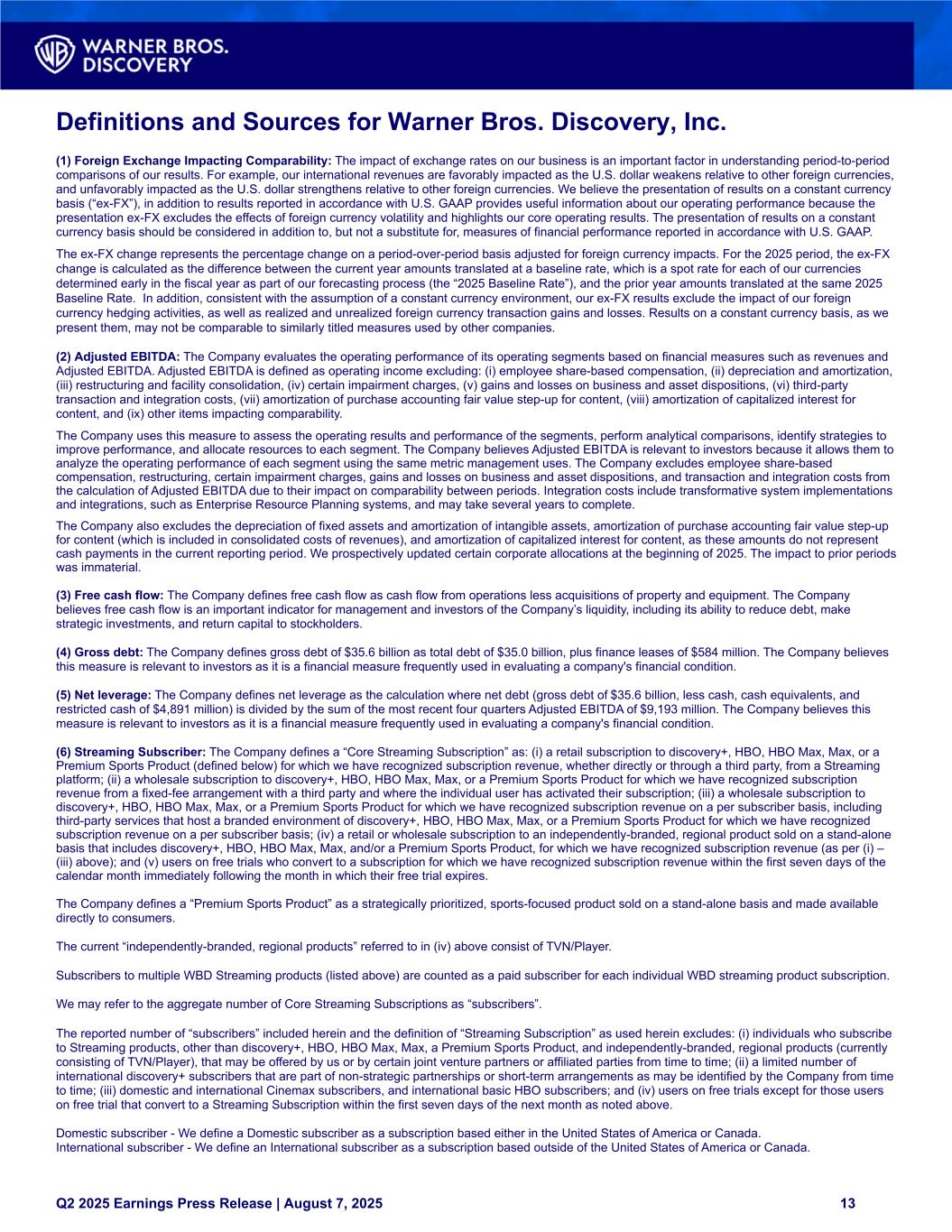 Definitions and Sources for Warner Bros. Discovery, Inc. (1) Foreign Exchange Impacting Comparability: The impact of exchange rates on our business is an important factor in understanding period-to-period comparisons of our results. For example, our international revenues are favorably impacted as the U.S. dollar weakens relative to other foreign currencies, and unfavorably impacted as the U.S. dollar strengthens relative to other foreign currencies. We believe the presentation of results on a constant currency basis (“ex-FX”), in addition to results reported in accordance with U.S. GAAP provides useful information about our operating performance because the presentation ex-FX excludes the effects of foreign currency volatility and highlights our core operating results. The presentation of results on a constant currency basis should be considered in addition to, but not a substitute for, measures of financial performance reported in accordance with U.S. GAAP. The ex-FX change represents the percentage change on a period-over-period basis adjusted for foreign currency impacts. For the 2025 period, the ex-FX change is calculated as the difference between the current year amounts translated at a baseline rate, which is a spot rate for each of our currencies determined early in the fiscal year as part of our forecasting process (the “2025 Baseline Rate”), and the prior year amounts translated at the same 2025 Baseline Rate. In addition, consistent with the assumption of a constant currency environment, our ex-FX results exclude the impact of our foreign currency hedging activities, as well as realized and unrealized foreign currency transaction gains and losses. Results on a constant currency basis, as we present them, may not be comparable to similarly titled measures used by other companies. (2) Adjusted EBITDA: The Company evaluates the operating performance of its operating segments based on financial measures such as revenues and Adjusted EBITDA. Adjusted EBITDA is defined as operating income excluding: (i) employee share-based compensation, (ii) depreciation and amortization, (iii) restructuring and facility consolidation, (iv) certain impairment charges, (v) gains and losses on business and asset dispositions, (vi) third-party transaction and integration costs, (vii) amortization of purchase accounting fair value step-up for content, (viii) amortization of capitalized interest for content, and (ix) other items impacting comparability. The Company uses this measure to assess the operating results and performance of the segments, perform analytical comparisons, identify strategies to improve performance, and allocate resources to each segment. The Company believes Adjusted EBITDA is relevant to investors because it allows them to analyze the operating performance of each segment using the same metric management uses. The Company excludes employee share-based compensation, restructuring, certain impairment charges, gains and losses on business and asset dispositions, and transaction and integration costs from the calculation of Adjusted EBITDA due to their impact on comparability between periods. Integration costs include transformative system implementations and integrations, such as Enterprise Resource Planning systems, and may take several years to complete. The Company also excludes the depreciation of fixed assets and amortization of intangible assets, amortization of purchase accounting fair value step-up for content (which is included in consolidated costs of revenues), and amortization of capitalized interest for content, as these amounts do not represent cash payments in the current reporting period. We prospectively updated certain corporate allocations at the beginning of 2025. The impact to prior periods was immaterial. (3) Free cash flow: The Company defines free cash flow as cash flow from operations less acquisitions of property and equipment. The Company believes free cash flow is an important indicator for management and investors of the Company’s liquidity, including its ability to reduce debt, make strategic investments, and return capital to stockholders. (4) Gross debt: The Company defines gross debt of $35.6 billion as total debt of $35.0 billion, plus finance leases of $584 million. The Company believes this measure is relevant to investors as it is a financial measure frequently used in evaluating a company's financial condition. (5) Net leverage: The Company defines net leverage as the calculation where net debt (gross debt of $35.6 billion, less cash, cash equivalents, and restricted cash of $4,891 million) is divided by the sum of the most recent four quarters Adjusted EBITDA of $9,193 million. The Company believes this measure is relevant to investors as it is a financial measure frequently used in evaluating a company's financial condition. (6) Streaming Subscriber: The Company defines a “Core Streaming Subscription” as: (i) a retail subscription to discovery+, HBO, HBO Max, Max, or a Premium Sports Product (defined below) for which we have recognized subscription revenue, whether directly or through a third party, from a Streaming platform; (ii) a wholesale subscription to discovery+, HBO, HBO Max, Max, or a Premium Sports Product for which we have recognized subscription revenue from a fixed-fee arrangement with a third party and where the individual user has activated their subscription; (iii) a wholesale subscription to discovery+, HBO, HBO Max, Max, or a Premium Sports Product for which we have recognized subscription revenue on a per subscriber basis, including third-party services that host a branded environment of discovery+, HBO, HBO Max, Max, or a Premium Sports Product for which we have recognized subscription revenue on a per subscriber basis; (iv) a retail or wholesale subscription to an independently-branded, regional product sold on a stand-alone basis that includes discovery+, HBO, HBO Max, Max, and/or a Premium Sports Product, f