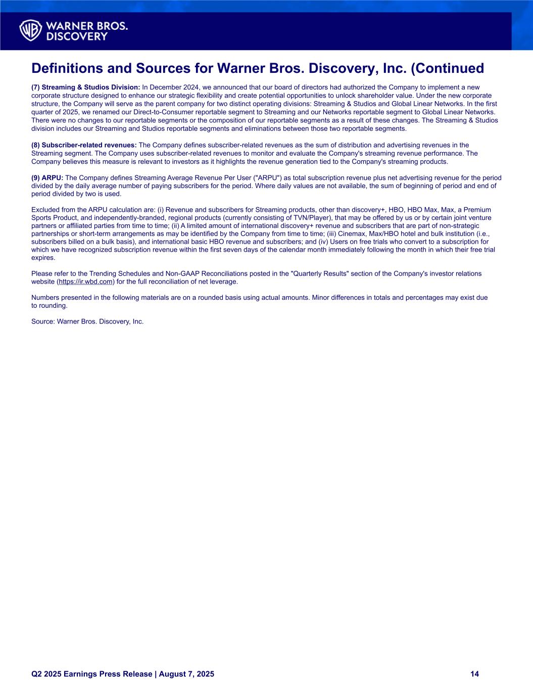 Definitions and Sources for Warner Bros. Discovery, Inc. (Continued (7) Streaming & Studios Division: In December 2024, we announced that our board of directors had authorized the Company to implement a new corporate structure designed to enhance our strategic flexibility and create potential opportunities to unlock shareholder value. Under the new corporate structure, the Company will serve as the parent company for two distinct operating divisions: Streaming & Studios and Global Linear Networks. In the first quarter of 2025, we renamed our Direct-to-Consumer reportable segment to Streaming and our Networks reportable segment to Global Linear Networks. There were no changes to our reportable segments or the composition of our reportable segments as a result of these changes. The Streaming & Studios division includes our Streaming and Studios reportable segments and eliminations between those two reportable segments. (8) Subscriber-related revenues: The Company defines subscriber-related revenues as the sum of distribution and advertising revenues in the Streaming segment. The Company uses subscriber-related revenues to monitor and evaluate the Company's streaming revenue performance. The Company believes this measure is relevant to investors as it highlights the revenue generation tied to the Company's streaming products. (9) ARPU: The Company defines Streaming Average Revenue Per User ("ARPU") as total subscription revenue plus net advertising revenue for the period divided by the daily average number of paying subscribers for the period. Where daily values are not available, the sum of beginning of period and end of period divided by two is used. Excluded from the ARPU calculation are: (i) Revenue and subscribers for Streaming products, other than discovery+, HBO, HBO Max, Max, a Premium Sports Product, and independently-branded, regional products (currently consisting of TVN/Player), that may be offered by us or by certain joint venture partners or affiliated parties from time to time; (ii) A limited amount of international discovery+ revenue and subscribers that are part of non-strategic partnerships or short-term arrangements as may be identified by the Company from time to time; (iii) Cinemax, Max/HBO hotel and bulk institution (i.e., subscribers billed on a bulk basis), and international basic HBO revenue and subscribers; and (iv) Users on free trials who convert to a subscription for which we have recognized subscription revenue within the first seven days of the calendar month immediately following the month in which their free trial expires. Please refer to the Trending Schedules and Non-GAAP Reconciliations posted in the "Quarterly Results" section of the Company's investor relations website (https://ir.wbd.com) for the full reconciliation of net leverage. Numbers presented in the following materials are on a rounded basis using actual amounts. Minor differences in totals and percentages may exist due to rounding. Source: Warner Bros. Discovery, Inc. Q2 2025 Earnings Press Release | August 7, 2025 14