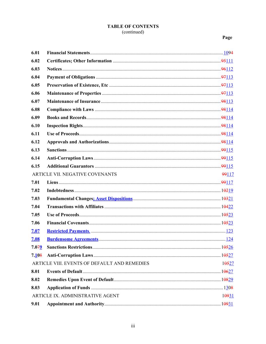TABLE OF CONTENTS (continued) Page iii 6.01 Financial Statements ............................................................................................................... 1094 6.02 Certificates; Other Information .......................................................................................... 95111 6.03 Notices .................................................................................................................................... 96112 6.04 Payment of Obligations ........................................................................................................ 97113 6.05 Preservation of Existence, Etc ............................................................................................. 97113 6.06 Maintenance of Properties ................................................................................................... 97113 6.07 Maintenance of Insurance .................................................................................................... 98113 6.08 Compliance with Laws ......................................................................................................... 98114 6.09 Books and Records ................................................................................................................ 98114 6.10 Inspection Rights ................................................................................................................... 98114 6.11 Use of Proceeds ...................................................................................................................... 98114 6.12 Approvals and Authorizations ............................................................................................. 98114 6.13 Sanctions ................................................................................................................................ 99115 6.14 Anti-Corruption Laws .......................................................................................................... 99115 6.15 Additional Guarantors ......................................................................................................... 99115 ARTICLE VII. NEGATIVE COVENANTS 99117 7.01 Liens ....................................................................................................................................... 99117 7.02 Indebtedness .......................................................................................................................... 10219 7.03 Fundamental Changes; Asset Dispositions ......................................................................... 10321 7.04 Transactions with Affiliates ................................................................................................. 10422 7.05 Use of Proceeds ...................................................................................................................... 10523 7.06 Financial Covenants.............................................................................................................. 10523 7.07 Restricted Payments. ................................................................................................................ 123 7.08 Burdensome Agreements .......................................................................................................... 124 7.079 Sanctions Restrictions ........................................................................................................... 10526 7.108 Anti-Corruption Laws .......................................................................................................... 10527 ARTICLE VIII. EVENTS OF DEFAULT AND REMEDIES 10527 8.01 Events of Default ................................................................................................................... 10627 8.02 Remedies Upon Event of Default ......................................................................................... 10829 8.03 Application of Funds .............................................................................................................. 1308 ARTICLE IX. ADMINISTRATIVE AGENT 10931 9.01 Appointment and Authority ................................................................................................. 10931