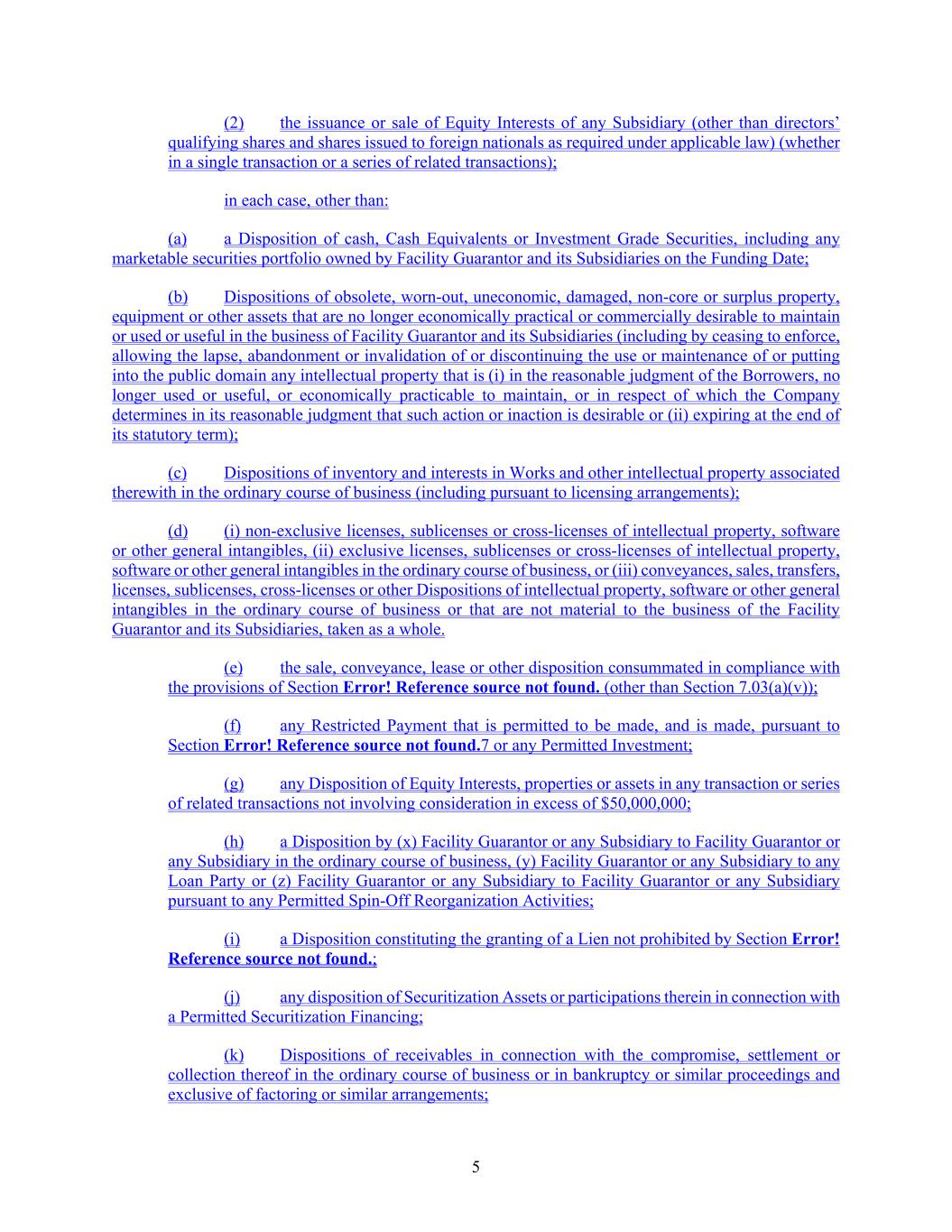 5 (2) the issuance or sale of Equity Interests of any Subsidiary (other than directors’ qualifying shares and shares issued to foreign nationals as required under applicable law) (whether in a single transaction or a series of related transactions); in each case, other than: (a) a Disposition of cash, Cash Equivalents or Investment Grade Securities, including any marketable securities portfolio owned by Facility Guarantor and its Subsidiaries on the Funding Date; (b) Dispositions of obsolete, worn-out, uneconomic, damaged, non-core or surplus property, equipment or other assets that are no longer economically practical or commercially desirable to maintain or used or useful in the business of Facility Guarantor and its Subsidiaries (including by ceasing to enforce, allowing the lapse, abandonment or invalidation of or discontinuing the use or maintenance of or putting into the public domain any intellectual property that is (i) in the reasonable judgment of the Borrowers, no longer used or useful, or economically practicable to maintain, or in respect of which the Company determines in its reasonable judgment that such action or inaction is desirable or (ii) expiring at the end of its statutory term); (c) Dispositions of inventory and interests in Works and other intellectual property associated therewith in the ordinary course of business (including pursuant to licensing arrangements); (d) (i) non-exclusive licenses, sublicenses or cross-licenses of intellectual property, software or other general intangibles, (ii) exclusive licenses, sublicenses or cross-licenses of intellectual property, software or other general intangibles in the ordinary course of business, or (iii) conveyances, sales, transfers, licenses, sublicenses, cross-licenses or other Dispositions of intellectual property, software or other general intangibles in the ordinary course of business or that are not material to the business of the Facility Guarantor and its Subsidiaries, taken as a whole. (e) the sale, conveyance, lease or other disposition consummated in compliance with the provisions of Section Error! Reference source not found. (other than Section 7.03(a)(v)); (f) any Restricted Payment that is permitted to be made, and is made, pursuant to Section Error! Reference source not found.7 or any Permitted Investment; (g) any Disposition of Equity Interests, properties or assets in any transaction or series of related transactions not involving consideration in excess of $50,000,000; (h) a Disposition by (x) Facility Guarantor or any Subsidiary to Facility Guarantor or any Subsidiary in the ordinary course of business, (y) Facility Guarantor or any Subsidiary to any Loan Party or (z) Facility Guarantor or any Subsidiary to Facility Guarantor or any Subsidiary pursuant to any Permitted Spin-Off Reorganization Activities; (i) a Disposition constituting the granting of a Lien not prohibited by Section Error! Reference source not found.; (j) any disposition of Securitization Assets or participations therein in connection with a Permitted Securitization Financing; (k) Dispositions of receivables in connection with the compromise, settlement or collection thereof in the ordinary course of business or in bankruptcy or similar proceedings and exclusive of factoring or similar arrangements;