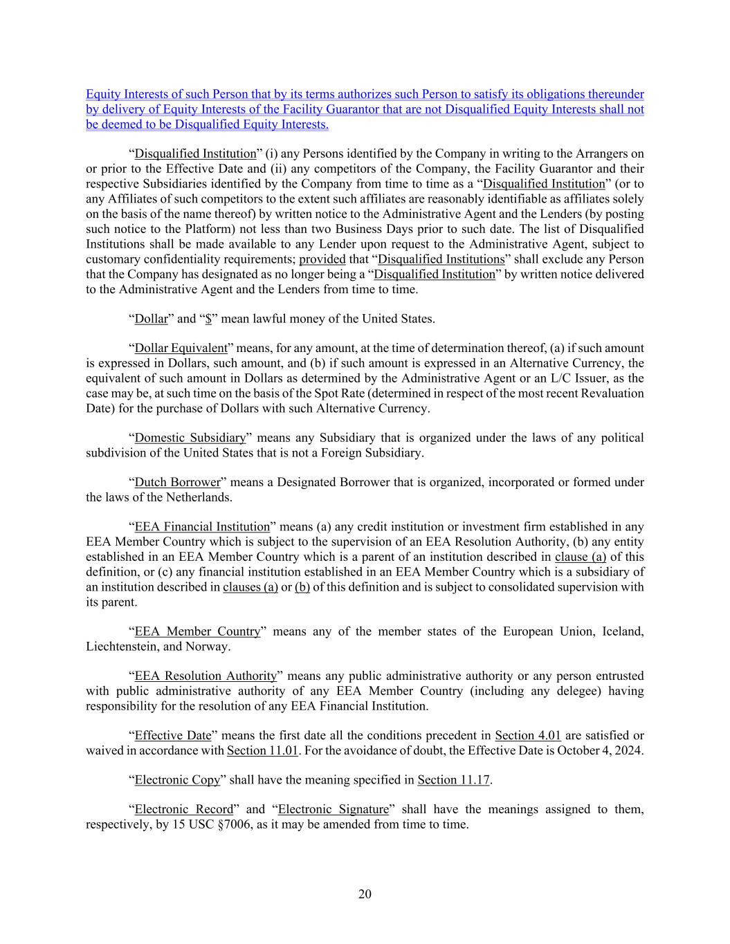 20 Equity Interests of such Person that by its terms authorizes such Person to satisfy its obligations thereunder by delivery of Equity Interests of the Facility Guarantor that are not Disqualified Equity Interests shall not be deemed to be Disqualified Equity Interests. “Disqualified Institution” (i) any Persons identified by the Company in writing to the Arrangers on or prior to the Effective Date and (ii) any competitors of the Company, the Facility Guarantor and their respective Subsidiaries identified by the Company from time to time as a “Disqualified Institution” (or to any Affiliates of such competitors to the extent such affiliates are reasonably identifiable as affiliates solely on the basis of the name thereof) by written notice to the Administrative Agent and the Lenders (by posting such notice to the Platform) not less than two Business Days prior to such date. The list of Disqualified Institutions shall be made available to any Lender upon request to the Administrative Agent, subject to customary confidentiality requirements; provided that “Disqualified Institutions” shall exclude any Person that the Company has designated as no longer being a “Disqualified Institution” by written notice delivered to the Administrative Agent and the Lenders from time to time. “Dollar” and “$” mean lawful money of the United States. “Dollar Equivalent” means, for any amount, at the time of determination thereof, (a) if such amount is expressed in Dollars, such amount, and (b) if such amount is expressed in an Alternative Currency, the equivalent of such amount in Dollars as determined by the Administrative Agent or an L/C Issuer, as the case may be, at such time on the basis of the Spot Rate (determined in respect of the most recent Revaluation Date) for the purchase of Dollars with such Alternative Currency. “Domestic Subsidiary” means any Subsidiary that is organized under the laws of any political subdivision of the United States that is not a Foreign Subsidiary. “Dutch Borrower” means a Designated Borrower that is organized, incorporated or formed under the laws of the Netherlands. “EEA Financial Institution” means (a) any credit institution or investment firm established in any EEA Member Country which is subject to the supervision of an EEA Resolution Authority, (b) any entity established in an EEA Member Country which is a parent of an institution described in clause (a) of this definition, or (c) any financial institution established in an EEA Member Country which is a subsidiary of an institution described in clauses (a) or (b) of this definition and is subject to consolidated supervision with its parent. “EEA Member Country” means any of the member states of the European Union, Iceland, Liechtenstein, and Norway. “EEA Resolution Authority” means any public administrative authority or any person entrusted with public administrative authority of any EEA Member Country (including any delegee) having responsibility for the resolution of any EEA Financial Institution. “Effective Date” means the first date all the conditions precedent in Section 4.01 are satisfied or waived in accordance with Section 11.01. For the avoidance of doubt, the Effective Date is October 4, 2024. “Electronic Copy” shall have the meaning specified in Section 11.17. “Electronic Record” and “Electronic Signature” shall have the meanings assigned to them, respectively, by 15 USC §7006, as it may be amended from time to time.