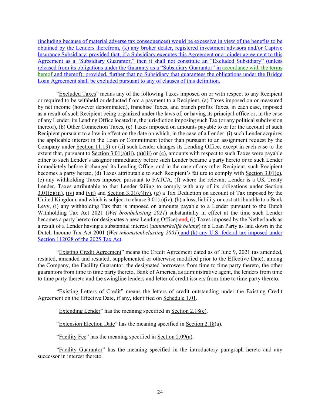 24 (including because of material adverse tax consequences) would be excessive in view of the benefits to be obtained by the Lenders therefrom, (k) any broker dealer, registered investment advisors and/or Captive Insurance Subsidiary; provided that, if a Subsidiary executes this Agreement or a joinder agreement to this Agreement as a “Subsidiary Guarantor,” then it shall not constitute an “Excluded Subsidiary” (unless released from its obligations under the Guaranty as a “Subsidiary Guarantor” in accordance with the terms hereof and thereof); provided, further that no Subsidiary that guarantees the obligations under the Bridge Loan Agreement shall be excluded pursuant to any of clauses of this definition. “Excluded Taxes” means any of the following Taxes imposed on or with respect to any Recipient or required to be withheld or deducted from a payment to a Recipient, (a) Taxes imposed on or measured by net income (however denominated), franchise Taxes, and branch profits Taxes, in each case, imposed as a result of such Recipient being organized under the laws of, or having its principal office or, in the case of any Lender, its Lending Office located in, the jurisdiction imposing such Tax (or any political subdivision thereof), (b) Other Connection Taxes, (c) Taxes imposed on amounts payable to or for the account of such Recipient pursuant to a law in effect on the date on which, in the case of a Lender, (i) such Lender acquires the applicable interest in the Loan or Commitment (other than pursuant to an assignment request by the Company under Section 11.13) or (ii) such Lender changes its Lending Office, except in each case to the extent that, pursuant to Section 3.01(a)(ii), (a)(iii) or (c), amounts with respect to such Taxes were payable either to such Lender’s assignor immediately before such Lender became a party hereto or to such Lender immediately before it changed its Lending Office, and in the case of any other Recipient, such Recipient becomes a party hereto, (d) Taxes attributable to such Recipient’s failure to comply with Section 3.01(e), (e) any withholding Taxes imposed pursuant to FATCA, (f) where the relevant Lender is a UK Treaty Lender, Taxes attributable to that Lender failing to comply with any of its obligations under Section 3.01(c)(iii), (iv) and (vii) and Section 3.01(e)(iv), (g) a Tax Deduction on account of Tax imposed by the United Kingdom, and which is subject to clause 3.01(a)(iv), (h) a loss, liability or cost attributable to a Bank Levy, (i) any withholding Tax that is imposed on amounts payable to a Lender pursuant to the Dutch Withholding Tax Act 2021 (Wet bronbelasting 2021) substantially in effect at the time such Lender becomes a party hereto (or designates a new Lending Office) and, (j) Taxes imposed by the Netherlands as a result of a Lender having a substantial interest (aanmerkelijk belang) in a Loan Party as laid down in the Dutch Income Tax Act 2001 (Wet inkomstenbelasting 2001) and (k) any U.S. federal tax imposed under Section 112028 of the 2025 Tax Act. “Existing Credit Agreement” means the Credit Agreement dated as of June 9, 2021 (as amended, restated, amended and restated, supplemented or otherwise modified prior to the Effective Date), among the Company, the Facility Guarantor, the designated borrowers from time to time party thereto, the other guarantors from time to time party thereto, Bank of America, as administrative agent, the lenders from time to time party thereto and the swingline lenders and letter of credit issuers from time to time party thereto. “Existing Letters of Credit” means the letters of credit outstanding under the Existing Credit Agreement on the Effective Date, if any, identified on Schedule 1.01. “Extending Lender” has the meaning specified in Section 2.18(e). “Extension Election Date” has the meaning specified in Section 2.18(a). “Facility Fee” has the meaning specified in Section 2.09(a). “Facility Guarantor” has the meaning specified in the introductory paragraph hereto and any successor in interest thereto.