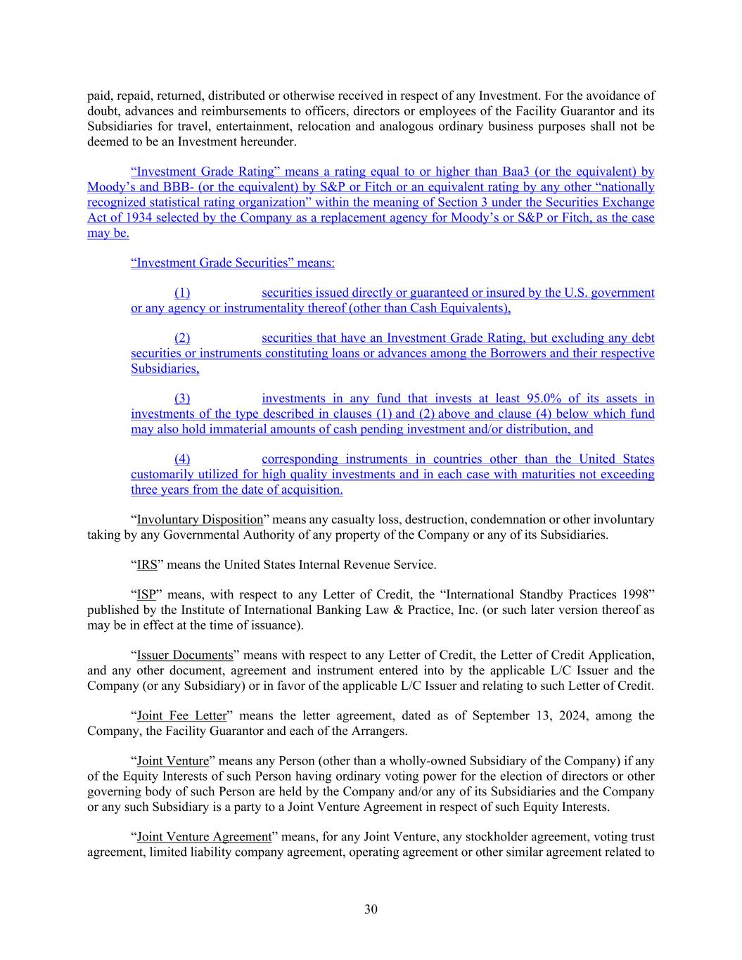 30 paid, repaid, returned, distributed or otherwise received in respect of any Investment. For the avoidance of doubt, advances and reimbursements to officers, directors or employees of the Facility Guarantor and its Subsidiaries for travel, entertainment, relocation and analogous ordinary business purposes shall not be deemed to be an Investment hereunder. “Investment Grade Rating” means a rating equal to or higher than Baa3 (or the equivalent) by Moody’s and BBB- (or the equivalent) by S&P or Fitch or an equivalent rating by any other “nationally recognized statistical rating organization” within the meaning of Section 3 under the Securities Exchange Act of 1934 selected by the Company as a replacement agency for Moody’s or S&P or Fitch, as the case may be. “Investment Grade Securities” means: (1) securities issued directly or guaranteed or insured by the U.S. government or any agency or instrumentality thereof (other than Cash Equivalents), (2) securities that have an Investment Grade Rating, but excluding any debt securities or instruments constituting loans or advances among the Borrowers and their respective Subsidiaries, (3) investments in any fund that invests at least 95.0% of its assets in investments of the type described in clauses (1) and (2) above and clause (4) below which fund may also hold immaterial amounts of cash pending investment and/or distribution, and (4) corresponding instruments in countries other than the United States customarily utilized for high quality investments and in each case with maturities not exceeding three years from the date of acquisition. “Involuntary Disposition” means any casualty loss, destruction, condemnation or other involuntary taking by any Governmental Authority of any property of the Company or any of its Subsidiaries. “IRS” means the United States Internal Revenue Service. “ISP” means, with respect to any Letter of Credit, the “International Standby Practices 1998” published by the Institute of International Banking Law & Practice, Inc. (or such later version thereof as may be in effect at the time of issuance). “Issuer Documents” means with respect to any Letter of Credit, the Letter of Credit Application, and any other document, agreement and instrument entered into by the applicable L/C Issuer and the Company (or any Subsidiary) or in favor of the applicable L/C Issuer and relating to such Letter of Credit. “Joint Fee Letter” means the letter agreement, dated as of September 13, 2024, among the Company, the Facility Guarantor and each of the Arrangers. “Joint Venture” means any Person (other than a wholly-owned Subsidiary of the Company) if any of the Equity Interests of such Person having ordinary voting power for the election of directors or other governing body of such Person are held by the Company and/or any of its Subsidiaries and the Company or any such Subsidiary is a party to a Joint Venture Agreement in respect of such Equity Interests. “Joint Venture Agreement” means, for any Joint Venture, any stockholder agreement, voting trust agreement, limited liability company agreement, operating agreement or other similar agreement related to