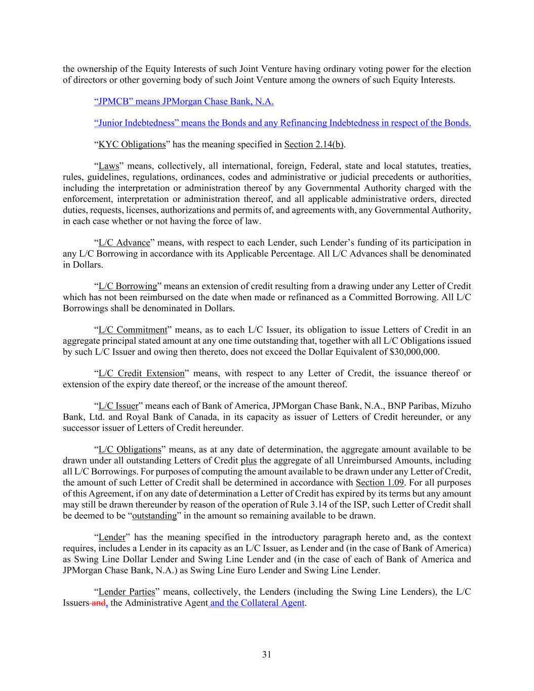 31 the ownership of the Equity Interests of such Joint Venture having ordinary voting power for the election of directors or other governing body of such Joint Venture among the owners of such Equity Interests. “JPMCB” means JPMorgan Chase Bank, N.A. “Junior Indebtedness” means the Bonds and any Refinancing Indebtedness in respect of the Bonds. “KYC Obligations” has the meaning specified in Section 2.14(b). “Laws” means, collectively, all international, foreign, Federal, state and local statutes, treaties, rules, guidelines, regulations, ordinances, codes and administrative or judicial precedents or authorities, including the interpretation or administration thereof by any Governmental Authority charged with the enforcement, interpretation or administration thereof, and all applicable administrative orders, directed duties, requests, licenses, authorizations and permits of, and agreements with, any Governmental Authority, in each case whether or not having the force of law. “L/C Advance” means, with respect to each Lender, such Lender’s funding of its participation in any L/C Borrowing in accordance with its Applicable Percentage. All L/C Advances shall be denominated in Dollars. “L/C Borrowing” means an extension of credit resulting from a drawing under any Letter of Credit which has not been reimbursed on the date when made or refinanced as a Committed Borrowing. All L/C Borrowings shall be denominated in Dollars. “L/C Commitment” means, as to each L/C Issuer, its obligation to issue Letters of Credit in an aggregate principal stated amount at any one time outstanding that, together with all L/C Obligations issued by such L/C Issuer and owing then thereto, does not exceed the Dollar Equivalent of $30,000,000. “L/C Credit Extension” means, with respect to any Letter of Credit, the issuance thereof or extension of the expiry date thereof, or the increase of the amount thereof. “L/C Issuer” means each of Bank of America, JPMorgan Chase Bank, N.A., BNP Paribas, Mizuho Bank, Ltd. and Royal Bank of Canada, in its capacity as issuer of Letters of Credit hereunder, or any successor issuer of Letters of Credit hereunder. “L/C Obligations” means, as at any date of determination, the aggregate amount available to be drawn under all outstanding Letters of Credit plus the aggregate of all Unreimbursed Amounts, including all L/C Borrowings. For purposes of computing the amount available to be drawn under any Letter of Credit, the amount of such Letter of Credit shall be determined in accordance with Section 1.09. For all purposes of this Agreement, if on any date of determination a Letter of Credit has expired by its terms but any amount may still be drawn thereunder by reason of the operation of Rule 3.14 of the ISP, such Letter of Credit shall be deemed to be “outstanding” in the amount so remaining available to be drawn. “Lender” has the meaning specified in the introductory paragraph hereto and, as the context requires, includes a Lender in its capacity as an L/C Issuer, as Lender and (in the case of Bank of America) as Swing Line Dollar Lender and Swing Line Lender and (in the case of each of Bank of America and JPMorgan Chase Bank, N.A.) as Swing Line Euro Lender and Swing Line Lender. “Lender Parties” means, collectively, the Lenders (including the Swing Line Lenders), the L/C Issuers and, the Administrative Agent and the Collateral Agent.