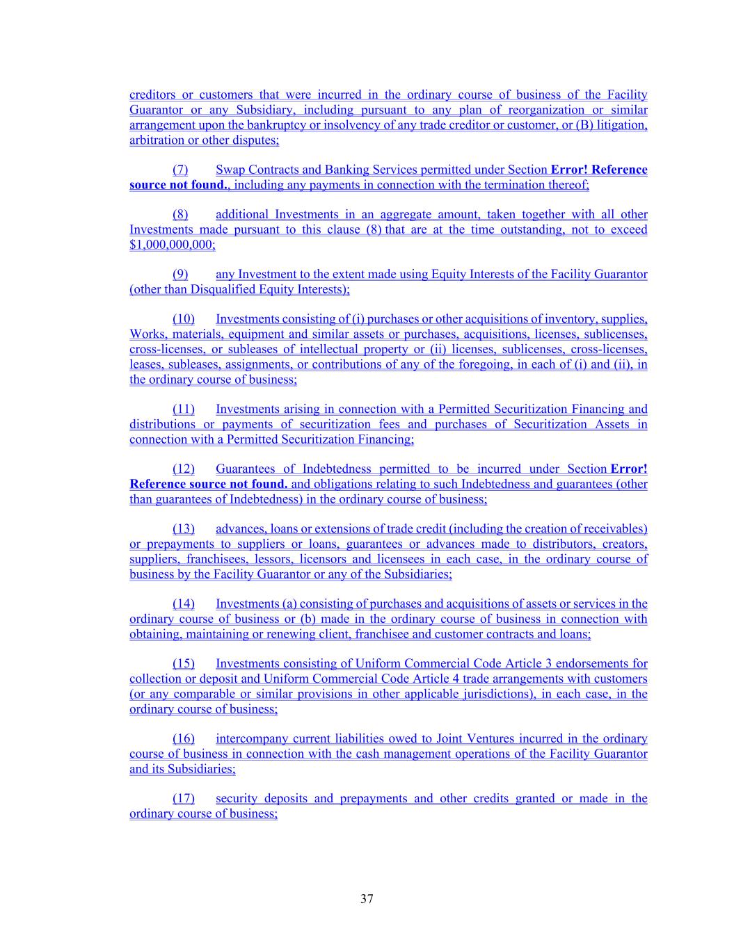 37 creditors or customers that were incurred in the ordinary course of business of the Facility Guarantor or any Subsidiary, including pursuant to any plan of reorganization or similar arrangement upon the bankruptcy or insolvency of any trade creditor or customer, or (B) litigation, arbitration or other disputes; (7) Swap Contracts and Banking Services permitted under Section Error! Reference source not found., including any payments in connection with the termination thereof; (8) additional Investments in an aggregate amount, taken together with all other Investments made pursuant to this clause (8) that are at the time outstanding, not to exceed $1,000,000,000; (9) any Investment to the extent made using Equity Interests of the Facility Guarantor (other than Disqualified Equity Interests); (10) Investments consisting of (i) purchases or other acquisitions of inventory, supplies, Works, materials, equipment and similar assets or purchases, acquisitions, licenses, sublicenses, cross-licenses, or subleases of intellectual property or (ii) licenses, sublicenses, cross-licenses, leases, subleases, assignments, or contributions of any of the foregoing, in each of (i) and (ii), in the ordinary course of business; (11) Investments arising in connection with a Permitted Securitization Financing and distributions or payments of securitization fees and purchases of Securitization Assets in connection with a Permitted Securitization Financing; (12) Guarantees of Indebtedness permitted to be incurred under Section Error! Reference source not found. and obligations relating to such Indebtedness and guarantees (other than guarantees of Indebtedness) in the ordinary course of business; (13) advances, loans or extensions of trade credit (including the creation of receivables) or prepayments to suppliers or loans, guarantees or advances made to distributors, creators, suppliers, franchisees, lessors, licensors and licensees in each case, in the ordinary course of business by the Facility Guarantor or any of the Subsidiaries; (14) Investments (a) consisting of purchases and acquisitions of assets or services in the ordinary course of business or (b) made in the ordinary course of business in connection with obtaining, maintaining or renewing client, franchisee and customer contracts and loans; (15) Investments consisting of Uniform Commercial Code Article 3 endorsements for collection or deposit and Uniform Commercial Code Article 4 trade arrangements with customers (or any comparable or similar provisions in other applicable jurisdictions), in each case, in the ordinary course of business; (16) intercompany current liabilities owed to Joint Ventures incurred in the ordinary course of business in connection with the cash management operations of the Facility Guarantor and its Subsidiaries; (17) security deposits and prepayments and other credits granted or made in the ordinary course of business;