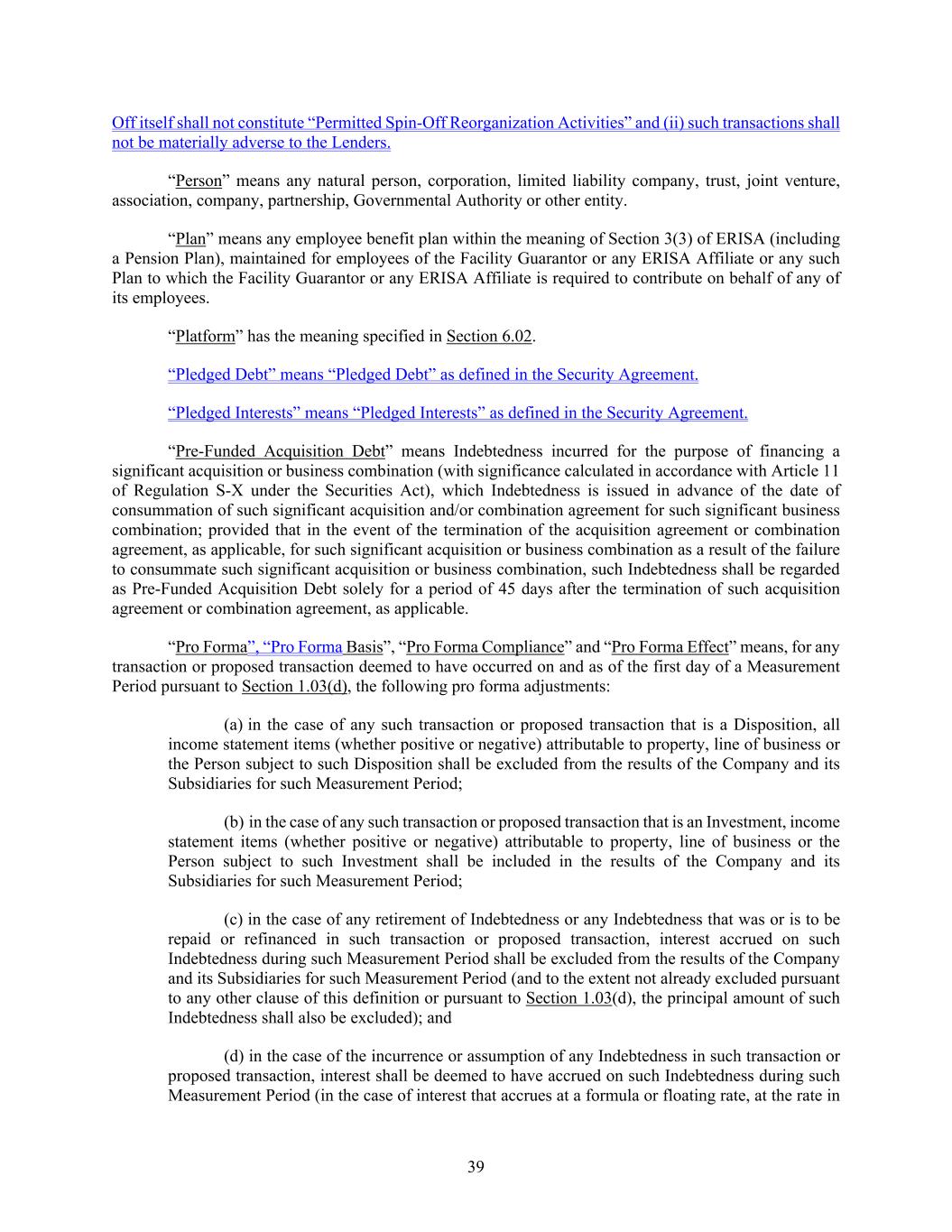 39 Off itself shall not constitute “Permitted Spin-Off Reorganization Activities” and (ii) such transactions shall not be materially adverse to the Lenders. “Person” means any natural person, corporation, limited liability company, trust, joint venture, association, company, partnership, Governmental Authority or other entity. “Plan” means any employee benefit plan within the meaning of Section 3(3) of ERISA (including a Pension Plan), maintained for employees of the Facility Guarantor or any ERISA Affiliate or any such Plan to which the Facility Guarantor or any ERISA Affiliate is required to contribute on behalf of any of its employees. “Platform” has the meaning specified in Section 6.02. “Pledged Debt” means “Pledged Debt” as defined in the Security Agreement. “Pledged Interests” means “Pledged Interests” as defined in the Security Agreement. “Pre-Funded Acquisition Debt” means Indebtedness incurred for the purpose of financing a significant acquisition or business combination (with significance calculated in accordance with Article 11 of Regulation S-X under the Securities Act), which Indebtedness is issued in advance of the date of consummation of such significant acquisition and/or combination agreement for such significant business combination; provided that in the event of the termination of the acquisition agreement or combination agreement, as applicable, for such significant acquisition or business combination as a result of the failure to consummate such significant acquisition or business combination, such Indebtedness shall be regarded as Pre-Funded Acquisition Debt solely for a period of 45 days after the termination of such acquisition agreement or combination agreement, as applicable. “Pro Forma”, “Pro Forma Basis”, “Pro Forma Compliance” and “Pro Forma Effect” means, for any transaction or proposed transaction deemed to have occurred on and as of the first day of a Measurement Period pursuant to Section 1.03(d), the following pro forma adjustments: (a) in the case of any such transaction or proposed transaction that is a Disposition, all income statement items (whether positive or negative) attributable to property, line of business or the Person subject to such Disposition shall be excluded from the results of the Company and its Subsidiaries for such Measurement Period; (b) in the case of any such transaction or proposed transaction that is an Investment, income statement items (whether positive or negative) attributable to property, line of business or the Person subject to such Investment shall be included in the results of the Company and its Subsidiaries for such Measurement Period; (c) in the case of any retirement of Indebtedness or any Indebtedness that was or is to be repaid or refinanced in such transaction or proposed transaction, interest accrued on such Indebtedness during such Measurement Period shall be excluded from the results of the Company and its Subsidiaries for such Measurement Period (and to the extent not already excluded pursuant to any other clause of this definition or pursuant to Section 1.03(d), the principal amount of such Indebtedness shall also be excluded); and (d) in the case of the incurrence or assumption of any Indebtedness in such transaction or proposed transaction, interest shall be deemed to have accrued on such Indebtedness during such Measurement Period (in the case of interest that accrues at a formula or floating rate, at the rate in