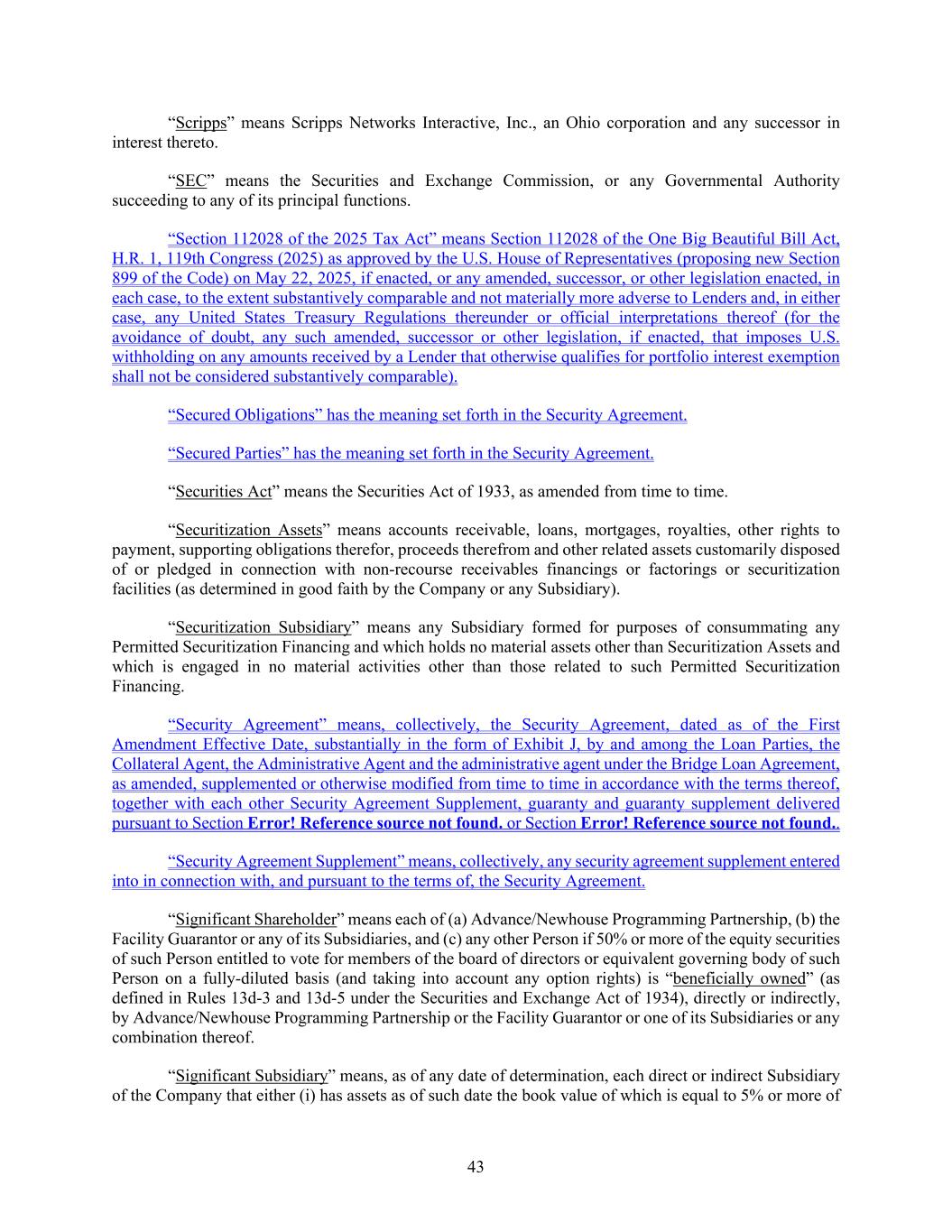 43 “Scripps” means Scripps Networks Interactive, Inc., an Ohio corporation and any successor in interest thereto. “SEC” means the Securities and Exchange Commission, or any Governmental Authority succeeding to any of its principal functions. “Section 112028 of the 2025 Tax Act” means Section 112028 of the One Big Beautiful Bill Act, H.R. 1, 119th Congress (2025) as approved by the U.S. House of Representatives (proposing new Section 899 of the Code) on May 22, 2025, if enacted, or any amended, successor, or other legislation enacted, in each case, to the extent substantively comparable and not materially more adverse to Lenders and, in either case, any United States Treasury Regulations thereunder or official interpretations thereof (for the avoidance of doubt, any such amended, successor or other legislation, if enacted, that imposes U.S. withholding on any amounts received by a Lender that otherwise qualifies for portfolio interest exemption shall not be considered substantively comparable). “Secured Obligations” has the meaning set forth in the Security Agreement. “Secured Parties” has the meaning set forth in the Security Agreement. “Securities Act” means the Securities Act of 1933, as amended from time to time. “Securitization Assets” means accounts receivable, loans, mortgages, royalties, other rights to payment, supporting obligations therefor, proceeds therefrom and other related assets customarily disposed of or pledged in connection with non-recourse receivables financings or factorings or securitization facilities (as determined in good faith by the Company or any Subsidiary). “Securitization Subsidiary” means any Subsidiary formed for purposes of consummating any Permitted Securitization Financing and which holds no material assets other than Securitization Assets and which is engaged in no material activities other than those related to such Permitted Securitization Financing. “Security Agreement” means, collectively, the Security Agreement, dated as of the First Amendment Effective Date, substantially in the form of Exhibit J, by and among the Loan Parties, the Collateral Agent, the Administrative Agent and the administrative agent under the Bridge Loan Agreement, as amended, supplemented or otherwise modified from time to time in accordance with the terms thereof, together with each other Security Agreement Supplement, guaranty and guaranty supplement delivered pursuant to Section Error! Reference source not found. or Section Error! Reference source not found.. “Security Agreement Supplement” means, collectively, any security agreement supplement entered into in connection with, and pursuant to the terms of, the Security Agreement. “Significant Shareholder” means each of (a) Advance/Newhouse Programming Partnership, (b) the Facility Guarantor or any of its Subsidiaries, and (c) any other Person if 50% or more of the equity securities of such Person entitled to vote for members of the board of directors or equivalent governing body of such Person on a fully-diluted basis (and taking into account any option rights) is “beneficially owned” (as defined in Rules 13d-3 and 13d-5 under the Securities and Exchange Act of 1934), directly or indirectly, by Advance/Newhouse Programming Partnership or the Facility Guarantor or one of its Subsidiaries or any combination thereof. “Significant Subsidiary” means, as of any date of determination, each direct or indirect Subsidiary of the Company that either (i) has assets as of such date the book value of which is equal to 5% or more of