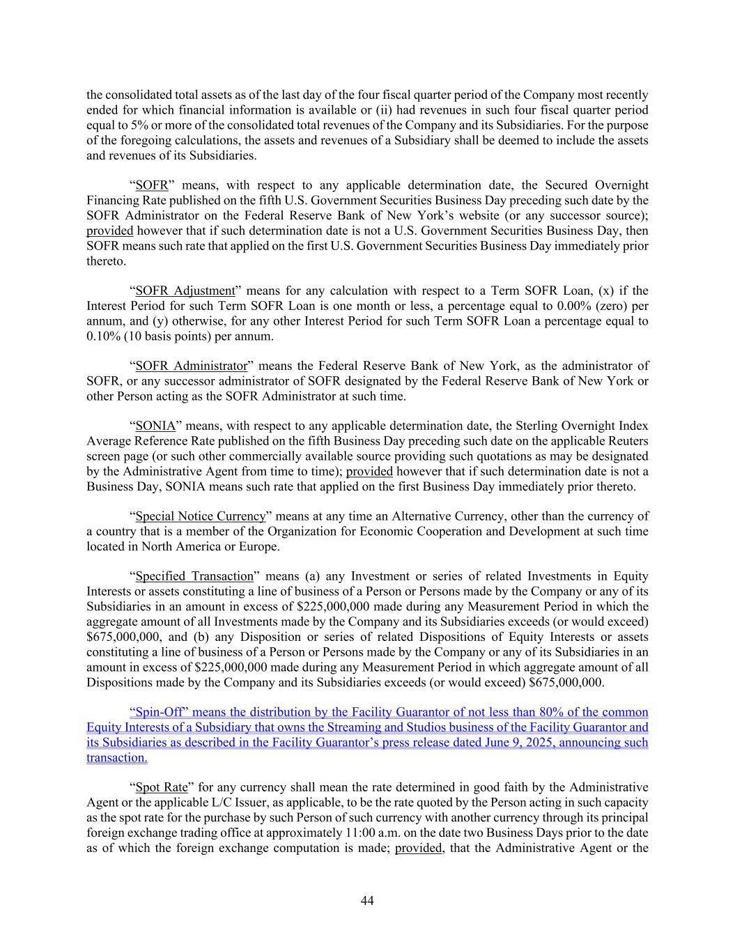 44 the consolidated total assets as of the last day of the four fiscal quarter period of the Company most recently ended for which financial information is available or (ii) had revenues in such four fiscal quarter period equal to 5% or more of the consolidated total revenues of the Company and its Subsidiaries. For the purpose of the foregoing calculations, the assets and revenues of a Subsidiary shall be deemed to include the assets and revenues of its Subsidiaries. “SOFR” means, with respect to any applicable determination date, the Secured Overnight Financing Rate published on the fifth U.S. Government Securities Business Day preceding such date by the SOFR Administrator on the Federal Reserve Bank of New York’s website (or any successor source); provided however that if such determination date is not a U.S. Government Securities Business Day, then SOFR means such rate that applied on the first U.S. Government Securities Business Day immediately prior thereto. “SOFR Adjustment” means for any calculation with respect to a Term SOFR Loan, (x) if the Interest Period for such Term SOFR Loan is one month or less, a percentage equal to 0.00% (zero) per annum, and (y) otherwise, for any other Interest Period for such Term SOFR Loan a percentage equal to 0.10% (10 basis points) per annum. “SOFR Administrator” means the Federal Reserve Bank of New York, as the administrator of SOFR, or any successor administrator of SOFR designated by the Federal Reserve Bank of New York or other Person acting as the SOFR Administrator at such time. “SONIA” means, with respect to any applicable determination date, the Sterling Overnight Index Average Reference Rate published on the fifth Business Day preceding such date on the applicable Reuters screen page (or such other commercially available source providing such quotations as may be designated by the Administrative Agent from time to time); provided however that if such determination date is not a Business Day, SONIA means such rate that applied on the first Business Day immediately prior thereto. “Special Notice Currency” means at any time an Alternative Currency, other than the currency of a country that is a member of the Organization for Economic Cooperation and Development at such time located in North America or Europe. “Specified Transaction” means (a) any Investment or series of related Investments in Equity Interests or assets constituting a line of business of a Person or Persons made by the Company or any of its Subsidiaries in an amount in excess of $225,000,000 made during any Measurement Period in which the aggregate amount of all Investments made by the Company and its Subsidiaries exceeds (or would exceed) $675,000,000, and (b) any Disposition or series of related Dispositions of Equity Interests or assets constituting a line of business of a Person or Persons made by the Company or any of its Subsidiaries in an amount in excess of $225,000,000 made during any Measurement Period in which aggregate amount of all Dispositions made by the Company and its Subsidiaries exceeds (or would exceed) $675,000,000. “Spin-Off” means the distribution by the Facility Guarantor of not less than 80% of the common Equity Interests of a Subsidiary that owns the Streaming and Studios business of the Facility Guarantor and its Subsidiaries as described in the Facility Guarantor’s press release dated June 9, 2025, announcing such transaction. “Spot Rate” for any currency shall mean the rate determined in good faith by the Administrative Agent or the applicable L/C Issuer, as applicable, to be the rate quoted by the Person acting in such capacity as the spot rate for the purchase by such Person of such currency with another currency through its principal foreign exchange trading office at approximately 11:00 a.m. on the date two Business Days prior to the date as of which the foreign exchange computation is made; provided, that the Administrative Agent or the