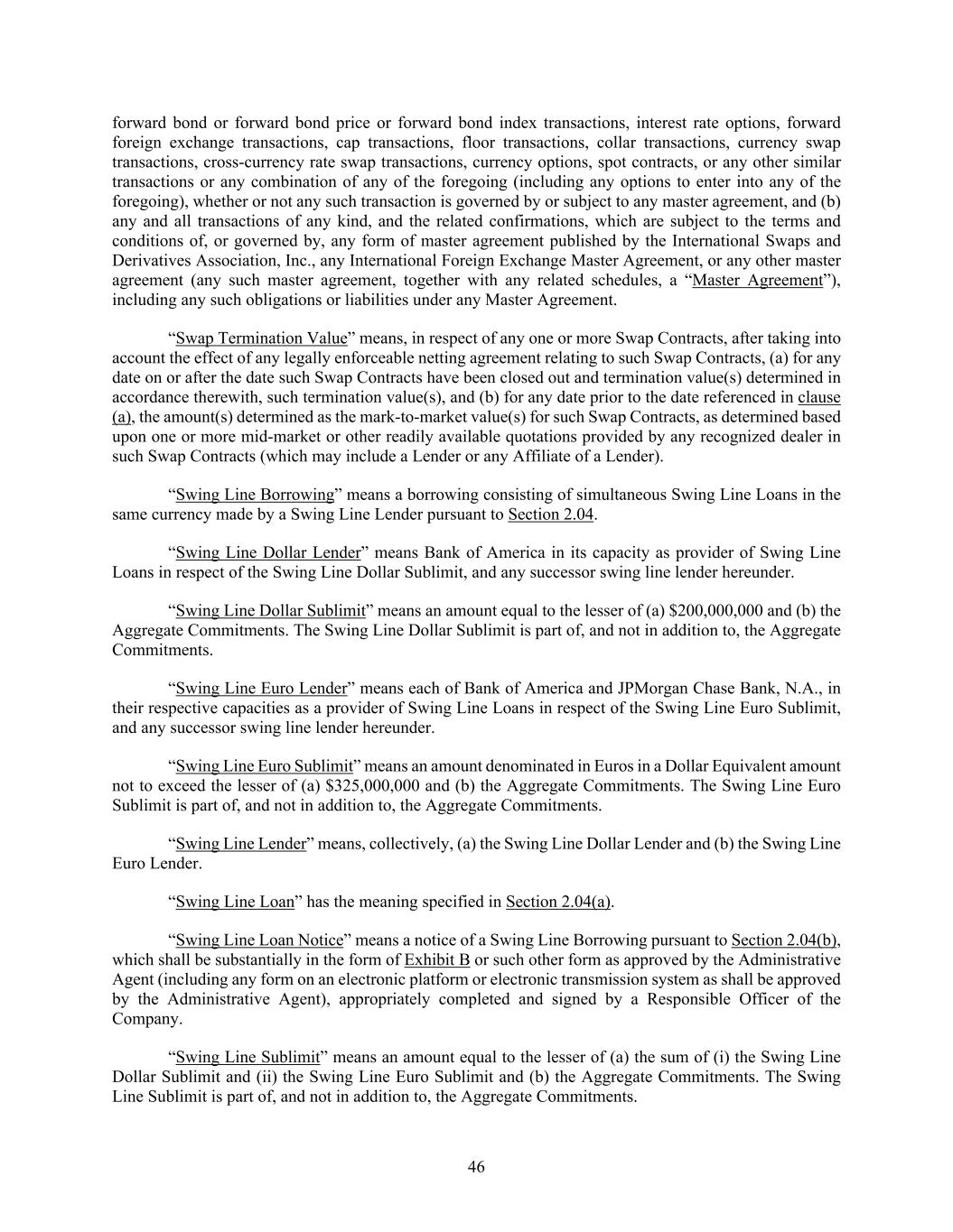 46 forward bond or forward bond price or forward bond index transactions, interest rate options, forward foreign exchange transactions, cap transactions, floor transactions, collar transactions, currency swap transactions, cross-currency rate swap transactions, currency options, spot contracts, or any other similar transactions or any combination of any of the foregoing (including any options to enter into any of the foregoing), whether or not any such transaction is governed by or subject to any master agreement, and (b) any and all transactions of any kind, and the related confirmations, which are subject to the terms and conditions of, or governed by, any form of master agreement published by the International Swaps and Derivatives Association, Inc., any International Foreign Exchange Master Agreement, or any other master agreement (any such master agreement, together with any related schedules, a “Master Agreement”), including any such obligations or liabilities under any Master Agreement. “Swap Termination Value” means, in respect of any one or more Swap Contracts, after taking into account the effect of any legally enforceable netting agreement relating to such Swap Contracts, (a) for any date on or after the date such Swap Contracts have been closed out and termination value(s) determined in accordance therewith, such termination value(s), and (b) for any date prior to the date referenced in clause (a), the amount(s) determined as the mark-to-market value(s) for such Swap Contracts, as determined based upon one or more mid-market or other readily available quotations provided by any recognized dealer in such Swap Contracts (which may include a Lender or any Affiliate of a Lender). “Swing Line Borrowing” means a borrowing consisting of simultaneous Swing Line Loans in the same currency made by a Swing Line Lender pursuant to Section 2.04. “Swing Line Dollar Lender” means Bank of America in its capacity as provider of Swing Line Loans in respect of the Swing Line Dollar Sublimit, and any successor swing line lender hereunder. “Swing Line Dollar Sublimit” means an amount equal to the lesser of (a) $200,000,000 and (b) the Aggregate Commitments. The Swing Line Dollar Sublimit is part of, and not in addition to, the Aggregate Commitments. “Swing Line Euro Lender” means each of Bank of America and JPMorgan Chase Bank, N.A., in their respective capacities as a provider of Swing Line Loans in respect of the Swing Line Euro Sublimit, and any successor swing line lender hereunder. “Swing Line Euro Sublimit” means an amount denominated in Euros in a Dollar Equivalent amount not to exceed the lesser of (a) $325,000,000 and (b) the Aggregate Commitments. The Swing Line Euro Sublimit is part of, and not in addition to, the Aggregate Commitments. “Swing Line Lender” means, collectively, (a) the Swing Line Dollar Lender and (b) the Swing Line Euro Lender. “Swing Line Loan” has the meaning specified in Section 2.04(a). “Swing Line Loan Notice” means a notice of a Swing Line Borrowing pursuant to Section 2.04(b), which shall be substantially in the form of Exhibit B or such other form as approved by the Administrative Agent (including any form on an electronic platform or electronic transmission system as shall be approved by the Administrative Agent), appropriately completed and signed by a Responsible Officer of the Company. “Swing Line Sublimit” means an amount equal to the lesser of (a) the sum of (i) the Swing Line Dollar Sublimit and (ii) the Swing Line Euro Sublimit and (b) the Aggregate Commitments. The Swing Line Sublimit is part of, and not in addition to, the Aggregate Commitments.