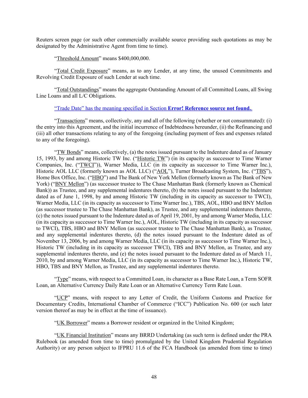 48 Reuters screen page (or such other commercially available source providing such quotations as may be designated by the Administrative Agent from time to time). “Threshold Amount” means $400,000,000. “Total Credit Exposure” means, as to any Lender, at any time, the unused Commitments and Revolving Credit Exposure of such Lender at such time. “Total Outstandings” means the aggregate Outstanding Amount of all Committed Loans, all Swing Line Loans and all L/C Obligations. “Trade Date” has the meaning specified in Section Error! Reference source not found.. “Transactions” means, collectively, any and all of the following (whether or not consummated): (i) the entry into this Agreement, and the initial incurrence of Indebtedness hereunder, (ii) the Refinancing and (iii) all other transactions relating to any of the foregoing (including payment of fees and expenses related to any of the foregoing). “TW Bonds” means, collectively, (a) the notes issued pursuant to the Indenture dated as of January 15, 1993, by and among Historic TW Inc. (“Historic TW”) (in its capacity as successor to Time Warner Companies, Inc. (“TWCI”)), Warner Media, LLC (in its capacity as successor to Time Warner Inc.), Historic AOL LLC (formerly known as AOL LLC) (“AOL”), Turner Broadcasting System, Inc. (“TBS”), Home Box Office, Inc. (“HBO”) and The Bank of New York Mellon (formerly known as The Bank of New York) (“BNY Mellon”) (as successor trustee to The Chase Manhattan Bank (formerly known as Chemical Bank)) as Trustee, and any supplemental indentures thereto, (b) the notes issued pursuant to the Indenture dated as of June 1, 1998, by and among Historic TW (including in its capacity as successor to TWCI), Warner Media, LLC (in its capacity as successor to Time Warner Inc.), TBS, AOL, HBO and BNY Mellon (as successor trustee to The Chase Manhattan Bank), as Trustee, and any supplemental indentures thereto, (c) the notes issued pursuant to the Indenture dated as of April 19, 2001, by and among Warner Media, LLC (in its capacity as successor to Time Warner Inc.), AOL, Historic TW (including in its capacity as successor to TWCI), TBS, HBO and BNY Mellon (as successor trustee to The Chase Manhattan Bank), as Trustee, and any supplemental indentures thereto, (d) the notes issued pursuant to the Indenture dated as of November 13, 2006, by and among Warner Media, LLC (in its capacity as successor to Time Warner Inc.), Historic TW (including in its capacity as successor TWCI), TBS and BNY Mellon, as Trustee, and any supplemental indentures thereto, and (e) the notes issued pursuant to the Indenture dated as of March 11, 2010, by and among Warner Media, LLC (in its capacity as successor to Time Warner Inc.), Historic TW, HBO, TBS and BNY Mellon, as Trustee, and any supplemental indentures thereto. “Type” means, with respect to a Committed Loan, its character as a Base Rate Loan, a Term SOFR Loan, an Alternative Currency Daily Rate Loan or an Alternative Currency Term Rate Loan. “UCP” means, with respect to any Letter of Credit, the Uniform Customs and Practice for Documentary Credits, International Chamber of Commerce (“ICC”) Publication No. 600 (or such later version thereof as may be in effect at the time of issuance). “UK Borrower” means a Borrower resident or organized in the United Kingdom; “UK Financial Institution” means any BRRD Undertaking (as such term is defined under the PRA Rulebook (as amended from time to time) promulgated by the United Kingdom Prudential Regulation Authority) or any person subject to IFPRU 11.6 of the FCA Handbook (as amended from time to time)