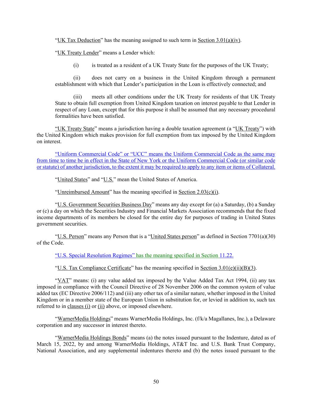 50 “UK Tax Deduction” has the meaning assigned to such term in Section 3.01(a)(iv). “UK Treaty Lender” means a Lender which: (i) is treated as a resident of a UK Treaty State for the purposes of the UK Treaty; (ii) does not carry on a business in the United Kingdom through a permanent establishment with which that Lender’s participation in the Loan is effectively connected; and (iii) meets all other conditions under the UK Treaty for residents of that UK Treaty State to obtain full exemption from United Kingdom taxation on interest payable to that Lender in respect of any Loan, except that for this purpose it shall be assumed that any necessary procedural formalities have been satisfied. “UK Treaty State” means a jurisdiction having a double taxation agreement (a “UK Treaty”) with the United Kingdom which makes provision for full exemption from tax imposed by the United Kingdom on interest. “Uniform Commercial Code” or “UCC” means the Uniform Commercial Code as the same may from time to time be in effect in the State of New York or the Uniform Commercial Code (or similar code or statute) of another jurisdiction, to the extent it may be required to apply to any item or items of Collateral. “United States” and “U.S.” mean the United States of America. “Unreimbursed Amount” has the meaning specified in Section 2.03(c)(i). “U.S. Government Securities Business Day” means any day except for (a) a Saturday, (b) a Sunday or (c) a day on which the Securities Industry and Financial Markets Association recommends that the fixed income departments of its members be closed for the entire day for purposes of trading in United States government securities. “U.S. Person” means any Person that is a “United States person” as defined in Section 7701(a)(30) of the Code. “U.S. Special Resolution Regimes” has the meaning specified in Section 11.22. “U.S. Tax Compliance Certificate” has the meaning specified in Section 3.01(e)(ii)(B)(3). “VAT” means: (i) any value added tax imposed by the Value Added Tax Act 1994, (ii) any tax imposed in compliance with the Council Directive of 28 November 2006 on the common system of value added tax (EC Directive 2006/112) and (iii) any other tax of a similar nature, whether imposed in the United Kingdom or in a member state of the European Union in substitution for, or levied in addition to, such tax referred to in clauses (i) or (ii) above, or imposed elsewhere. “WarnerMedia Holdings” means WarnerMedia Holdings, Inc. (f/k/a Magallanes, Inc.), a Delaware corporation and any successor in interest thereto. “WarnerMedia Holdings Bonds” means (a) the notes issued pursuant to the Indenture, dated as of March 15, 2022, by and among WarnerMedia Holdings, AT&T Inc. and U.S. Bank Trust Company, National Association, and any supplemental indentures thereto and (b) the notes issued pursuant to the