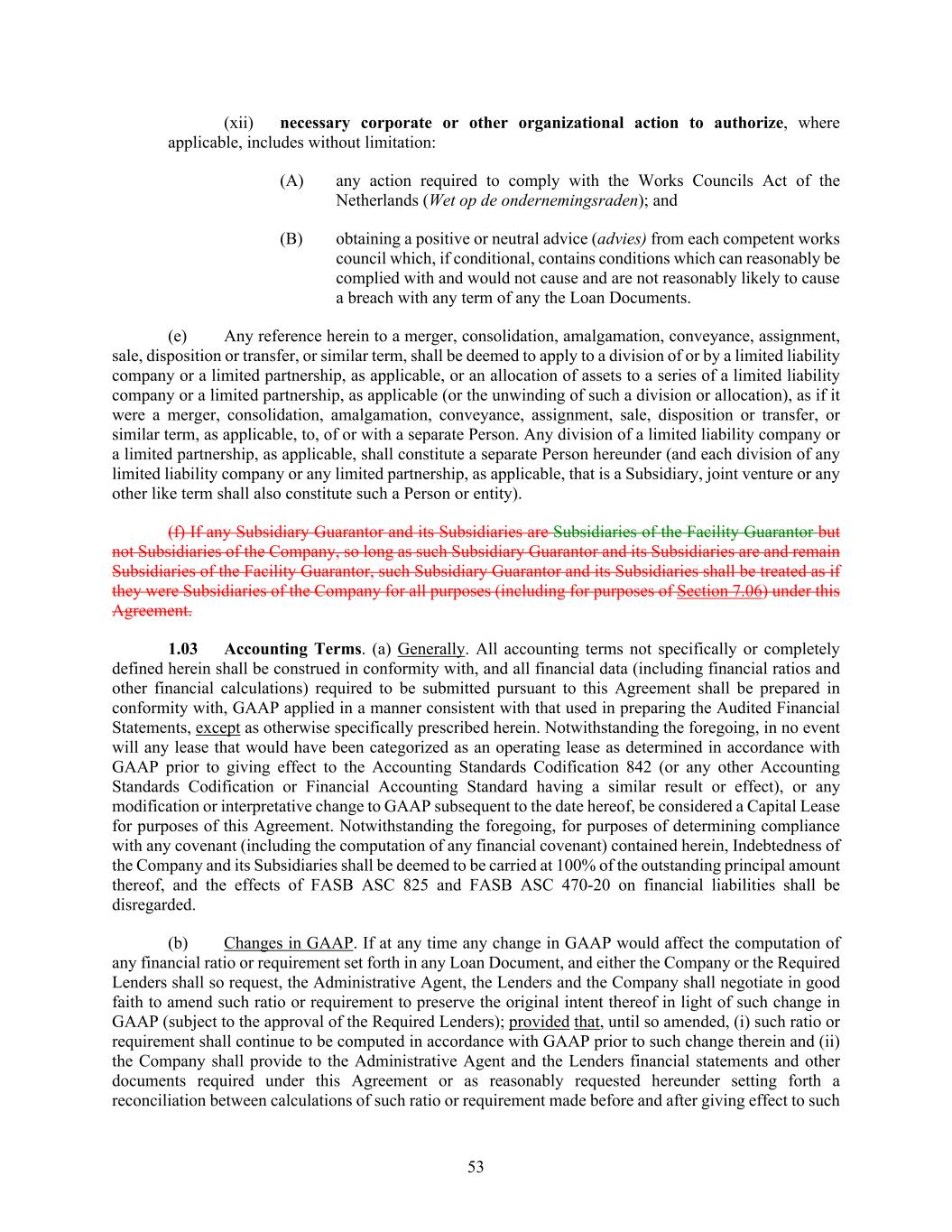53 (xii) necessary corporate or other organizational action to authorize, where applicable, includes without limitation: (A) any action required to comply with the Works Councils Act of the Netherlands (Wet op de ondernemingsraden); and (B) obtaining a positive or neutral advice (advies) from each competent works council which, if conditional, contains conditions which can reasonably be complied with and would not cause and are not reasonably likely to cause a breach with any term of any the Loan Documents. (e) Any reference herein to a merger, consolidation, amalgamation, conveyance, assignment, sale, disposition or transfer, or similar term, shall be deemed to apply to a division of or by a limited liability company or a limited partnership, as applicable, or an allocation of assets to a series of a limited liability company or a limited partnership, as applicable (or the unwinding of such a division or allocation), as if it were a merger, consolidation, amalgamation, conveyance, assignment, sale, disposition or transfer, or similar term, as applicable, to, of or with a separate Person. Any division of a limited liability company or a limited partnership, as applicable, shall constitute a separate Person hereunder (and each division of any limited liability company or any limited partnership, as applicable, that is a Subsidiary, joint venture or any other like term shall also constitute such a Person or entity). (f) If any Subsidiary Guarantor and its Subsidiaries are Subsidiaries of the Facility Guarantor but not Subsidiaries of the Company, so long as such Subsidiary Guarantor and its Subsidiaries are and remain Subsidiaries of the Facility Guarantor, such Subsidiary Guarantor and its Subsidiaries shall be treated as if they were Subsidiaries of the Company for all purposes (including for purposes of Section 7.06) under this Agreement. 1.03 Accounting Terms. (a) Generally. All accounting terms not specifically or completely defined herein shall be construed in conformity with, and all financial data (including financial ratios and other financial calculations) required to be submitted pursuant to this Agreement shall be prepared in conformity with, GAAP applied in a manner consistent with that used in preparing the Audited Financial Statements, except as otherwise specifically prescribed herein. Notwithstanding the foregoing, in no event will any lease that would have been categorized as an operating lease as determined in accordance with GAAP prior to giving effect to the Accounting Standards Codification 842 (or any other Accounting Standards Codification or Financial Accounting Standard having a similar result or effect), or any modification or interpretative change to GAAP subsequent to the date hereof, be considered a Capital Lease for purposes of this Agreement. Notwithstanding the foregoing, for purposes of determining compliance with any covenant (including the computation of any financial covenant) contained herein, Indebtedness of the Company and its Subsidiaries shall be deemed to be carried at 100% of the outstanding principal amount thereof, and the effects of FASB ASC 825 and FASB ASC 470-20 on financial liabilities shall be disregarded. (b) Changes in GAAP. If at any time any change in GAAP would affect the computation of any financial ratio or requirement set forth in any Loan Document, and either the Company or the Required Lenders shall so request, the Administrative Agent, the Lenders and the Company shall negotiate in good faith to amend such ratio or requirement to preserve the original intent thereof in light of such change in GAAP (subject to the approval of the Required Lenders); provided that, until so amended, (i) such ratio or requirement shall continue to be computed in accordance with GAAP prior to such change therein and (ii) the Company shall provide to the Administrative Agent and the Lenders financial statements and other documents required under this Agreement or as reasonably requested hereunder setting forth a reconciliation between calculations of such ratio or requirement made before and after giving effect to such