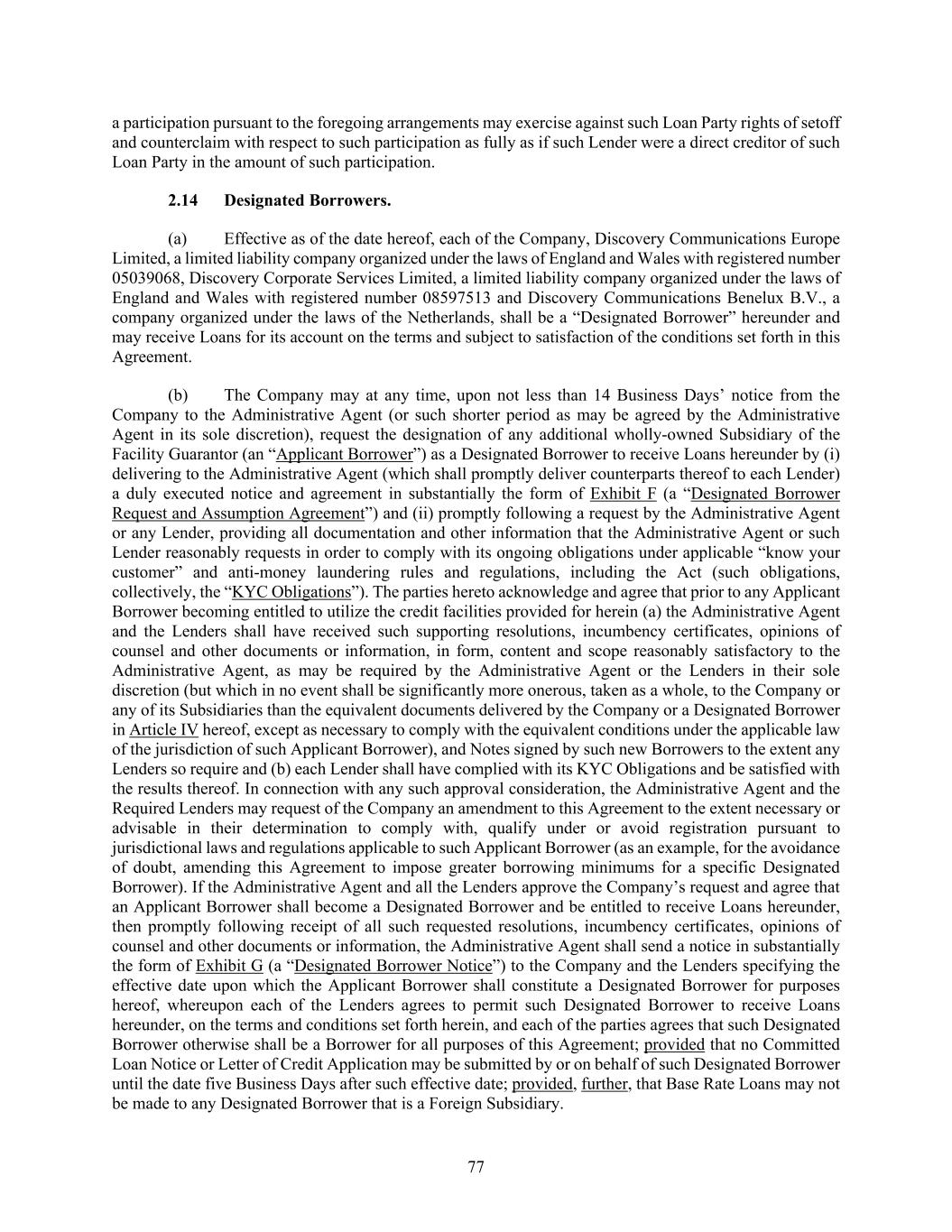 77 a participation pursuant to the foregoing arrangements may exercise against such Loan Party rights of setoff and counterclaim with respect to such participation as fully as if such Lender were a direct creditor of such Loan Party in the amount of such participation. 2.14 Designated Borrowers. (a) Effective as of the date hereof, each of the Company, Discovery Communications Europe Limited, a limited liability company organized under the laws of England and Wales with registered number 05039068, Discovery Corporate Services Limited, a limited liability company organized under the laws of England and Wales with registered number 08597513 and Discovery Communications Benelux B.V., a company organized under the laws of the Netherlands, shall be a “Designated Borrower” hereunder and may receive Loans for its account on the terms and subject to satisfaction of the conditions set forth in this Agreement. (b) The Company may at any time, upon not less than 14 Business Days’ notice from the Company to the Administrative Agent (or such shorter period as may be agreed by the Administrative Agent in its sole discretion), request the designation of any additional wholly-owned Subsidiary of the Facility Guarantor (an “Applicant Borrower”) as a Designated Borrower to receive Loans hereunder by (i) delivering to the Administrative Agent (which shall promptly deliver counterparts thereof to each Lender) a duly executed notice and agreement in substantially the form of Exhibit F (a “Designated Borrower Request and Assumption Agreement”) and (ii) promptly following a request by the Administrative Agent or any Lender, providing all documentation and other information that the Administrative Agent or such Lender reasonably requests in order to comply with its ongoing obligations under applicable “know your customer” and anti-money laundering rules and regulations, including the Act (such obligations, collectively, the “KYC Obligations”). The parties hereto acknowledge and agree that prior to any Applicant Borrower becoming entitled to utilize the credit facilities provided for herein (a) the Administrative Agent and the Lenders shall have received such supporting resolutions, incumbency certificates, opinions of counsel and other documents or information, in form, content and scope reasonably satisfactory to the Administrative Agent, as may be required by the Administrative Agent or the Lenders in their sole discretion (but which in no event shall be significantly more onerous, taken as a whole, to the Company or any of its Subsidiaries than the equivalent documents delivered by the Company or a Designated Borrower in Article IV hereof, except as necessary to comply with the equivalent conditions under the applicable law of the jurisdiction of such Applicant Borrower), and Notes signed by such new Borrowers to the extent any Lenders so require and (b) each Lender shall have complied with its KYC Obligations and be satisfied with the results thereof. In connection with any such approval consideration, the Administrative Agent and the Required Lenders may request of the Company an amendment to this Agreement to the extent necessary or advisable in their determination to comply with, qualify under or avoid registration pursuant to jurisdictional laws and regulations applicable to such Applicant Borrower (as an example, for the avoidance of doubt, amending this Agreement to impose greater borrowing minimums for a specific Designated Borrower). If the Administrative Agent and all the Lenders approve the Company’s request and agree that an Applicant Borrower shall become a Designated Borrower and be entitled to receive Loans hereunder, then promptly following receipt of all such requested resolutions, incumbency certificates, opinions of counsel and other documents or information, the Administrative Agent shall send a notice in substantially the form of Exhibit G (a “Designated Borrower Notice”) to the Company and the Lenders specifying the effective date upon which the Applicant Borrower shall constitute a Designated Borrower for purposes hereof, whereupon each of the Lenders agrees to permit such Designated Borrower to receive Loans hereunder, on the terms and conditions set forth herein, and each of the parties agrees that such Designated Borrower otherwise shall be a Borrower for all purposes of this Agreement; provided that no Committed Loan Notice or Letter of Credit Application may be submitted by or on behalf of such Designated Borrower until the date five Business Days after such effective date; provided, further, that Base Rate Loans may not be made to any Designated Borrower that is a Foreign Subsidiary.