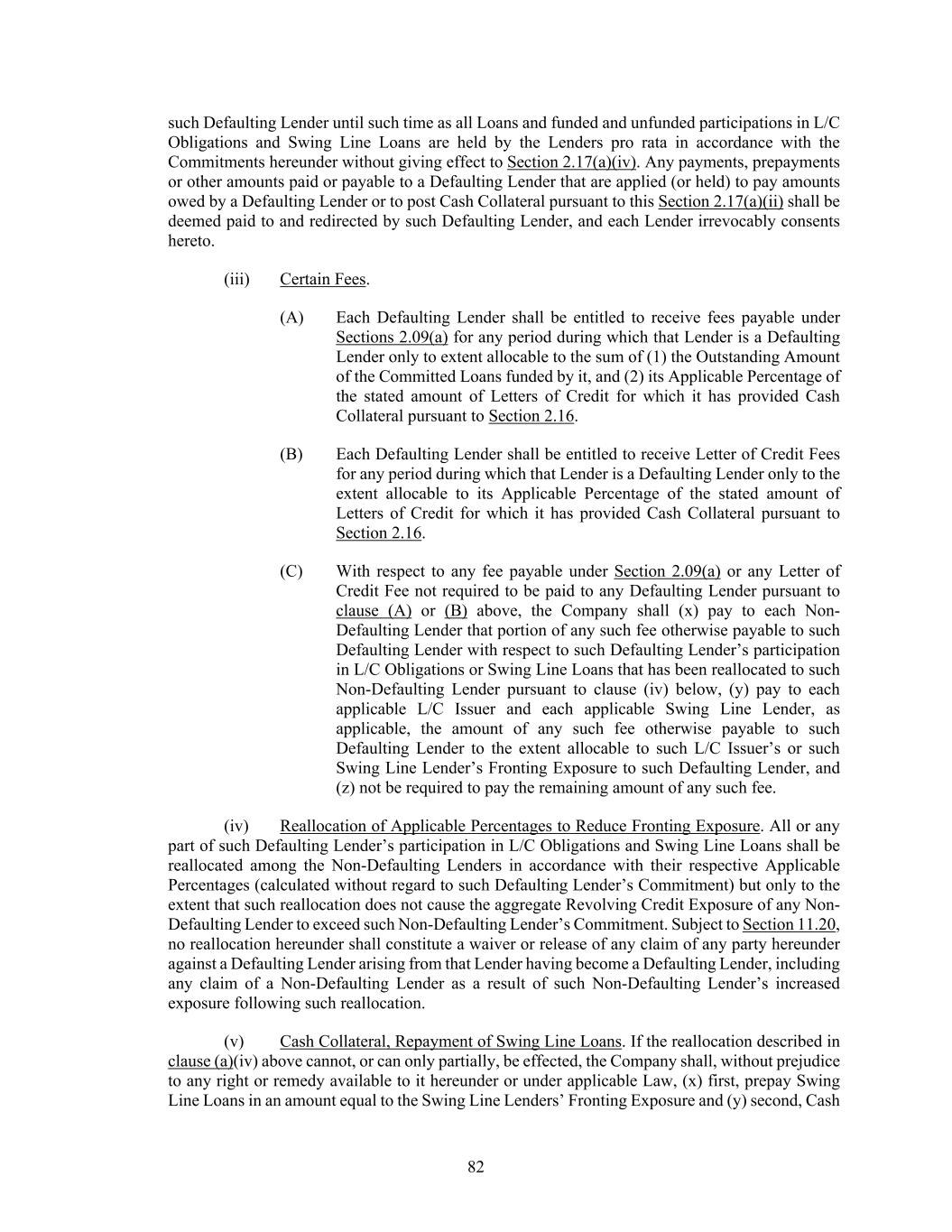 82 such Defaulting Lender until such time as all Loans and funded and unfunded participations in L/C Obligations and Swing Line Loans are held by the Lenders pro rata in accordance with the Commitments hereunder without giving effect to Section 2.17(a)(iv). Any payments, prepayments or other amounts paid or payable to a Defaulting Lender that are applied (or held) to pay amounts owed by a Defaulting Lender or to post Cash Collateral pursuant to this Section 2.17(a)(ii) shall be deemed paid to and redirected by such Defaulting Lender, and each Lender irrevocably consents hereto. (iii) Certain Fees. (A) Each Defaulting Lender shall be entitled to receive fees payable under Sections 2.09(a) for any period during which that Lender is a Defaulting Lender only to extent allocable to the sum of (1) the Outstanding Amount of the Committed Loans funded by it, and (2) its Applicable Percentage of the stated amount of Letters of Credit for which it has provided Cash Collateral pursuant to Section 2.16. (B) Each Defaulting Lender shall be entitled to receive Letter of Credit Fees for any period during which that Lender is a Defaulting Lender only to the extent allocable to its Applicable Percentage of the stated amount of Letters of Credit for which it has provided Cash Collateral pursuant to Section 2.16. (C) With respect to any fee payable under Section 2.09(a) or any Letter of Credit Fee not required to be paid to any Defaulting Lender pursuant to clause (A) or (B) above, the Company shall (x) pay to each Non- Defaulting Lender that portion of any such fee otherwise payable to such Defaulting Lender with respect to such Defaulting Lender’s participation in L/C Obligations or Swing Line Loans that has been reallocated to such Non-Defaulting Lender pursuant to clause (iv) below, (y) pay to each applicable L/C Issuer and each applicable Swing Line Lender, as applicable, the amount of any such fee otherwise payable to such Defaulting Lender to the extent allocable to such L/C Issuer’s or such Swing Line Lender’s Fronting Exposure to such Defaulting Lender, and (z) not be required to pay the remaining amount of any such fee. (iv) Reallocation of Applicable Percentages to Reduce Fronting Exposure. All or any part of such Defaulting Lender’s participation in L/C Obligations and Swing Line Loans shall be reallocated among the Non-Defaulting Lenders in accordance with their respective Applicable Percentages (calculated without regard to such Defaulting Lender’s Commitment) but only to the extent that such reallocation does not cause the aggregate Revolving Credit Exposure of any Non- Defaulting Lender to exceed such Non-Defaulting Lender’s Commitment. Subject to Section 11.20, no reallocation hereunder shall constitute a waiver or release of any claim of any party hereunder against a Defaulting Lender arising from that Lender having become a Defaulting Lender, including any claim of a Non-Defaulting Lender as a result of such Non-Defaulting Lender’s increased exposure following such reallocation. (v) Cash Collateral, Repayment of Swing Line Loans. If the reallocation described in clause (a)(iv) above cannot, or can only partially, be effected, the Company shall, without prejudice to any right or remedy available to it hereunder or under applicable Law, (x) first, prepay Swing Line Loans in an amount equal to the Swing Line Lenders’ Fronting Exposure and (y) second, Cash