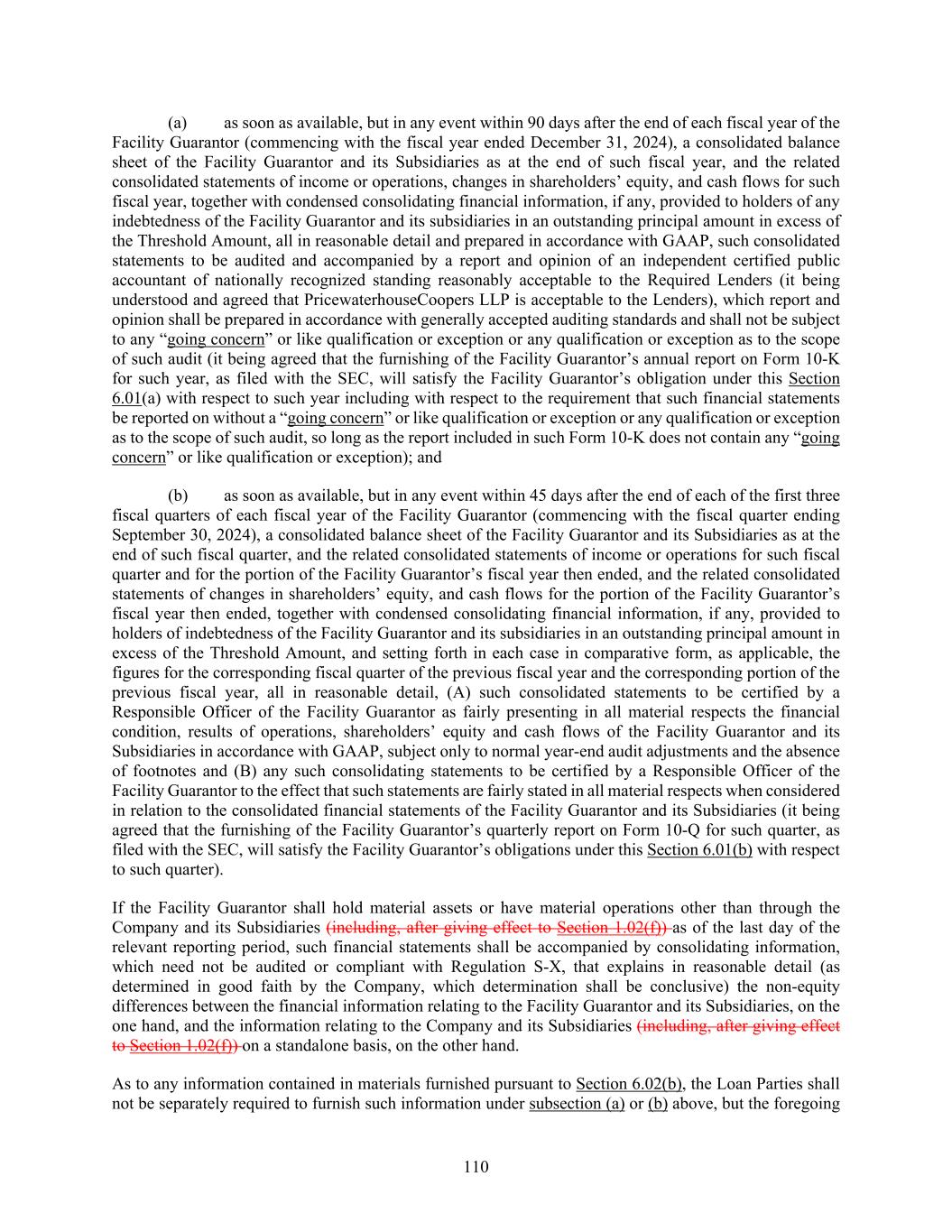 110 (a) as soon as available, but in any event within 90 days after the end of each fiscal year of the Facility Guarantor (commencing with the fiscal year ended December 31, 2024), a consolidated balance sheet of the Facility Guarantor and its Subsidiaries as at the end of such fiscal year, and the related consolidated statements of income or operations, changes in shareholders’ equity, and cash flows for such fiscal year, together with condensed consolidating financial information, if any, provided to holders of any indebtedness of the Facility Guarantor and its subsidiaries in an outstanding principal amount in excess of the Threshold Amount, all in reasonable detail and prepared in accordance with GAAP, such consolidated statements to be audited and accompanied by a report and opinion of an independent certified public accountant of nationally recognized standing reasonably acceptable to the Required Lenders (it being understood and agreed that PricewaterhouseCoopers LLP is acceptable to the Lenders), which report and opinion shall be prepared in accordance with generally accepted auditing standards and shall not be subject to any “going concern” or like qualification or exception or any qualification or exception as to the scope of such audit (it being agreed that the furnishing of the Facility Guarantor’s annual report on Form 10-K for such year, as filed with the SEC, will satisfy the Facility Guarantor’s obligation under this Section 6.01(a) with respect to such year including with respect to the requirement that such financial statements be reported on without a “going concern” or like qualification or exception or any qualification or exception as to the scope of such audit, so long as the report included in such Form 10-K does not contain any “going concern” or like qualification or exception); and (b) as soon as available, but in any event within 45 days after the end of each of the first three fiscal quarters of each fiscal year of the Facility Guarantor (commencing with the fiscal quarter ending September 30, 2024), a consolidated balance sheet of the Facility Guarantor and its Subsidiaries as at the end of such fiscal quarter, and the related consolidated statements of income or operations for such fiscal quarter and for the portion of the Facility Guarantor’s fiscal year then ended, and the related consolidated statements of changes in shareholders’ equity, and cash flows for the portion of the Facility Guarantor’s fiscal year then ended, together with condensed consolidating financial information, if any, provided to holders of indebtedness of the Facility Guarantor and its subsidiaries in an outstanding principal amount in excess of the Threshold Amount, and setting forth in each case in comparative form, as applicable, the figures for the corresponding fiscal quarter of the previous fiscal year and the corresponding portion of the previous fiscal year, all in reasonable detail, (A) such consolidated statements to be certified by a Responsible Officer of the Facility Guarantor as fairly presenting in all material respects the financial condition, results of operations, shareholders’ equity and cash flows of the Facility Guarantor and its Subsidiaries in accordance with GAAP, subject only to normal year-end audit adjustments and the absence of footnotes and (B) any such consolidating statements to be certified by a Responsible Officer of the Facility Guarantor to the effect that such statements are fairly stated in all material respects when considered in relation to the consolidated financial statements of the Facility Guarantor and its Subsidiaries (it being agreed that the furnishing of the Facility Guarantor’s quarterly report on Form 10-Q for such quarter, as filed with the SEC, will satisfy the Facility Guarantor’s obligations under this Section 6.01(b) with respect to such quarter). If the Facility Guarantor shall hold material assets or have material operations other than through the Company and its Subsidiaries (including, after giving effect to Section 1.02(f)) as of the last day of the relevant reporting period, such financial statements shall be accompanied by consolidating information, which need not be audited or compliant with Regulation S-X, that explains in reasonable detail (as determined in good faith by the Company, which determination shall be conclusive) the non-equity differences between the financial information relating to the Facility Guarantor and its Subsidiaries, on the one hand, and the information relating to the Company and its Subsidiaries (including, after giving effect to Section 1.02(f)) on a standalone basis, on the other hand. As to any information contained in materials furnished pursuant to Section 6.02(b), the Loan Parties shall not be separately required to furnish such information under subsection (a) or (b) above, but the foregoing