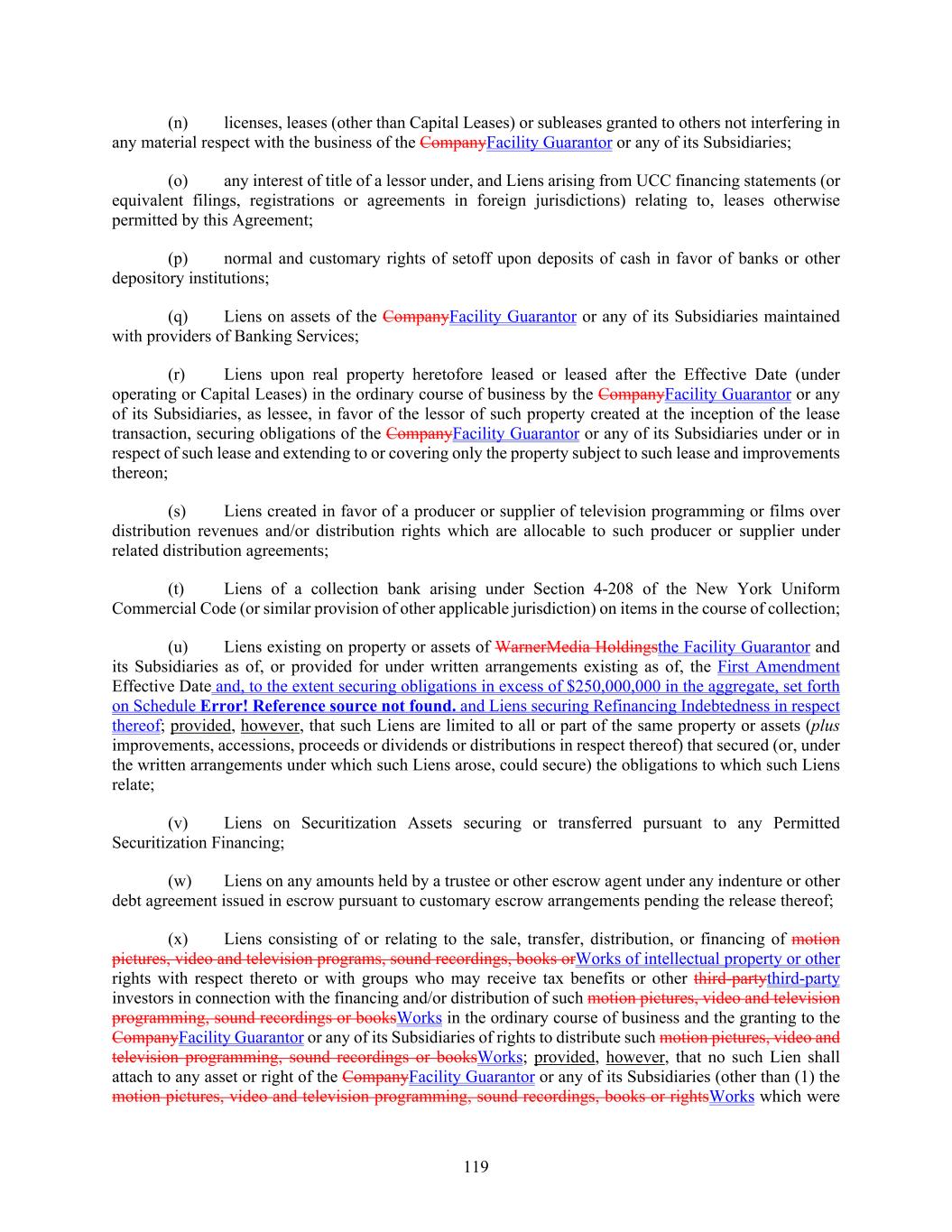 119 (n) licenses, leases (other than Capital Leases) or subleases granted to others not interfering in any material respect with the business of the CompanyFacility Guarantor or any of its Subsidiaries; (o) any interest of title of a lessor under, and Liens arising from UCC financing statements (or equivalent filings, registrations or agreements in foreign jurisdictions) relating to, leases otherwise permitted by this Agreement; (p) normal and customary rights of setoff upon deposits of cash in favor of banks or other depository institutions; (q) Liens on assets of the CompanyFacility Guarantor or any of its Subsidiaries maintained with providers of Banking Services; (r) Liens upon real property heretofore leased or leased after the Effective Date (under operating or Capital Leases) in the ordinary course of business by the CompanyFacility Guarantor or any of its Subsidiaries, as lessee, in favor of the lessor of such property created at the inception of the lease transaction, securing obligations of the CompanyFacility Guarantor or any of its Subsidiaries under or in respect of such lease and extending to or covering only the property subject to such lease and improvements thereon; (s) Liens created in favor of a producer or supplier of television programming or films over distribution revenues and/or distribution rights which are allocable to such producer or supplier under related distribution agreements; (t) Liens of a collection bank arising under Section 4-208 of the New York Uniform Commercial Code (or similar provision of other applicable jurisdiction) on items in the course of collection; (u) Liens existing on property or assets of WarnerMedia Holdingsthe Facility Guarantor and its Subsidiaries as of, or provided for under written arrangements existing as of, the First Amendment Effective Date and, to the extent securing obligations in excess of $250,000,000 in the aggregate, set forth on Schedule Error! Reference source not found. and Liens securing Refinancing Indebtedness in respect thereof; provided, however, that such Liens are limited to all or part of the same property or assets (plus improvements, accessions, proceeds or dividends or distributions in respect thereof) that secured (or, under the written arrangements under which such Liens arose, could secure) the obligations to which such Liens relate; (v) Liens on Securitization Assets securing or transferred pursuant to any Permitted Securitization Financing; (w) Liens on any amounts held by a trustee or other escrow agent under any indenture or other debt agreement issued in escrow pursuant to customary escrow arrangements pending the release thereof; (x) Liens consisting of or relating to the sale, transfer, distribution, or financing of motion pictures, video and television programs, sound recordings, books orWorks of intellectual property or other rights with respect thereto or with groups who may receive tax benefits or other third-partythird-party investors in connection with the financing and/or distribution of such motion pictures, video and television programming, sound recordings or booksWorks in the ordinary course of business and the granting to the CompanyFacility Guarantor or any of its Subsidiaries of rights to distribute such motion pictures, video and television programming, sound recordings or booksWorks; provided, however, that no such Lien shall attach to any asset or right of the CompanyFacility Guarantor or any of its Subsidiaries (other than (1) the motion pictures, video and television programming, sound recordings, books or rightsWorks which were
