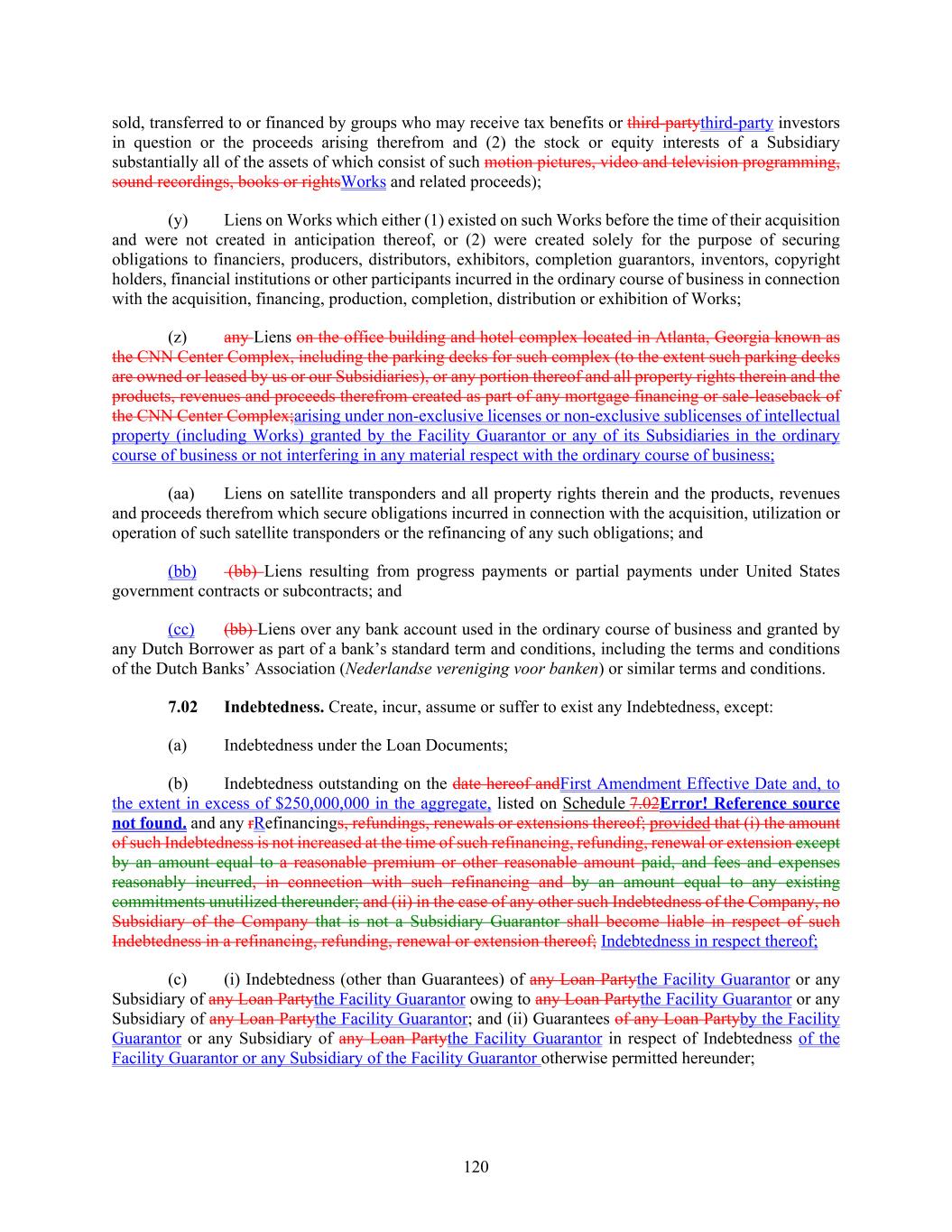 120 sold, transferred to or financed by groups who may receive tax benefits or third-partythird-party investors in question or the proceeds arising therefrom and (2) the stock or equity interests of a Subsidiary substantially all of the assets of which consist of such motion pictures, video and television programming, sound recordings, books or rightsWorks and related proceeds); (y) Liens on Works which either (1) existed on such Works before the time of their acquisition and were not created in anticipation thereof, or (2) were created solely for the purpose of securing obligations to financiers, producers, distributors, exhibitors, completion guarantors, inventors, copyright holders, financial institutions or other participants incurred in the ordinary course of business in connection with the acquisition, financing, production, completion, distribution or exhibition of Works; (z) any Liens on the office building and hotel complex located in Atlanta, Georgia known as the CNN Center Complex, including the parking decks for such complex (to the extent such parking decks are owned or leased by us or our Subsidiaries), or any portion thereof and all property rights therein and the products, revenues and proceeds therefrom created as part of any mortgage financing or sale-leaseback of the CNN Center Complex;arising under non-exclusive licenses or non-exclusive sublicenses of intellectual property (including Works) granted by the Facility Guarantor or any of its Subsidiaries in the ordinary course of business or not interfering in any material respect with the ordinary course of business; (aa) Liens on satellite transponders and all property rights therein and the products, revenues and proceeds therefrom which secure obligations incurred in connection with the acquisition, utilization or operation of such satellite transponders or the refinancing of any such obligations; and (bb) (bb) Liens resulting from progress payments or partial payments under United States government contracts or subcontracts; and (cc) (bb) Liens over any bank account used in the ordinary course of business and granted by any Dutch Borrower as part of a bank’s standard term and conditions, including the terms and conditions of the Dutch Banks’ Association (Nederlandse vereniging voor banken) or similar terms and conditions. 7.02 Indebtedness. Create, incur, assume or suffer to exist any Indebtedness, except: (a) Indebtedness under the Loan Documents; (b) Indebtedness outstanding on the date hereof andFirst Amendment Effective Date and, to the extent in excess of $250,000,000 in the aggregate, listed on Schedule 7.02Error! Reference source not found. and any rRefinancings, refundings, renewals or extensions thereof; provided that (i) the amount of such Indebtedness is not increased at the time of such refinancing, refunding, renewal or extension except by an amount equal to a reasonable premium or other reasonable amount paid, and fees and expenses reasonably incurred, in connection with such refinancing and by an amount equal to any existing commitments unutilized thereunder; and (ii) in the case of any other such Indebtedness of the Company, no Subsidiary of the Company that is not a Subsidiary Guarantor shall become liable in respect of such Indebtedness in a refinancing, refunding, renewal or extension thereof; Indebtedness in respect thereof; (c) (i) Indebtedness (other than Guarantees) of any Loan Partythe Facility Guarantor or any Subsidiary of any Loan Partythe Facility Guarantor owing to any Loan Partythe Facility Guarantor or any Subsidiary of any Loan Partythe Facility Guarantor; and (ii) Guarantees of any Loan Partyby the Facility Guarantor or any Subsidiary of any Loan Partythe Facility Guarantor in respect of Indebtedness of the Facility Guarantor or any Subsidiary of the Facility Guarantor otherwise permitted hereunder;