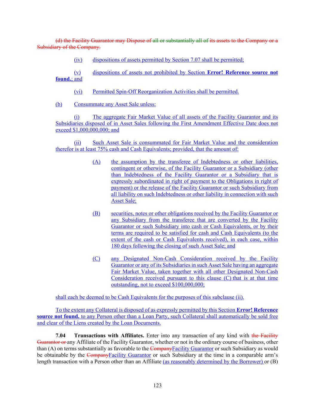 123 (d) the Facility Guarantor may Dispose of all or substantially all of its assets to the Company or a Subsidiary of the Company. (iv) dispositions of assets permitted by Section 7.07 shall be permitted; (v) dispositions of assets not prohibited by Section Error! Reference source not found.; and (vi) Permitted Spin-Off Reorganization Activities shall be permitted. (b) Consummate any Asset Sale unless: (i) The aggregate Fair Market Value of all assets of the Facility Guarantor and its Subsidiaries disposed of in Asset Sales following the First Amendment Effective Date does not exceed $1,000,000,000; and (ii) Such Asset Sale is consummated for Fair Market Value and the consideration therefor is at least 75% cash and Cash Equivalents; provided, that the amount of: (A) the assumption by the transferee of Indebtedness or other liabilities, contingent or otherwise, of the Facility Guarantor or a Subsidiary (other than Indebtedness of the Facility Guarantor or a Subsidiary that is expressly subordinated in right of payment to the Obligations in right of payment) or the release of the Facility Guarantor or such Subsidiary from all liability on such Indebtedness or other liability in connection with such Asset Sale; (B) securities, notes or other obligations received by the Facility Guarantor or any Subsidiary from the transferee that are converted by the Facility Guarantor or such Subsidiary into cash or Cash Equivalents, or by their terms are required to be satisfied for cash and Cash Equivalents (to the extent of the cash or Cash Equivalents received), in each case, within 180 days following the closing of such Asset Sale; and (C) any Designated Non-Cash Consideration received by the Facility Guarantor or any of its Subsidiaries in such Asset Sale having an aggregate Fair Market Value, taken together with all other Designated Non-Cash Consideration received pursuant to this clause (C) that is at that time outstanding, not to exceed $100,000,000; shall each be deemed to be Cash Equivalents for the purposes of this subclause (ii). To the extent any Collateral is disposed of as expressly permitted by this Section Error! Reference source not found. to any Person other than a Loan Party, such Collateral shall automatically be sold free and clear of the Liens created by the Loan Documents. 7.04 Transactions with Affiliates. Enter into any transaction of any kind with the Facility Guarantor or any Affiliate of the Facility Guarantor, whether or not in the ordinary course of business, other than (A) on terms substantially as favorable to the CompanyFacility Guarantor or such Subsidiary as would be obtainable by the CompanyFacility Guarantor or such Subsidiary at the time in a comparable arm’s length transaction with a Person other than an Affiliate (as reasonably determined by the Borrower) or (B)