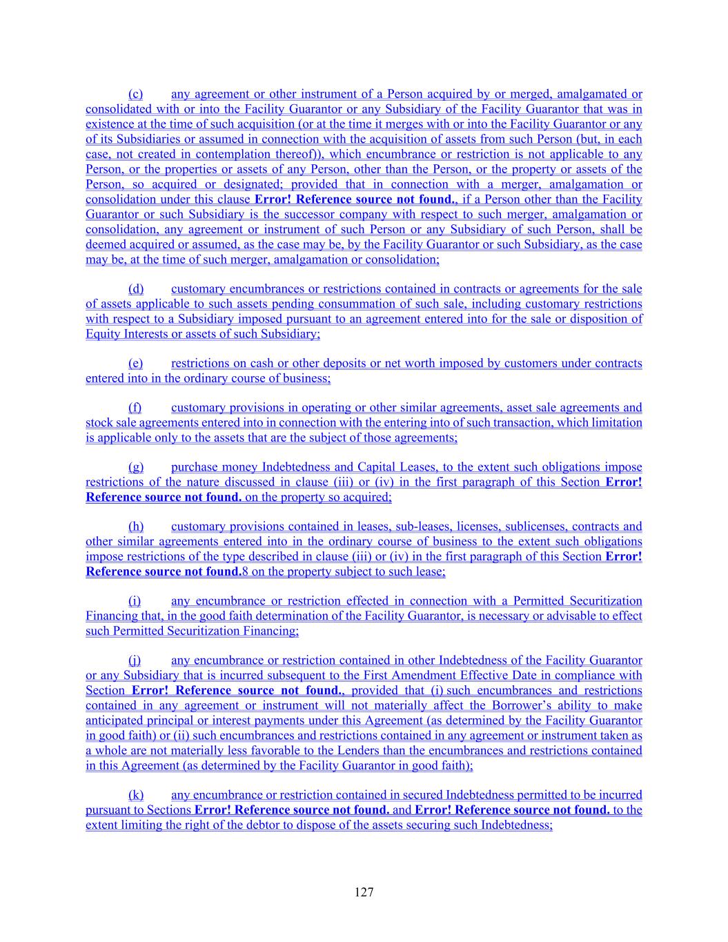 127 (c) any agreement or other instrument of a Person acquired by or merged, amalgamated or consolidated with or into the Facility Guarantor or any Subsidiary of the Facility Guarantor that was in existence at the time of such acquisition (or at the time it merges with or into the Facility Guarantor or any of its Subsidiaries or assumed in connection with the acquisition of assets from such Person (but, in each case, not created in contemplation thereof)), which encumbrance or restriction is not applicable to any Person, or the properties or assets of any Person, other than the Person, or the property or assets of the Person, so acquired or designated; provided that in connection with a merger, amalgamation or consolidation under this clause Error! Reference source not found., if a Person other than the Facility Guarantor or such Subsidiary is the successor company with respect to such merger, amalgamation or consolidation, any agreement or instrument of such Person or any Subsidiary of such Person, shall be deemed acquired or assumed, as the case may be, by the Facility Guarantor or such Subsidiary, as the case may be, at the time of such merger, amalgamation or consolidation; (d) customary encumbrances or restrictions contained in contracts or agreements for the sale of assets applicable to such assets pending consummation of such sale, including customary restrictions with respect to a Subsidiary imposed pursuant to an agreement entered into for the sale or disposition of Equity Interests or assets of such Subsidiary; (e) restrictions on cash or other deposits or net worth imposed by customers under contracts entered into in the ordinary course of business; (f) customary provisions in operating or other similar agreements, asset sale agreements and stock sale agreements entered into in connection with the entering into of such transaction, which limitation is applicable only to the assets that are the subject of those agreements; (g) purchase money Indebtedness and Capital Leases, to the extent such obligations impose restrictions of the nature discussed in clause (iii) or (iv) in the first paragraph of this Section Error! Reference source not found. on the property so acquired; (h) customary provisions contained in leases, sub-leases, licenses, sublicenses, contracts and other similar agreements entered into in the ordinary course of business to the extent such obligations impose restrictions of the type described in clause (iii) or (iv) in the first paragraph of this Section Error! Reference source not found.8 on the property subject to such lease; (i) any encumbrance or restriction effected in connection with a Permitted Securitization Financing that, in the good faith determination of the Facility Guarantor, is necessary or advisable to effect such Permitted Securitization Financing; (j) any encumbrance or restriction contained in other Indebtedness of the Facility Guarantor or any Subsidiary that is incurred subsequent to the First Amendment Effective Date in compliance with Section Error! Reference source not found., provided that (i) such encumbrances and restrictions contained in any agreement or instrument will not materially affect the Borrower’s ability to make anticipated principal or interest payments under this Agreement (as determined by the Facility Guarantor in good faith) or (ii) such encumbrances and restrictions contained in any agreement or instrument taken as a whole are not materially less favorable to the Lenders than the encumbrances and restrictions contained in this Agreement (as determined by the Facility Guarantor in good faith); (k) any encumbrance or restriction contained in secured Indebtedness permitted to be incurred pursuant to Sections Error! Reference source not found. and Error! Reference source not found. to the extent limiting the right of the debtor to dispose of the assets securing such Indebtedness;