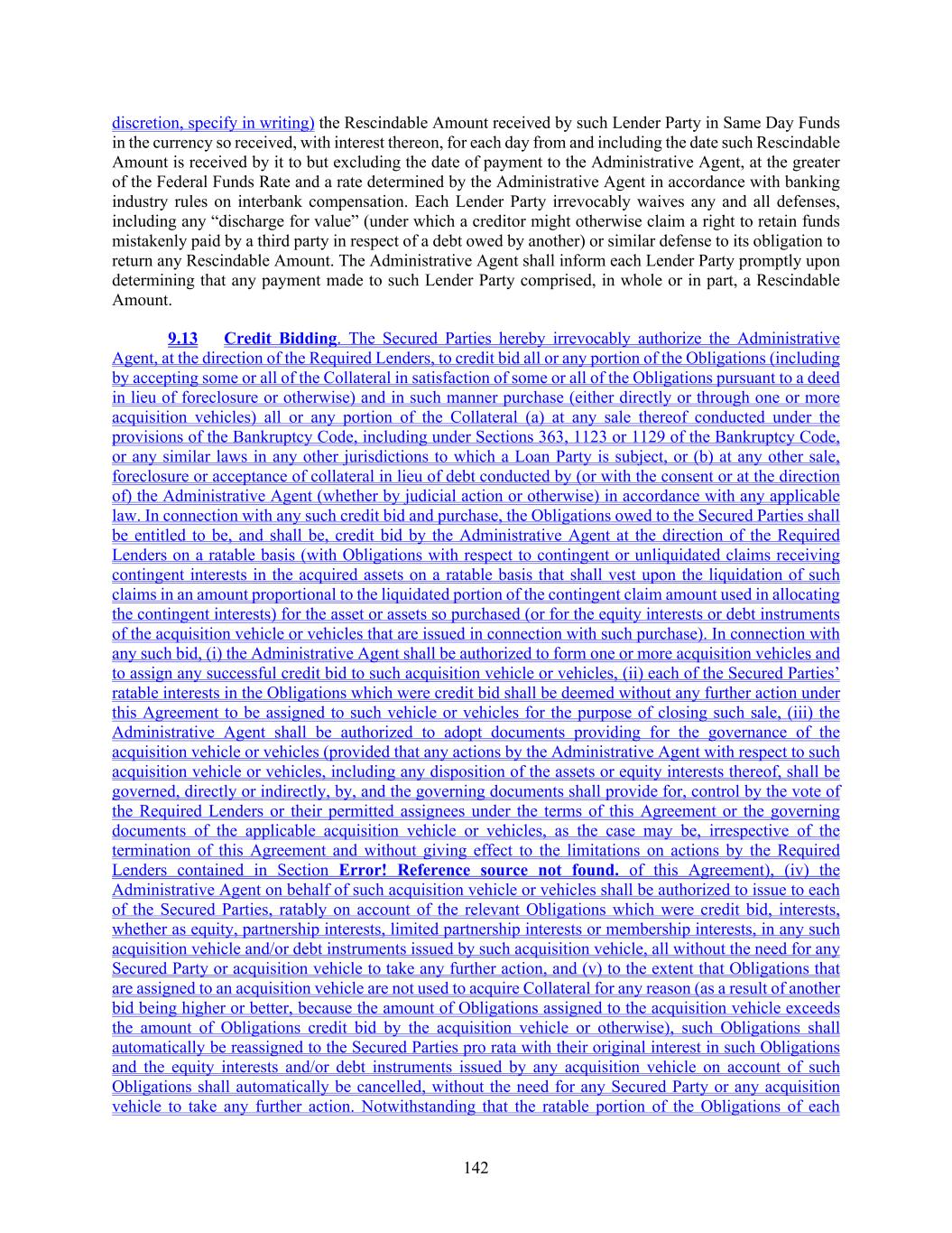 142 discretion, specify in writing) the Rescindable Amount received by such Lender Party in Same Day Funds in the currency so received, with interest thereon, for each day from and including the date such Rescindable Amount is received by it to but excluding the date of payment to the Administrative Agent, at the greater of the Federal Funds Rate and a rate determined by the Administrative Agent in accordance with banking industry rules on interbank compensation. Each Lender Party irrevocably waives any and all defenses, including any “discharge for value” (under which a creditor might otherwise claim a right to retain funds mistakenly paid by a third party in respect of a debt owed by another) or similar defense to its obligation to return any Rescindable Amount. The Administrative Agent shall inform each Lender Party promptly upon determining that any payment made to such Lender Party comprised, in whole or in part, a Rescindable Amount. 9.13 Credit Bidding. The Secured Parties hereby irrevocably authorize the Administrative Agent, at the direction of the Required Lenders, to credit bid all or any portion of the Obligations (including by accepting some or all of the Collateral in satisfaction of some or all of the Obligations pursuant to a deed in lieu of foreclosure or otherwise) and in such manner purchase (either directly or through one or more acquisition vehicles) all or any portion of the Collateral (a) at any sale thereof conducted under the provisions of the Bankruptcy Code, including under Sections 363, 1123 or 1129 of the Bankruptcy Code, or any similar laws in any other jurisdictions to which a Loan Party is subject, or (b) at any other sale, foreclosure or acceptance of collateral in lieu of debt conducted by (or with the consent or at the direction of) the Administrative Agent (whether by judicial action or otherwise) in accordance with any applicable law. In connection with any such credit bid and purchase, the Obligations owed to the Secured Parties shall be entitled to be, and shall be, credit bid by the Administrative Agent at the direction of the Required Lenders on a ratable basis (with Obligations with respect to contingent or unliquidated claims receiving contingent interests in the acquired assets on a ratable basis that shall vest upon the liquidation of such claims in an amount proportional to the liquidated portion of the contingent claim amount used in allocating the contingent interests) for the asset or assets so purchased (or for the equity interests or debt instruments of the acquisition vehicle or vehicles that are issued in connection with such purchase). In connection with any such bid, (i) the Administrative Agent shall be authorized to form one or more acquisition vehicles and to assign any successful credit bid to such acquisition vehicle or vehicles, (ii) each of the Secured Parties’ ratable interests in the Obligations which were credit bid shall be deemed without any further action under this Agreement to be assigned to such vehicle or vehicles for the purpose of closing such sale, (iii) the Administrative Agent shall be authorized to adopt documents providing for the governance of the acquisition vehicle or vehicles (provided that any actions by the Administrative Agent with respect to such acquisition vehicle or vehicles, including any disposition of the assets or equity interests thereof, shall be governed, directly or indirectly, by, and the governing documents shall provide for, control by the vote of the Required Lenders or their permitted assignees under the terms of this Agreement or the governing documents of the applicable acquisition vehicle or vehicles, as the case may be, irrespective of the termination of this Agreement and without giving effect to the limitations on actions by the Required Lenders contained in Section Error! Reference source not found. of this Agreement), (iv) the Administrative Agent on behalf of such acquisition vehicle or vehicles shall be authorized to issue to each of the Secured Parties, ratably on account of the relevant Obligations which were credit bid, interests, whether as equity, partnership interests, limited partnership interests or membership interests, in any such acquisition vehicle and/or debt instruments issued by such acquisition vehicle, all without the need for any Secured Party or acquisition vehicle to take any further action, and (v) to the extent that Obligations that are assigned to an acquisition vehicle are not used to acquire Collateral for any reason (as a result of another bid being higher or better, because the amount of Obligations assigned to the acquisition vehicle exceeds the amount of Obligations credit bid by the acquisition vehicle or otherwise), such Obligations shall automatically be reassigned to the Secured Parties pro rata with their original interest in such Obligations and the equity interests and/or debt instruments issued by any acquisition vehicle on account of such Obligations shall automatically be cancelled, without the need for any Secured Party or any acquisition vehicle to take any further action. Notwithstanding that the ratable portion of the Obligations of each