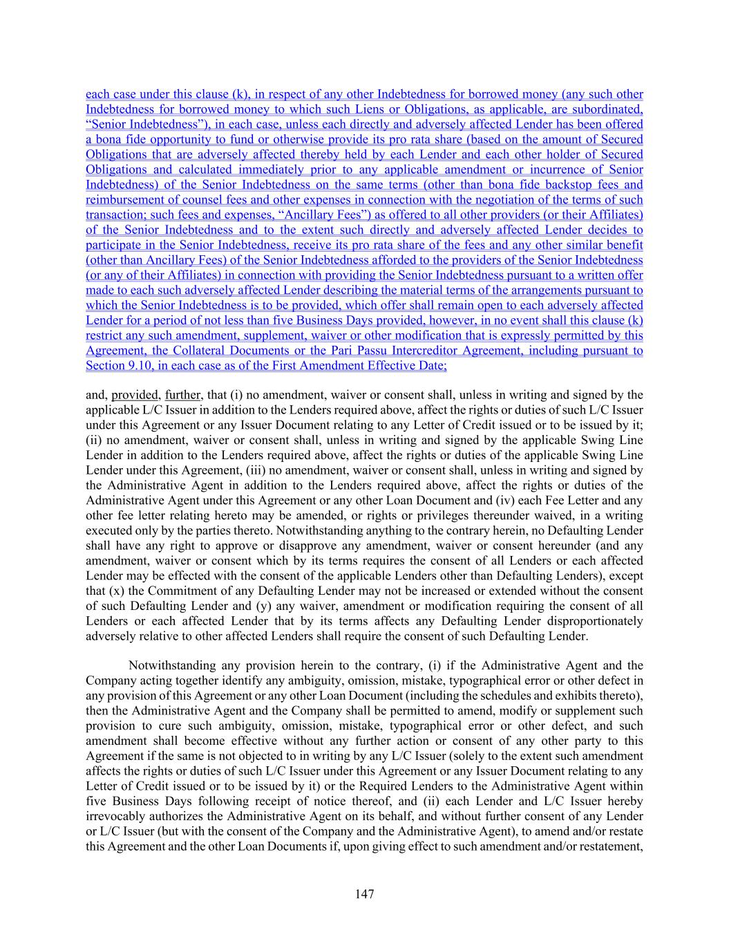 147 each case under this clause (k), in respect of any other Indebtedness for borrowed money (any such other Indebtedness for borrowed money to which such Liens or Obligations, as applicable, are subordinated, “Senior Indebtedness”), in each case, unless each directly and adversely affected Lender has been offered a bona fide opportunity to fund or otherwise provide its pro rata share (based on the amount of Secured Obligations that are adversely affected thereby held by each Lender and each other holder of Secured Obligations and calculated immediately prior to any applicable amendment or incurrence of Senior Indebtedness) of the Senior Indebtedness on the same terms (other than bona fide backstop fees and reimbursement of counsel fees and other expenses in connection with the negotiation of the terms of such transaction; such fees and expenses, “Ancillary Fees”) as offered to all other providers (or their Affiliates) of the Senior Indebtedness and to the extent such directly and adversely affected Lender decides to participate in the Senior Indebtedness, receive its pro rata share of the fees and any other similar benefit (other than Ancillary Fees) of the Senior Indebtedness afforded to the providers of the Senior Indebtedness (or any of their Affiliates) in connection with providing the Senior Indebtedness pursuant to a written offer made to each such adversely affected Lender describing the material terms of the arrangements pursuant to which the Senior Indebtedness is to be provided, which offer shall remain open to each adversely affected Lender for a period of not less than five Business Days provided, however, in no event shall this clause (k) restrict any such amendment, supplement, waiver or other modification that is expressly permitted by this Agreement, the Collateral Documents or the Pari Passu Intercreditor Agreement, including pursuant to Section 9.10, in each case as of the First Amendment Effective Date; and, provided, further, that (i) no amendment, waiver or consent shall, unless in writing and signed by the applicable L/C Issuer in addition to the Lenders required above, affect the rights or duties of such L/C Issuer under this Agreement or any Issuer Document relating to any Letter of Credit issued or to be issued by it; (ii) no amendment, waiver or consent shall, unless in writing and signed by the applicable Swing Line Lender in addition to the Lenders required above, affect the rights or duties of the applicable Swing Line Lender under this Agreement, (iii) no amendment, waiver or consent shall, unless in writing and signed by the Administrative Agent in addition to the Lenders required above, affect the rights or duties of the Administrative Agent under this Agreement or any other Loan Document and (iv) each Fee Letter and any other fee letter relating hereto may be amended, or rights or privileges thereunder waived, in a writing executed only by the parties thereto. Notwithstanding anything to the contrary herein, no Defaulting Lender shall have any right to approve or disapprove any amendment, waiver or consent hereunder (and any amendment, waiver or consent which by its terms requires the consent of all Lenders or each affected Lender may be effected with the consent of the applicable Lenders other than Defaulting Lenders), except that (x) the Commitment of any Defaulting Lender may not be increased or extended without the consent of such Defaulting Lender and (y) any waiver, amendment or modification requiring the consent of all Lenders or each affected Lender that by its terms affects any Defaulting Lender disproportionately adversely relative to other affected Lenders shall require the consent of such Defaulting Lender. Notwithstanding any provision herein to the contrary, (i) if the Administrative Agent and the Company acting together identify any ambiguity, omission, mistake, typographical error or other defect in any provision of this Agreement or any other Loan Document (including the schedules and exhibits thereto), then the Administrative Agent and the Company shall be permitted to amend, modify or supplement such provision to cure such ambiguity, omission, mistake, typographical error or other defect, and such amendment shall become effective without any further action or consent of any other party to this Agreement if the same is not objected to in writing by any L/C Issuer (solely to the extent such amendment affects the rights or duties of such L/C Issuer under this Agreement or any Issuer Document relating to any Letter of Credit issued or to be issued by it) or the Required Lenders to the Administrative Agent within five Business Days following receipt of notice thereof, and (ii) each Lender and L/C Issuer hereby irrevocably authorizes the Administrative Agent on its behalf, and without further consent of any Lender or L/C Issuer (but with the consent of the Company and the Administrative Agent), to amend and/or restate this Agreement and the other Loan Documents if, upon giving effect to such amendment and/or restatement,
