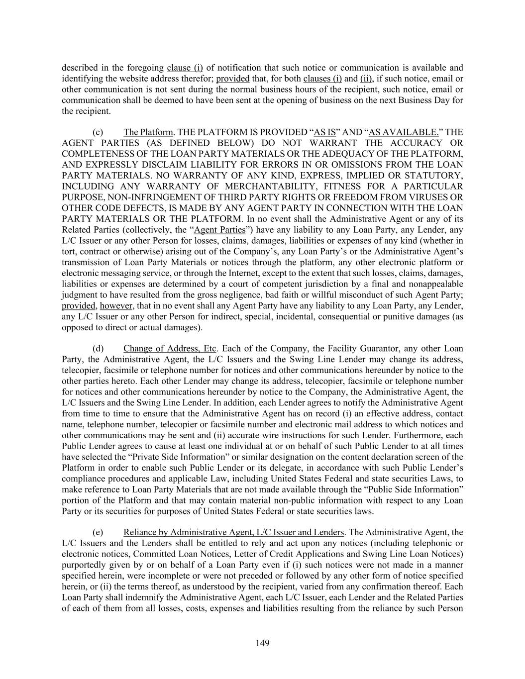 149 described in the foregoing clause (i) of notification that such notice or communication is available and identifying the website address therefor; provided that, for both clauses (i) and (ii), if such notice, email or other communication is not sent during the normal business hours of the recipient, such notice, email or communication shall be deemed to have been sent at the opening of business on the next Business Day for the recipient. (c) The Platform. THE PLATFORM IS PROVIDED “AS IS” AND “AS AVAILABLE.” THE AGENT PARTIES (AS DEFINED BELOW) DO NOT WARRANT THE ACCURACY OR COMPLETENESS OF THE LOAN PARTY MATERIALS OR THE ADEQUACY OF THE PLATFORM, AND EXPRESSLY DISCLAIM LIABILITY FOR ERRORS IN OR OMISSIONS FROM THE LOAN PARTY MATERIALS. NO WARRANTY OF ANY KIND, EXPRESS, IMPLIED OR STATUTORY, INCLUDING ANY WARRANTY OF MERCHANTABILITY, FITNESS FOR A PARTICULAR PURPOSE, NON-INFRINGEMENT OF THIRD PARTY RIGHTS OR FREEDOM FROM VIRUSES OR OTHER CODE DEFECTS, IS MADE BY ANY AGENT PARTY IN CONNECTION WITH THE LOAN PARTY MATERIALS OR THE PLATFORM. In no event shall the Administrative Agent or any of its Related Parties (collectively, the “Agent Parties”) have any liability to any Loan Party, any Lender, any L/C Issuer or any other Person for losses, claims, damages, liabilities or expenses of any kind (whether in tort, contract or otherwise) arising out of the Company’s, any Loan Party’s or the Administrative Agent’s transmission of Loan Party Materials or notices through the platform, any other electronic platform or electronic messaging service, or through the Internet, except to the extent that such losses, claims, damages, liabilities or expenses are determined by a court of competent jurisdiction by a final and nonappealable judgment to have resulted from the gross negligence, bad faith or willful misconduct of such Agent Party; provided, however, that in no event shall any Agent Party have any liability to any Loan Party, any Lender, any L/C Issuer or any other Person for indirect, special, incidental, consequential or punitive damages (as opposed to direct or actual damages). (d) Change of Address, Etc. Each of the Company, the Facility Guarantor, any other Loan Party, the Administrative Agent, the L/C Issuers and the Swing Line Lender may change its address, telecopier, facsimile or telephone number for notices and other communications hereunder by notice to the other parties hereto. Each other Lender may change its address, telecopier, facsimile or telephone number for notices and other communications hereunder by notice to the Company, the Administrative Agent, the L/C Issuers and the Swing Line Lender. In addition, each Lender agrees to notify the Administrative Agent from time to time to ensure that the Administrative Agent has on record (i) an effective address, contact name, telephone number, telecopier or facsimile number and electronic mail address to which notices and other communications may be sent and (ii) accurate wire instructions for such Lender. Furthermore, each Public Lender agrees to cause at least one individual at or on behalf of such Public Lender to at all times have selected the “Private Side Information” or similar designation on the content declaration screen of the Platform in order to enable such Public Lender or its delegate, in accordance with such Public Lender’s compliance procedures and applicable Law, including United States Federal and state securities Laws, to make reference to Loan Party Materials that are not made available through the “Public Side Information” portion of the Platform and that may contain material non-public information with respect to any Loan Party or its securities for purposes of United States Federal or state securities laws. (e) Reliance by Administrative Agent, L/C Issuer and Lenders. The Administrative Agent, the L/C Issuers and the Lenders shall be entitled to rely and act upon any notices (including telephonic or electronic notices, Committed Loan Notices, Letter of Credit Applications and Swing Line Loan Notices) purportedly given by or on behalf of a Loan Party even if (i) such notices were not made in a manner specified herein, were incomplete or were not preceded or followed by any other form of notice specified herein, or (ii) the terms thereof, as understood by the recipient, varied from any confirmation thereof. Each Loan Party shall indemnify the Administrative Agent, each L/C Issuer, each Lender and the Related Parties of each of them from all losses, costs, expenses and liabilities resulting from the reliance by such Person
