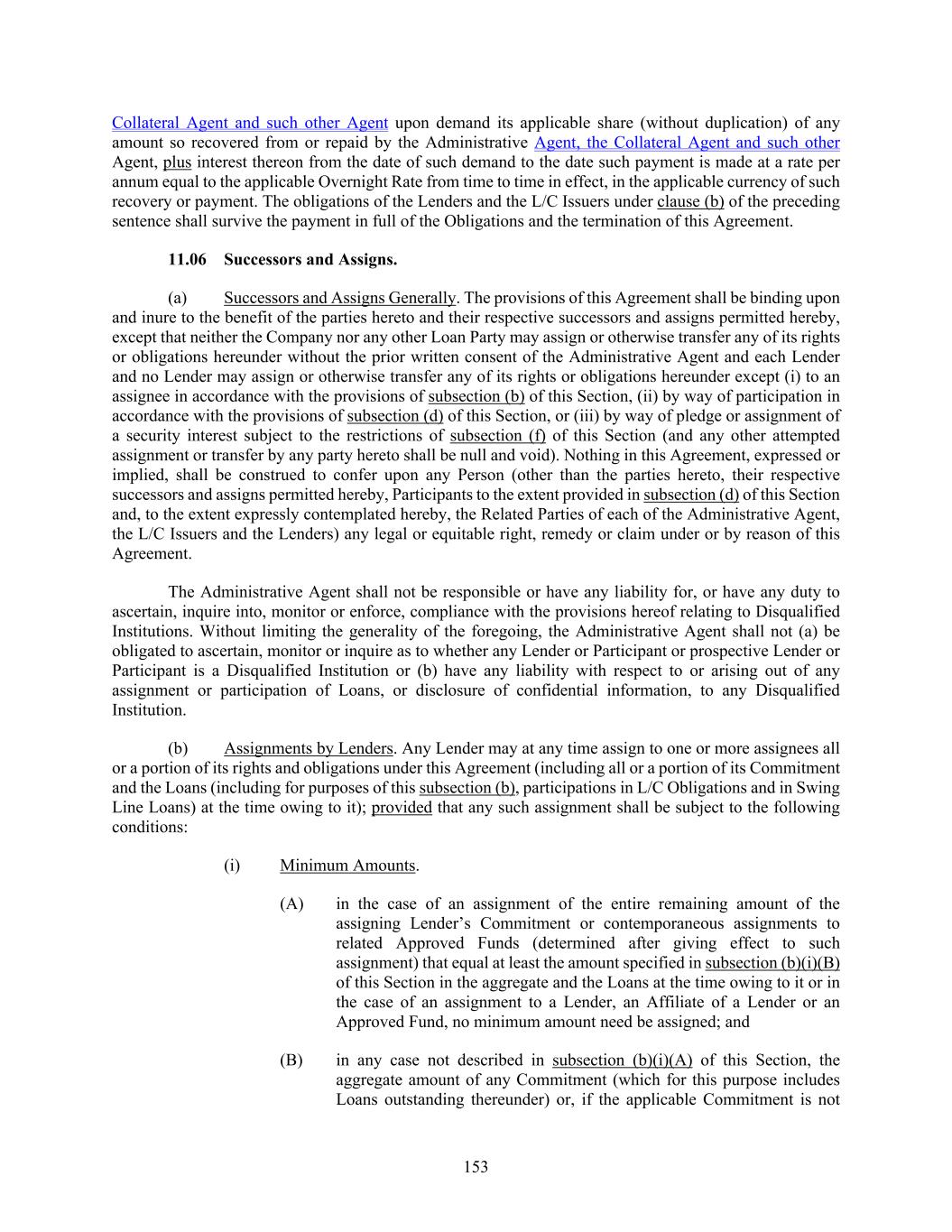 153 Collateral Agent and such other Agent upon demand its applicable share (without duplication) of any amount so recovered from or repaid by the Administrative Agent, the Collateral Agent and such other Agent, plus interest thereon from the date of such demand to the date such payment is made at a rate per annum equal to the applicable Overnight Rate from time to time in effect, in the applicable currency of such recovery or payment. The obligations of the Lenders and the L/C Issuers under clause (b) of the preceding sentence shall survive the payment in full of the Obligations and the termination of this Agreement. 11.06 Successors and Assigns. (a) Successors and Assigns Generally. The provisions of this Agreement shall be binding upon and inure to the benefit of the parties hereto and their respective successors and assigns permitted hereby, except that neither the Company nor any other Loan Party may assign or otherwise transfer any of its rights or obligations hereunder without the prior written consent of the Administrative Agent and each Lender and no Lender may assign or otherwise transfer any of its rights or obligations hereunder except (i) to an assignee in accordance with the provisions of subsection (b) of this Section, (ii) by way of participation in accordance with the provisions of subsection (d) of this Section, or (iii) by way of pledge or assignment of a security interest subject to the restrictions of subsection (f) of this Section (and any other attempted assignment or transfer by any party hereto shall be null and void). Nothing in this Agreement, expressed or implied, shall be construed to confer upon any Person (other than the parties hereto, their respective successors and assigns permitted hereby, Participants to the extent provided in subsection (d) of this Section and, to the extent expressly contemplated hereby, the Related Parties of each of the Administrative Agent, the L/C Issuers and the Lenders) any legal or equitable right, remedy or claim under or by reason of this Agreement. The Administrative Agent shall not be responsible or have any liability for, or have any duty to ascertain, inquire into, monitor or enforce, compliance with the provisions hereof relating to Disqualified Institutions. Without limiting the generality of the foregoing, the Administrative Agent shall not (a) be obligated to ascertain, monitor or inquire as to whether any Lender or Participant or prospective Lender or Participant is a Disqualified Institution or (b) have any liability with respect to or arising out of any assignment or participation of Loans, or disclosure of confidential information, to any Disqualified Institution. (b) Assignments by Lenders. Any Lender may at any time assign to one or more assignees all or a portion of its rights and obligations under this Agreement (including all or a portion of its Commitment and the Loans (including for purposes of this subsection (b), participations in L/C Obligations and in Swing Line Loans) at the time owing to it); provided that any such assignment shall be subject to the following conditions: (i) Minimum Amounts. (A) in the case of an assignment of the entire remaining amount of the assigning Lender’s Commitment or contemporaneous assignments to related Approved Funds (determined after giving effect to such assignment) that equal at least the amount specified in subsection (b)(i)(B) of this Section in the aggregate and the Loans at the time owing to it or in the case of an assignment to a Lender, an Affiliate of a Lender or an Approved Fund, no minimum amount need be assigned; and (B) in any case not described in subsection (b)(i)(A) of this Section, the aggregate amount of any Commitment (which for this purpose includes Loans outstanding thereunder) or, if the applicable Commitment is not