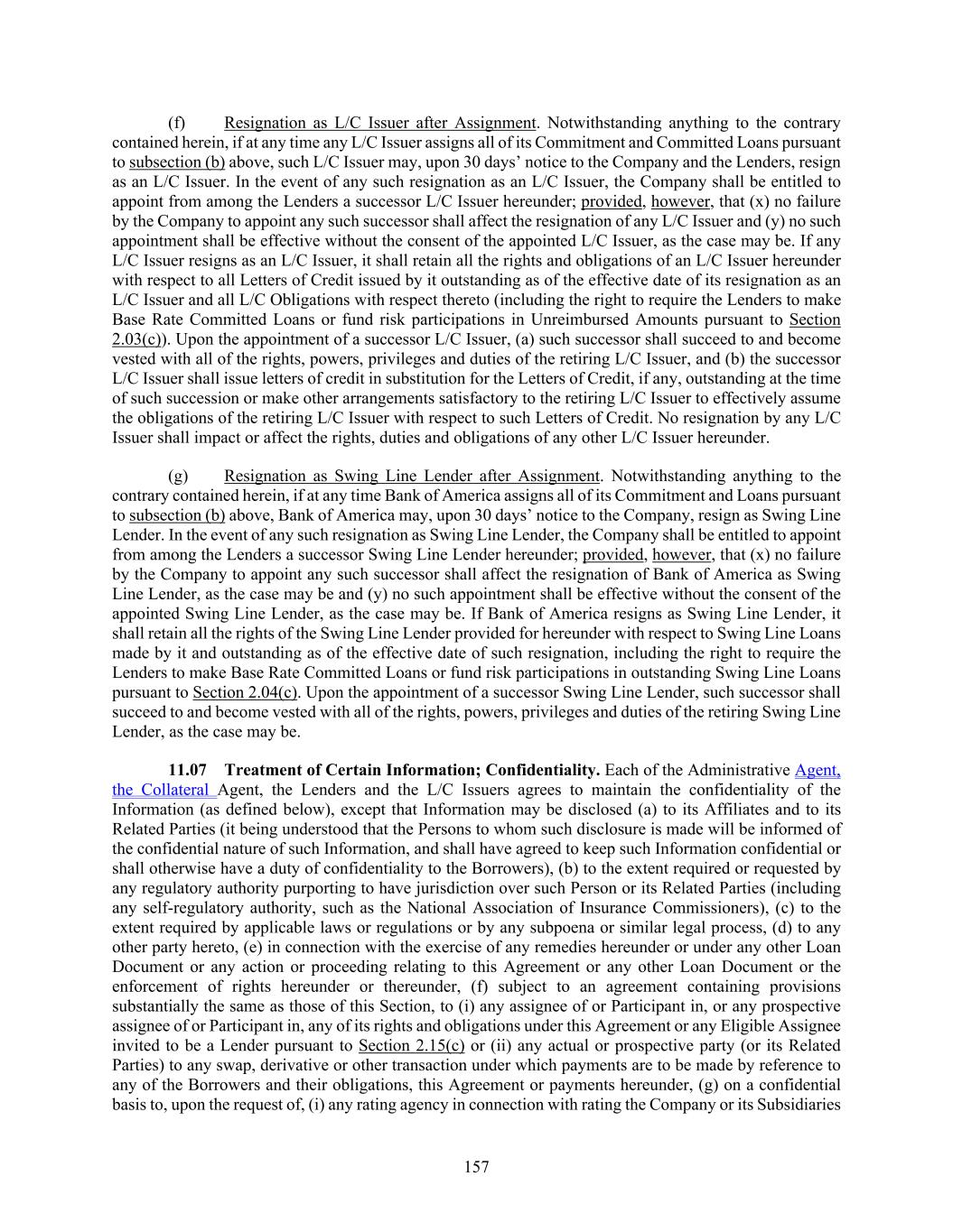 157 (f) Resignation as L/C Issuer after Assignment. Notwithstanding anything to the contrary contained herein, if at any time any L/C Issuer assigns all of its Commitment and Committed Loans pursuant to subsection (b) above, such L/C Issuer may, upon 30 days’ notice to the Company and the Lenders, resign as an L/C Issuer. In the event of any such resignation as an L/C Issuer, the Company shall be entitled to appoint from among the Lenders a successor L/C Issuer hereunder; provided, however, that (x) no failure by the Company to appoint any such successor shall affect the resignation of any L/C Issuer and (y) no such appointment shall be effective without the consent of the appointed L/C Issuer, as the case may be. If any L/C Issuer resigns as an L/C Issuer, it shall retain all the rights and obligations of an L/C Issuer hereunder with respect to all Letters of Credit issued by it outstanding as of the effective date of its resignation as an L/C Issuer and all L/C Obligations with respect thereto (including the right to require the Lenders to make Base Rate Committed Loans or fund risk participations in Unreimbursed Amounts pursuant to Section 2.03(c)). Upon the appointment of a successor L/C Issuer, (a) such successor shall succeed to and become vested with all of the rights, powers, privileges and duties of the retiring L/C Issuer, and (b) the successor L/C Issuer shall issue letters of credit in substitution for the Letters of Credit, if any, outstanding at the time of such succession or make other arrangements satisfactory to the retiring L/C Issuer to effectively assume the obligations of the retiring L/C Issuer with respect to such Letters of Credit. No resignation by any L/C Issuer shall impact or affect the rights, duties and obligations of any other L/C Issuer hereunder. (g) Resignation as Swing Line Lender after Assignment. Notwithstanding anything to the contrary contained herein, if at any time Bank of America assigns all of its Commitment and Loans pursuant to subsection (b) above, Bank of America may, upon 30 days’ notice to the Company, resign as Swing Line Lender. In the event of any such resignation as Swing Line Lender, the Company shall be entitled to appoint from among the Lenders a successor Swing Line Lender hereunder; provided, however, that (x) no failure by the Company to appoint any such successor shall affect the resignation of Bank of America as Swing Line Lender, as the case may be and (y) no such appointment shall be effective without the consent of the appointed Swing Line Lender, as the case may be. If Bank of America resigns as Swing Line Lender, it shall retain all the rights of the Swing Line Lender provided for hereunder with respect to Swing Line Loans made by it and outstanding as of the effective date of such resignation, including the right to require the Lenders to make Base Rate Committed Loans or fund risk participations in outstanding Swing Line Loans pursuant to Section 2.04(c). Upon the appointment of a successor Swing Line Lender, such successor shall succeed to and become vested with all of the rights, powers, privileges and duties of the retiring Swing Line Lender, as the case may be. 11.07 Treatment of Certain Information; Confidentiality. Each of the Administrative Agent, the Collateral Agent, the Lenders and the L/C Issuers agrees to maintain the confidentiality of the Information (as defined below), except that Information may be disclosed (a) to its Affiliates and to its Related Parties (it being understood that the Persons to whom such disclosure is made will be informed of the confidential nature of such Information, and shall have agreed to keep such Information confidential or shall otherwise have a duty of confidentiality to the Borrowers), (b) to the extent required or requested by any regulatory authority purporting to have jurisdiction over such Person or its Related Parties (including any self-regulatory authority, such as the National Association of Insurance Commissioners), (c) to the extent required by applicable laws or regulations or by any subpoena or similar legal process, (d) to any other party hereto, (e) in connection with the exercise of any remedies hereunder or under any other Loan Document or any action or proceeding relating to this Agreement or any other Loan Document or the enforcement of rights hereunder or thereunder, (f) subject to an agreement containing provisions substantially the same as those of this Section, to (i) any assignee of or Participant in, or any prospective assignee of or Participant in, any of its rights and obligations under this Agreement or any Eligible Assignee invited to be a Lender pursuant to Section 2.15(c) or (ii) any actual or prospective party (or its Related Parties) to any swap, derivative or other transaction under which payments are to be made by reference to any of the Borrowers and their obligations, this Agreement or payments hereunder, (g) on a confidential basis to, upon the request of, (i) any rating agency in connection with rating the Company or its Subsidiaries