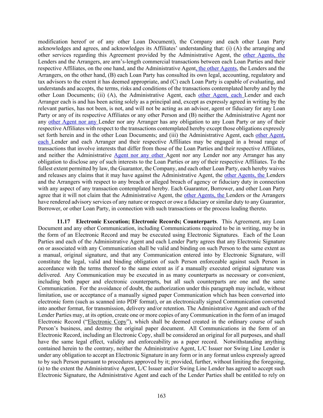 163 modification hereof or of any other Loan Document), the Company and each other Loan Party acknowledges and agrees, and acknowledges its Affiliates’ understanding that: (i) (A) the arranging and other services regarding this Agreement provided by the Administrative Agent, the other Agents, the Lenders and the Arrangers, are arm’s-length commercial transactions between each Loan Parties and their respective Affiliates, on the one hand, and the Administrative Agent, the other Agents, the Lenders and the Arrangers, on the other hand, (B) each Loan Party has consulted its own legal, accounting, regulatory and tax advisors to the extent it has deemed appropriate, and (C) each Loan Party is capable of evaluating, and understands and accepts, the terms, risks and conditions of the transactions contemplated hereby and by the other Loan Documents; (ii) (A), the Administrative Agent, each other Agent, each Lender and each Arranger each is and has been acting solely as a principal and, except as expressly agreed in writing by the relevant parties, has not been, is not, and will not be acting as an advisor, agent or fiduciary for any Loan Party or any of its respective Affiliates or any other Person and (B) neither the Administrative Agent nor any other Agent nor any Lender nor any Arranger has any obligation to any Loan Party or any of their respective Affiliates with respect to the transactions contemplated hereby except those obligations expressly set forth herein and in the other Loan Documents; and (iii) the Administrative Agent, each other Agent, each Lender and each Arranger and their respective Affiliates may be engaged in a broad range of transactions that involve interests that differ from those of the Loan Parties and their respective Affiliates, and neither the Administrative Agent nor any other Agent nor any Lender nor any Arranger has any obligation to disclose any of such interests to the Loan Parties or any of their respective Affiliates. To the fullest extent permitted by law, the Guarantor, the Company, and each other Loan Party, each hereby waives and releases any claims that it may have against the Administrative Agent, the other Agents, the Lenders and the Arrangers with respect to any breach or alleged breach of agency or fiduciary duty in connection with any aspect of any transaction contemplated hereby. Each Guarantor, Borrower, and other Loan Party agree that it will not claim that the Administrative Agent, the other Agents, the Lenders or the Arrangers have rendered advisory services of any nature or respect or owe a fiduciary or similar duty to any Guarantor, Borrower, or other Loan Party, in connection with such transactions or the process leading thereto. 11.17 Electronic Execution; Electronic Records; Counterparts. This Agreement, any Loan Document and any other Communication, including Communications required to be in writing, may be in the form of an Electronic Record and may be executed using Electronic Signatures. Each of the Loan Parties and each of the Administrative Agent and each Lender Party agrees that any Electronic Signature on or associated with any Communication shall be valid and binding on such Person to the same extent as a manual, original signature, and that any Communication entered into by Electronic Signature, will constitute the legal, valid and binding obligation of such Person enforceable against such Person in accordance with the terms thereof to the same extent as if a manually executed original signature was delivered. Any Communication may be executed in as many counterparts as necessary or convenient, including both paper and electronic counterparts, but all such counterparts are one and the same Communication. For the avoidance of doubt, the authorization under this paragraph may include, without limitation, use or acceptance of a manually signed paper Communication which has been converted into electronic form (such as scanned into PDF format), or an electronically signed Communication converted into another format, for transmission, delivery and/or retention. The Administrative Agent and each of the Lender Parties may, at its option, create one or more copies of any Communication in the form of an imaged Electronic Record (“Electronic Copy”), which shall be deemed created in the ordinary course of such Person’s business, and destroy the original paper document. All Communications in the form of an Electronic Record, including an Electronic Copy, shall be considered an original for all purposes, and shall have the same legal effect, validity and enforceability as a paper record. Notwithstanding anything contained herein to the contrary, neither the Administrative Agent, L/C Issuer nor Swing Line Lender is under any obligation to accept an Electronic Signature in any form or in any format unless expressly agreed to by such Person pursuant to procedures approved by it; provided, further, without limiting the foregoing, (a) to the extent the Administrative Agent, L/C Issuer and/or Swing Line Lender has agreed to accept such Electronic Signature, the Administrative Agent and each of the Lender Parties shall be entitled to rely on