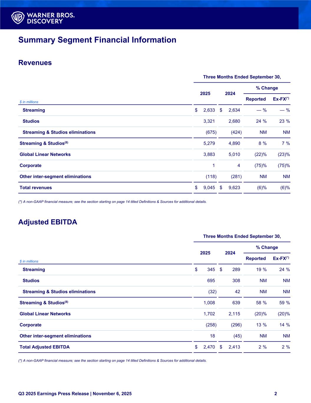 Warner Bros. Discovery Reports Third-Quarter 2025 Results Three Months Ended September 30, 2025 2024 % Change $ in millions Reported Ex-FX(*) Distribution $ 4,702 $ 4,920 (4) % (4) % Advertising 1,407 1,682 (16) % (17) % Content 2,649 2,721 (3) % (3) % Other 287 300 (4) % (7) % Total revenues $ 9,045 $ 9,623 (6) % (6) % Net (loss) income available to Warner Bros. Discovery, Inc. (148) 135 NM NM Adjusted EBITDA(*) 2,470 2,413 2 % 2 % Cash provided by operating activities 979 847 16 % Free cash flow(*) 701 632 11 % NM - Not Meaningful (*) A non-GAAP financial measure; see the section starting on page 14 titled Definitions & Sources for additional details. Q3 2025 Highlights • Total revenues were $9.0 billion, a 6% ex-FX(1) decrease from the prior year quarter. Total revenues excluding the impact of the 2024 Olympics in Europe were flat ex-FX(2)(*) compared to the prior year quarter. • Distribution revenues decreased 4% ex-FX, as dynamic underlying growth in global streaming subscribers was more than offset by continued domestic linear pay TV subscriber declines and the first full quarter impact of the HBO Max domestic distribution deal renewal with a former related party, previously disclosed in Q2. • Advertising revenues decreased 17% ex-FX, as ad-lite streaming subscriber growth was more than offset by domestic linear audience declines. • Content revenues decreased 3% ex-FX, primarily driven by the sublicensing of Olympic sports rights to broadcast networks throughout Europe in the prior year partially offset by the stronger performance of the theatrical releases in the current year quarter. Content revenues excluding the impact of the 2024 Olympics in Europe increased 23% ex-FX.(2)(*) • Net loss available to Warner Bros. Discovery, Inc. was $148.0 million, which includes $1.3 billion of pre-tax acquisition- related amortization of intangibles, content fair value step-up, and restructuring expenses. • Total Adjusted EBITDA(3)(*) was $2.5 billion, a 2% ex-FX increase compared to the prior year quarter, primarily due to growth in the Streaming and Studios segments, partially offset by a decline in the Global Linear Networks segment. • Cash provided by operating activities was $1.0 billion. Free cash flow(4)(*) was $0.7 billion. Free cash flow was unfavorably impacted by approximately $500 million of separation-related items. • The Company repaid $1.2 billion of debt during the quarter, including $1.0 billion of the bridge loan facility. • The Company ended the quarter with $4.3 billion of cash on hand, $34.5 billion of gross debt(5)(*), and 3.3x net leverage.(6)(*) • The Company ended the quarter with 128.0 million streaming subscribers(7), an increase of 2.3 million subscribers vs. Q2. Q3 2025 Earnings Press Release | November 6, 2025 1
