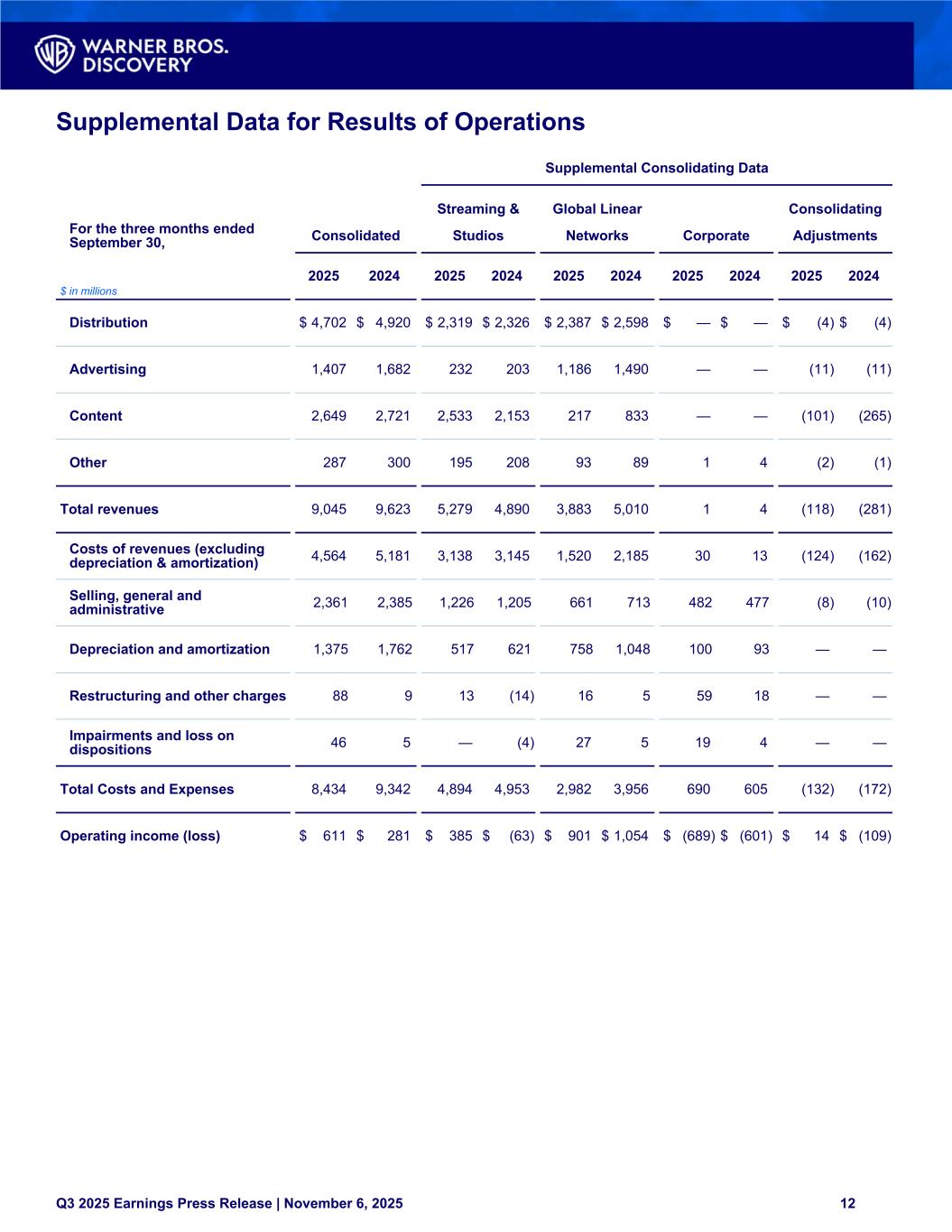 Supplemental Data for Results of Operations Supplemental Consolidating Data Streaming & Global Linear Consolidating For the three months ended September 30, Consolidated Studios Networks Corporate Adjustments $ in millions 2025 2024 2025 2024 2 2025 2024 2025 2024 2025 2024 Distribution $ 4,702 $ 4,920 $ 2,319 $ 2,326 $ 2,387 $ 2,598 $ — $ — $ (4) $ (4) Advertising 1,407 1,682 232 203 1,186 1,490 — — (11) (11) Content 2,649 2,721 2,533 2,153 217 833 — — (101) (265) Other 287 300 195 208 93 89 1 4 (2) (1) Total revenues 9,045 9,623 5,279 4,890 3,883 5,010 1 4 (118) (281) Costs of revenues (excluding depreciation & amortization) 4,564 5,181 3,138 3,145 1,520 2,185 30 13 (124) (162) Selling, general and administrative 2,361 2,385 1,226 1,205 661 713 482 477 (8) (10) Depreciation and amortization 1,375 1,762 517 621 758 1,048 100 93 — — Restructuring and other charges 88 9 13 (14) 16 5 59 18 — — Impairments and loss on dispositions 46 5 — (4) 27 5 19 4 — — Total Costs and Expenses 8,434 9,342 4,894 4,953 2,982 3,956 690 605 (132) (172) Operating income (loss) $ 611 $ 281 $ 385 $ (63) $ 901 $ 1,054 $ (689) $ (601) $ 14 $ (109) Q3 2025 Earnings Press Release | November 6, 2025 12