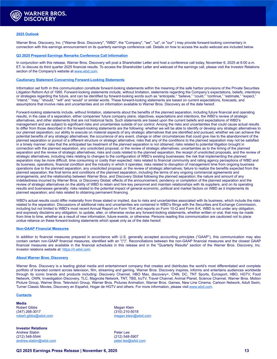 2025 Outlook Warner Bros. Discovery, Inc. ("Warner Bros. Discovery", "WBD", the "Company", "we", "us", or "our" ) may provide forward-looking commentary in connection with this earnings announcement on its quarterly earnings conference call. Details on how to access the audio webcast are included below. Q3 2025 Prepared Earnings Remarks Conference Call Information In conjunction with this release, Warner Bros. Discovery will post a Shareholder Letter and host a conference call today, November 6, 2025 at 8:00 a.m. ET, to discuss its third quarter 2025 financial results. To access the Shareholder Letter and webcast of the earnings call, please visit the Investor Relations section of the Company's website at www.wbd.com. Cautionary Statement Concerning Forward-Looking Statements Information set forth in this communication constitute forward-looking statements within the meaning of the safe harbor provisions of the Private Securities Litigation Reform Act of 1995. Forward-looking statements include, without limitation, statements regarding the Company’s expectations, beliefs, intentions or strategies regarding the future, and can be identified by forward-looking words such as “anticipate,” “believe,” “could,” “continue,” “estimate,” “expect,” “intend,” “may,” “should,” “will” and “would” or similar words. These forward-looking statements are based on current expectations, forecasts, and assumptions that involve risks and uncertainties and on information available to Warner Bros. Discovery as of the date hereof. Forward-looking statements include, without limitation, statements about the benefits of the planned separation, including future financial and operating results, in the case of a separation, either companies’ future company plans, objectives, expectations and intentions, the WBD’s review of strategic alternatives, and other statements that are not historical facts. Such statements are based upon the current beliefs and expectations of WBD’s management and are subject to significant risks and uncertainties outside of our control. Among the risks and uncertainties that could cause actual results to differ from those described in the forward-looking statements are the following: whether we will be able to identify or develop any strategic alternatives to our planned separation; our ability to execute on material aspects of any strategic alternatives that are identified and pursued, whether we can achieve the potential benefits of any strategic alternatives; the occurrence of any event, change or other circumstances that could give rise to the abandonment of the planned separation or pursuit of a different structure or strategic alternative; risks that any of the conditions to the planned separation may not be satisfied in a timely manner; risks that the anticipated tax treatment of the planned separation is not obtained; risks related to potential litigation brought in connection with the planned separation, any unsolicited proposal, or the review of strategic alternatives; uncertainties as to the timing of the planned separation and the review of strategic alternatives; risks and costs related to the planned separation, the receipt of unsolicited proposals, and the review of strategic alternatives, including risks relating to changes to the configuration of WBD’s existing businesses; the risk that implementing the planned separation may be more difficult, time consuming or costly than expected; risks related to financial community and rating agency perceptions of WBD and its business, operations, financial condition and the industry in which it operates; risks related to disruption of management time from ongoing business operations due to the planned separation, any unsolicited proposal, or the review of strategic alternatives; failure to realize the benefits expected from the planned separation; the final terms and conditions of the planned separation, including the terms of any ongoing commercial agreements and arrangements, and the relationship between Warner Bros. and Discovery Global following the planned separation; the nature and amount of any indebtedness incurred by Warner Bros. or Discovery Global; effects of the announcement, pendency or completion of the planned separation and the review of strategic alternatives on the ability of WBD to retain and hire key personnel and maintain relationships with its suppliers, and on its operating results and businesses generally; risks related to the potential impact of general economic, political and market factors on WBD as it implements its planned separation; and risks related to obtaining permanent financing. WBD's actual results could differ materially from those stated or implied, due to risks and uncertainties associated with its business, which include the risks related to the separation. Discussions of additional risks and uncertainties are contained in WBD’s filings with the Securities and Exchange Commission, including but not limited to WBD’s most recent Annual Report on Form 10-K and reports on Form 10-Q and Form 8-K. WBD is not under any obligation, and expressly disclaims any obligation, to update, alter, or otherwise revise any forward-looking statements, whether written or oral, that may be made from time to time, whether as a result of new information, future events, or otherwise. Persons reading this communication are cautioned not to place undue reliance on these forward-looking statements which speak only as of the date hereof. Non-GAAP Financial Measures In addition to financial measures prepared in accordance with U.S. generally accepted accounting principles (“GAAP”), this communication may also contain certain non-GAAP financial measures, identified with an "(*)". Reconciliations between the non-GAAP financial measures and the closest GAAP financial measures are available in the financial schedules in this release and in the "Quarterly Results" sect