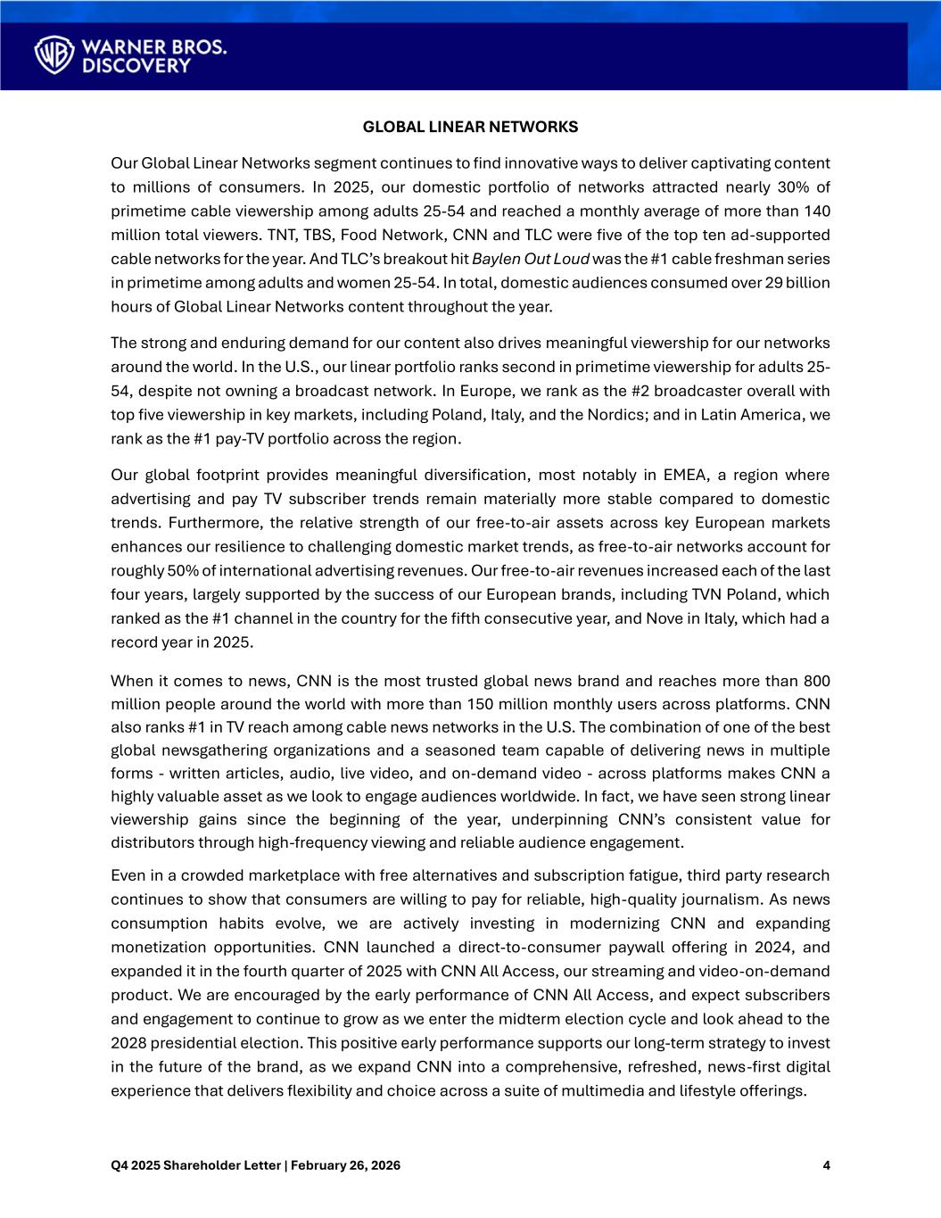 Q4 2025 Shareholder Letter | February 26, 2026 4 GLOBAL LINEAR NETWORKS Our Global Linear Networks segment continues to find innovative ways to deliver captivating content to millions of consumers. In 2025, our domestic portfolio of networks attracted nearly 30% of primetime cable viewership among adults 25-54 and reached a monthly average of more than 140 million total viewers. TNT, TBS, Food Network, CNN and TLC were five of the top ten ad-supported cable networks for the year. And TLC’s breakout hit Baylen Out Loud was the #1 cable freshman series in primetime among adults and women 25-54. In total, domestic audiences consumed over 29 billion hours of Global Linear Networks content throughout the year. The strong and enduring demand for our content also drives meaningful viewership for our networks around the world. In the U.S., our linear portfolio ranks second in primetime viewership for adults 25- 54, despite not owning a broadcast network. In Europe, we rank as the #2 broadcaster overall with top five viewership in key markets, including Poland, Italy, and the Nordics; and in Latin America, we rank as the #1 pay-TV portfolio across the region. Our global footprint provides meaningful diversification, most notably in EMEA, a region where advertising and pay TV subscriber trends remain materially more stable compared to domestic trends. Furthermore, the relative strength of our free-to-air assets across key European markets enhances our resilience to challenging domestic market trends, as free-to-air networks account for roughly 50% of international advertising revenues. Our free-to-air revenues increased each of the last four years, largely supported by the success of our European brands, including TVN Poland, which ranked as the #1 channel in the country for the fifth consecutive year, and Nove in Italy, which had a record year in 2025. When it comes to news, CNN is the most trusted global news brand and reaches more than 800 million people around the world with more than 150 million monthly users across platforms. CNN also ranks #1 in TV reach among cable news networks in the U.S. The combination of one of the best global newsgathering organizations and a seasoned team capable of delivering news in multiple forms - written articles, audio, live video, and on-demand video - across platforms makes CNN a highly valuable asset as we look to engage audiences worldwide. In fact, we have seen strong linear viewership gains since the beginning of the year, underpinning CNN’s consistent value for distributors through high-frequency viewing and reliable audience engagement. Even in a crowded marketplace with free alternatives and subscription fatigue, third party research continues to show that consumers are willing to pay for reliable, high-quality journalism. As news consumption habits evolve, we are actively investing in modernizing CNN and expanding monetization opportunities. CNN launched a direct-to-consumer paywall offering in 2024, and expanded it in the fourth quarter of 2025 with CNN All Access, our streaming and video-on-demand product. We are encouraged by the early performance of CNN All Access, and expect subscribers and engagement to continue to grow as we enter the midterm election cycle and look ahead to the 2028 presidential election. This positive early performance supports our long-term strategy to invest in the future of the brand, as we expand CNN into a comprehensive, refreshed, news-first digital experience that delivers flexibility and choice across a suite of multimedia and lifestyle offerings.