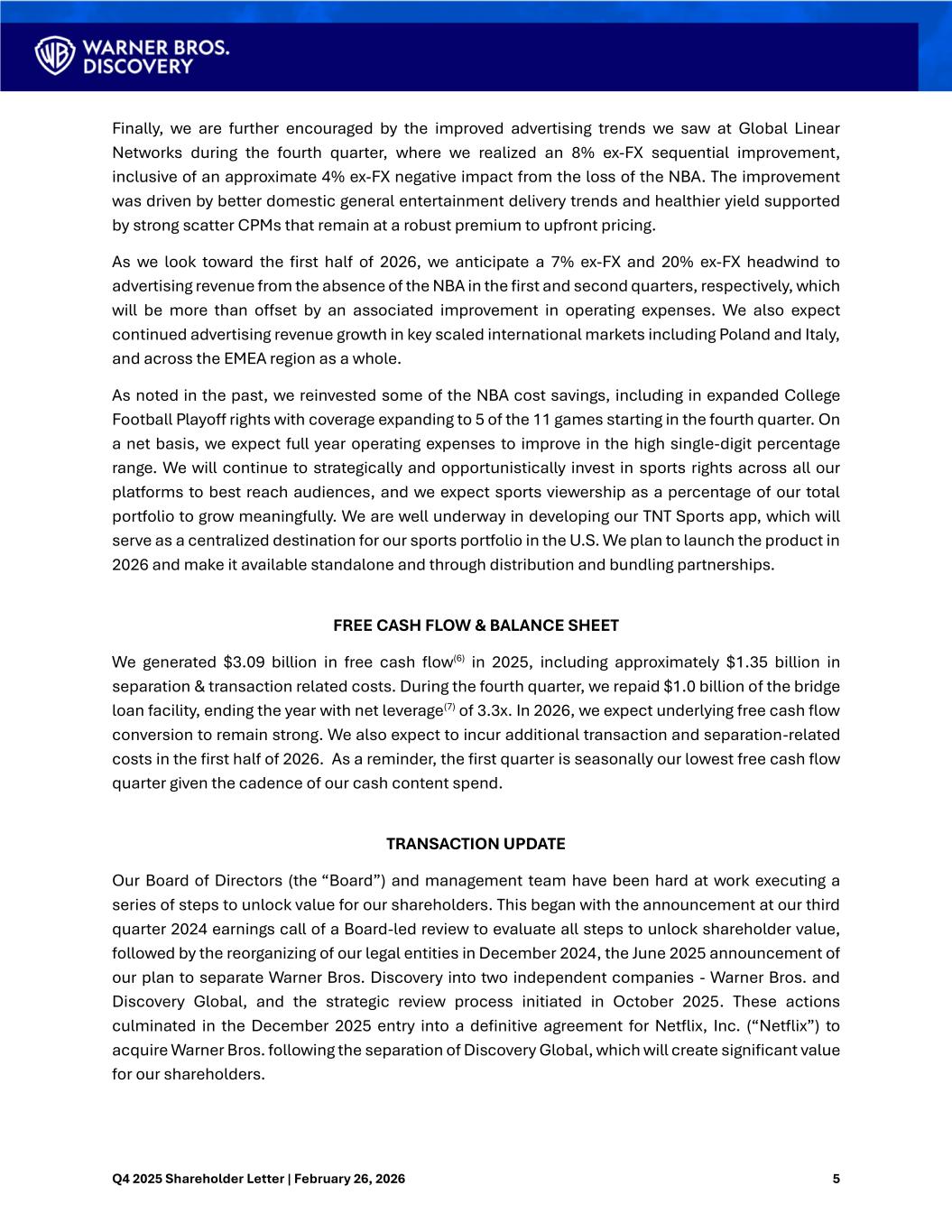 Q4 2025 Shareholder Letter | February 26, 2026 5 Finally, we are further encouraged by the improved advertising trends we saw at Global Linear Networks during the fourth quarter, where we realized an 8% ex-FX sequential improvement, inclusive of an approximate 4% ex-FX negative impact from the loss of the NBA. The improvement was driven by better domestic general entertainment delivery trends and healthier yield supported by strong scatter CPMs that remain at a robust premium to upfront pricing. As we look toward the first half of 2026, we anticipate a 7% ex-FX and 20% ex-FX headwind to advertising revenue from the absence of the NBA in the first and second quarters, respectively, which will be more than offset by an associated improvement in operating expenses. We also expect continued advertising revenue growth in key scaled international markets including Poland and Italy, and across the EMEA region as a whole. As noted in the past, we reinvested some of the NBA cost savings, including in expanded College Football Playoff rights with coverage expanding to 5 of the 11 games starting in the fourth quarter. On a net basis, we expect full year operating expenses to improve in the high single-digit percentage range. We will continue to strategically and opportunistically invest in sports rights across all our platforms to best reach audiences, and we expect sports viewership as a percentage of our total portfolio to grow meaningfully. We are well underway in developing our TNT Sports app, which will serve as a centralized destination for our sports portfolio in the U.S. We plan to launch the product in 2026 and make it available standalone and through distribution and bundling partnerships. FREE CASH FLOW & BALANCE SHEET We generated $3.09 billion in free cash flow(6) in 2025, including approximately $1.35 billion in separation & transaction related costs. During the fourth quarter, we repaid $1.0 billion of the bridge loan facility, ending the year with net leverage(7) of 3.3x. In 2026, we expect underlying free cash flow conversion to remain strong. We also expect to incur additional transaction and separation-related costs in the first half of 2026. As a reminder, the first quarter is seasonally our lowest free cash flow quarter given the cadence of our cash content spend. TRANSACTION UPDATE Our Board of Directors (the “Board”) and management team have been hard at work executing a series of steps to unlock value for our shareholders. This began with the announcement at our third quarter 2024 earnings call of a Board-led review to evaluate all steps to unlock shareholder value, followed by the reorganizing of our legal entities in December 2024, the June 2025 announcement of our plan to separate Warner Bros. Discovery into two independent companies - Warner Bros. and Discovery Global, and the strategic review process initiated in October 2025. These actions culminated in the December 2025 entry into a definitive agreement for Netflix, Inc. (“Netflix”) to acquire Warner Bros. following the separation of Discovery Global, which will create significant value for our shareholders.