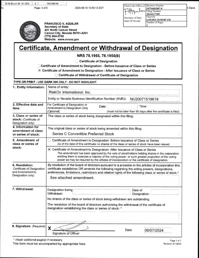 Filed in the Office of Secretary of State State Of NevadaBusiness NumberE0794682007-0Filing Number20244117289Filed On6/10/2024 10:58:00 AMNumber of Pages3