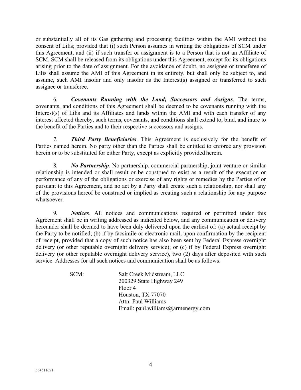 or substantially all of its Gas gathering and processing facilities within the AMI without the consent of Lilis; provided that (i) such Person assumes in writing the obligations of SCM under this Agreement, and (ii) if such transfer or assignment is to a Person that is not an Affiliate of SCM, SCM shall be released from its obligations under this Agreement, except for its obligations arising prior to the date of assignment. For the avoidance of doubt, no assignee or transferee of Lilis shall assume the AMI of this Agreement in its entirety, but shall only be subject to, and assume, such AMI insofar and only insofar as the Interest(s) assigned or transferred to such assignee or transferee. 6. Covenants Running with the Land; Successors and Assigns. The terms, covenants, and conditions of this Agreement shall be deemed to be covenants running with the Interest(s) of Lilis and its Affiliates and lands within the AMI and with each transfer of any interest affected thereby, such terms, covenants, and conditions shall extend to, bind, and inure to the benefit of the Parties and to their respective successors and assigns. 7. Third Party Beneficiaries. This Agreement is exclusively for the benefit of Parties named herein. No party other than the Parties shall be entitled to enforce any provision herein or to be substituted for either Party, except as explicitly provided herein. 8. No Partnership. No partnership, commercial partnership, joint venture or similar relationship is intended or shall result or be construed to exist as a result of the execution or performance of any of the obligations or exercise of any rights or remedies by the Parties of or pursuant to this Agreement, and no act by a Party shall create such a relationship, nor shall any of the provisions hereof be construed or implied as creating such a relationship for any purpose whatsoever. 9. Notices. All notices and communications required or permitted under this Agreement shall be in writing addressed as indicated below, and any communication or delivery hereunder shall be deemed to have been duly delivered upon the earliest of: (a) actual receipt by the Party to be notified; (b) if by facsimile or electronic mail, upon confirmation by the recipient of receipt, provided that a copy of such notice has also been sent by Federal Express overnight delivery (or other reputable overnight delivery service); or (c) if by Federal Express overnight delivery (or other reputable overnight delivery service), two (2) days after deposited with such service. Addresses for all such notices and communication shall be as follows: SCM: Salt Creek Midstream, LLC 200329 State Highway 249 Floor 4 Houston, TX 77070 Attn: Paul Williams Email: paul.williams@armenergy.com 4 6645116v1