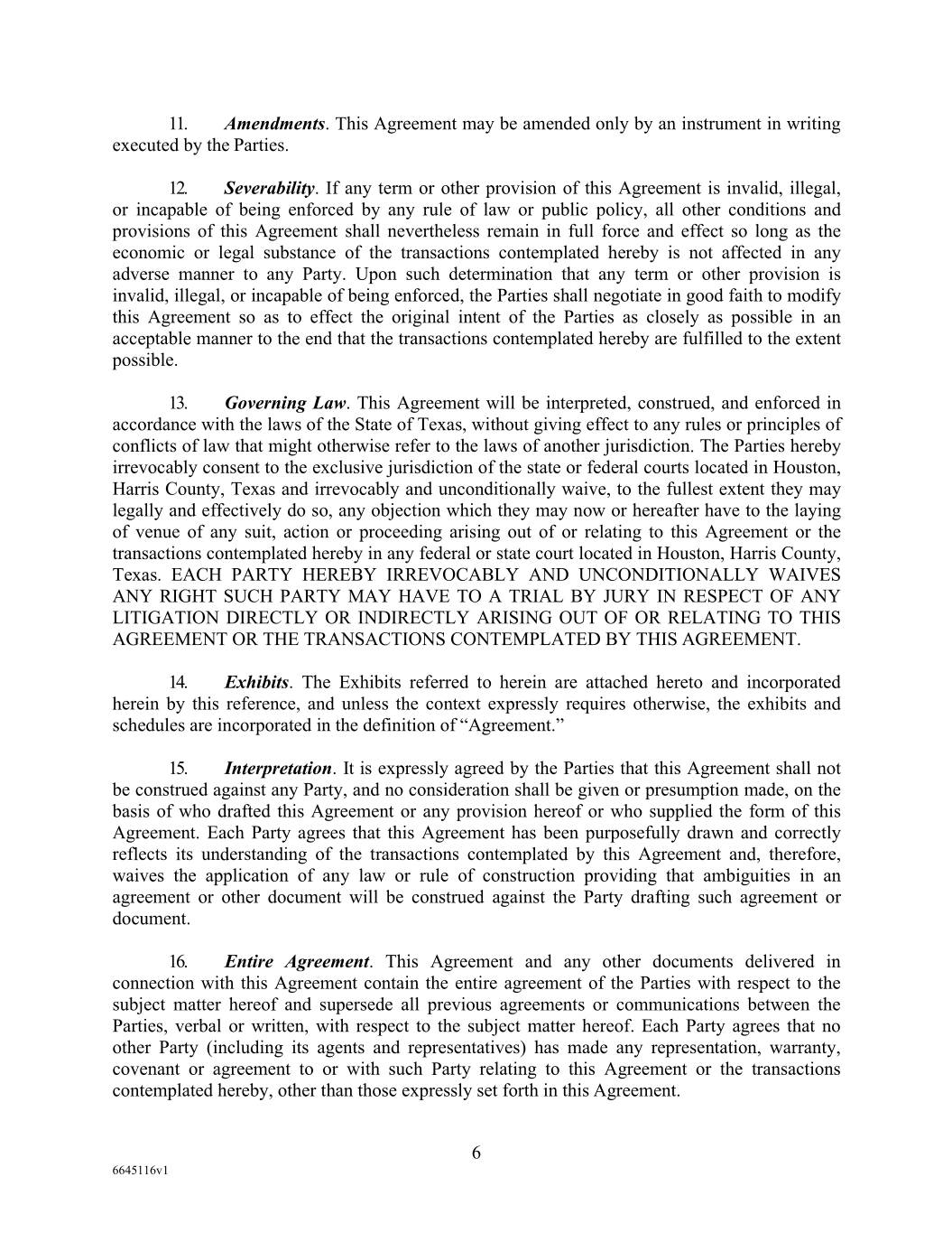 11. Amendments. This Agreement may be amended only by an instrument in writing executed by the Parties. 12. Severability. If any term or other provision of this Agreement is invalid, illegal, or incapable of being enforced by any rule of law or public policy, all other conditions and provisions of this Agreement shall nevertheless remain in full force and effect so long as the economic or legal substance of the transactions contemplated hereby is not affected in any adverse manner to any Party. Upon such determination that any term or other provision is invalid, illegal, or incapable of being enforced, the Parties shall negotiate in good faith to modify this Agreement so as to effect the original intent of the Parties as closely as possible in an acceptable manner to the end that the transactions contemplated hereby are fulfilled to the extent possible. 13. Governing Law. This Agreement will be interpreted, construed, and enforced in accordance with the laws of the State of Texas, without giving effect to any rules or principles of conflicts of law that might otherwise refer to the laws of another jurisdiction. The Parties hereby irrevocably consent to the exclusive jurisdiction of the state or federal courts located in Houston, Harris County, Texas and irrevocably and unconditionally waive, to the fullest extent they may legally and effectively do so, any objection which they may now or hereafter have to the laying of venue of any suit, action or proceeding arising out of or relating to this Agreement or the transactions contemplated hereby in any federal or state court located in Houston, Harris County, Texas. EACH PARTY HEREBY IRREVOCABLY AND UNCONDITIONALLY WAIVES ANY RIGHT SUCH PARTY MAY HAVE TO A TRIAL BY JURY IN RESPECT OF ANY LITIGATION DIRECTLY OR INDIRECTLY ARISING OUT OF OR RELATING TO THIS AGREEMENT OR THE TRANSACTIONS CONTEMPLATED BY THIS AGREEMENT. 14. Exhibits. The Exhibits referred to herein are attached hereto and incorporated herein by this reference, and unless the context expressly requires otherwise, the exhibits and schedules are incorporated in the definition of “Agreement.” 15. Interpretation. It is expressly agreed by the Parties that this Agreement shall not be construed against any Party, and no consideration shall be given or presumption made, on the basis of who drafted this Agreement or any provision hereof or who supplied the form of this Agreement. Each Party agrees that this Agreement has been purposefully drawn and correctly reflects its understanding of the transactions contemplated by this Agreement and, therefore, waives the application of any law or rule of construction providing that ambiguities in an agreement or other document will be construed against the Party drafting such agreement or document. 16. Entire Agreement. This Agreement and any other documents delivered in connection with this Agreement contain the entire agreement of the Parties with respect to the subject matter hereof and supersede all previous agreements or communications between the Parties, verbal or written, with respect to the subject matter hereof. Each Party agrees that no other Party (including its agents and representatives) has made any representation, warranty, covenant or agreement to or with such Party relating to this Agreement or the transactions contemplated hereby, other than those expressly set forth in this Agreement. 6 6645116v1