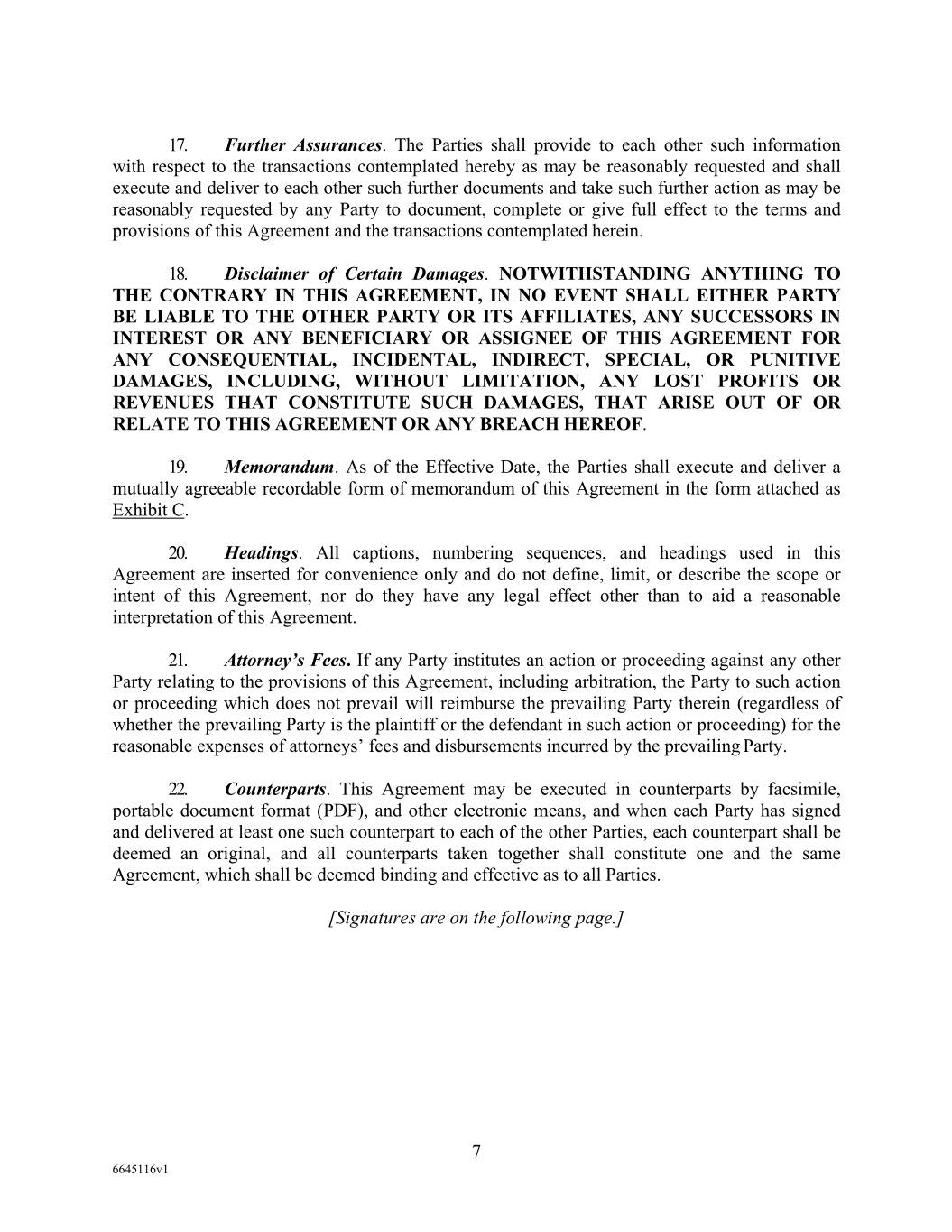 17. Further Assurances. The Parties shall provide to each other such information with respect to the transactions contemplated hereby as may be reasonably requested and shall execute and deliver to each other such further documents and take such further action as may be reasonably requested by any Party to document, complete or give full effect to the terms and provisions of this Agreement and the transactions contemplated herein. 18. Disclaimer of Certain Damages. NOTWITHSTANDING ANYTHING TO THE CONTRARY IN THIS AGREEMENT, IN NO EVENT SHALL EITHER PARTY BE LIABLE TO THE OTHER PARTY OR ITS AFFILIATES, ANY SUCCESSORS IN INTEREST OR ANY BENEFICIARY OR ASSIGNEE OF THIS AGREEMENT FOR ANY CONSEQUENTIAL, INCIDENTAL, INDIRECT, SPECIAL, OR PUNITIVE DAMAGES, INCLUDING, WITHOUT LIMITATION, ANY LOST PROFITS OR REVENUES THAT CONSTITUTE SUCH DAMAGES, THAT ARISE OUT OF OR RELATE TO THIS AGREEMENT OR ANY BREACH HEREOF. 19. Memorandum. As of the Effective Date, the Parties shall execute and deliver a mutually agreeable recordable form of memorandum of this Agreement in the form attached as Exhibit C. 20. Headings. All captions, numbering sequences, and headings used in this Agreement are inserted for convenience only and do not define, limit, or describe the scope or intent of this Agreement, nor do they have any legal effect other than to aid a reasonable interpretation of this Agreement. 21. Attorney’s Fees. If any Party institutes an action or proceeding against any other Party relating to the provisions of this Agreement, including arbitration, the Party to such action or proceeding which does not prevail will reimburse the prevailing Party therein (regardless of whether the prevailing Party is the plaintiff or the defendant in such action or proceeding) for the reasonable expenses of attorneys’ fees and disbursements incurred by the prevailing Party. 22. Counterparts. This Agreement may be executed in counterparts by facsimile, portable document format (PDF), and other electronic means, and when each Party has signed and delivered at least one such counterpart to each of the other Parties, each counterpart shall be deemed an original, and all counterparts taken together shall constitute one and the same Agreement, which shall be deemed binding and effective as to all Parties. [Signatures are on the following page.] 7 6645116v1