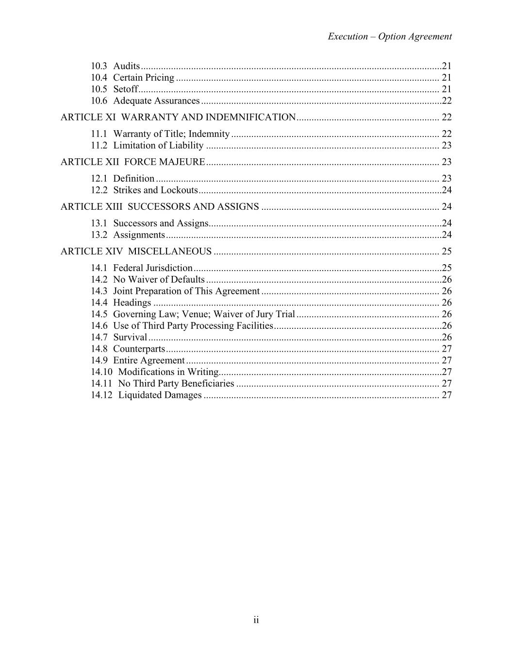 Execution – Option Agreement 10.3 Audits ........................................................................................................................21 10.4 Certain Pricing ......................................................................................................... 21 10.5 Setoff ........................................................................................................................ 21 10.6 Adequate Assurances ................................................................................................22 ARTICLE XI WARRANTY AND INDEMNIFICATION ......................................................... 22 11.1 Warranty of Title; Indemnity ................................................................................... 22 11.2 Limitation of Liability ............................................................................................. 23 ARTICLE XII FORCE MAJEURE ............................................................................................. 23 12.1 Definition ................................................................................................................. 23 12.2 Strikes and Lockouts .................................................................................................24 ARTICLE XIII SUCCESSORS AND ASSIGNS ....................................................................... 24 13.1 Successors and Assigns .............................................................................................24 13.2 Assignments ..............................................................................................................24 ARTICLE XIV MISCELLANEOUS .......................................................................................... 25 14.1 Federal Jurisdiction ...................................................................................................25 14.2 No Waiver of Defaults ..............................................................................................26 14.3 Joint Preparation of This Agreement ....................................................................... 26 14.4 Headings .................................................................................................................. 26 14.5 Governing Law; Venue; Waiver of Jury Trial ......................................................... 26 14.6 Use of Third Party Processing Facilities ...................................................................26 14.7 Survival .....................................................................................................................26 14.8 Counterparts ............................................................................................................. 27 14.9 Entire Agreement ..................................................................................................... 27 14.10 Modifications in Writing .........................................................................................27 14.11 No Third Party Beneficiaries ................................................................................. 27 14.12 Liquidated Damages .............................................................................................. 27 ii