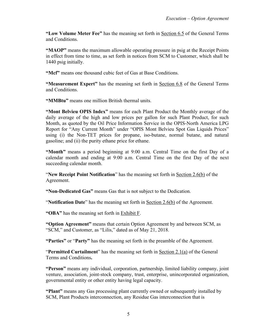 Execution – Option Agreement “Low Volume Meter Fee” has the meaning set forth in Section 6.5 of the General Terms and Conditions. “MAOP” means the maximum allowable operating pressure in psig at the Receipt Points in effect from time to time, as set forth in notices from SCM to Customer, which shall be 1440 psig initially. “Mcf” means one thousand cubic feet of Gas at Base Conditions. “Measurement Expert” has the meaning set forth in Section 6.8 of the General Terms and Conditions. “MMBtu” means one million British thermal units. “Mont Belvieu OPIS Index” means for each Plant Product the Monthly average of the daily average of the high and low prices per gallon for such Plant Product, for such Month, as quoted by the Oil Price Information Service in the OPIS-North America LPG Report for “Any Current Month” under “OPIS Mont Belvieu Spot Gas Liquids Prices” using (i) the Non-TET prices for propane, iso-butane, normal butane, and natural gasoline; and (ii) the purity ethane price for ethane. “Month” means a period beginning at 9:00 a.m. Central Time on the first Day of a calendar month and ending at 9:00 a.m. Central Time on the first Day of the next succeeding calendar month. “New Receipt Point Notification” has the meaning set forth in Section 2.6(b) of the Agreement. “Non-Dedicated Gas” means Gas that is not subject to the Dedication. “Notification Date” has the meaning set forth in Section 2.6(b) of the Agreement. “OBA” has the meaning set forth in Exhibit F. “Option Agreement” means that certain Option Agreement by and between SCM, as “SCM,” and Customer, as “Lilis,” dated as of May 21, 2018. “Parties” or “Party” has the meaning set forth in the preamble of the Agreement. “Permitted Curtailment” has the meaning set forth in Section 2.1(a) of the General Terms and Conditions. “Person” means any individual, corporation, partnership, limited liability company, joint venture, association, joint-stock company, trust, enterprise, unincorporated organization, governmental entity or other entity having legal capacity. “Plant” means any Gas processing plant currently owned or subsequently installed by SCM, Plant Products interconnection, any Residue Gas interconnection that is 5
