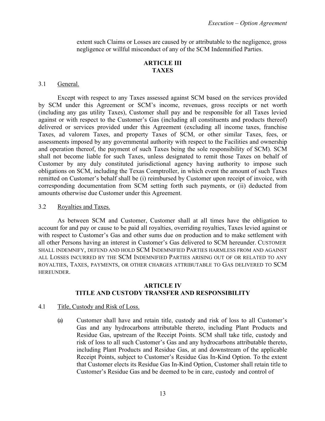 Execution – Option Agreement extent such Claims or Losses are caused by or attributable to the negligence, gross negligence or willful misconduct of any of the SCM Indemnified Parties. ARTICLE III TAXES 3.1 General. Except with respect to any Taxes assessed against SCM based on the services provided by SCM under this Agreement or SCM’s income, revenues, gross receipts or net worth (including any gas utility Taxes), Customer shall pay and be responsible for all Taxes levied against or with respect to the Customer’s Gas (including all constituents and products thereof) delivered or services provided under this Agreement (excluding all income taxes, franchise Taxes, ad valorem Taxes, and property Taxes of SCM, or other similar Taxes, fees, or assessments imposed by any governmental authority with respect to the Facilities and ownership and operation thereof, the payment of such Taxes being the sole responsibility of SCM). SCM shall not become liable for such Taxes, unless designated to remit those Taxes on behalf of Customer by any duly constituted jurisdictional agency having authority to impose such obligations on SCM, including the Texas Comptroller, in which event the amount of such Taxes remitted on Customer’s behalf shall be (i) reimbursed by Customer upon receipt of invoice, with corresponding documentation from SCM setting forth such payments, or (ii) deducted from amounts otherwise due Customer under this Agreement. 3.2 Royalties and Taxes. As between SCM and Customer, Customer shall at all times have the obligation to account for and pay or cause to be paid all royalties, overriding royalties, Taxes levied against or with respect to Customer’s Gas and other sums due on production and to make settlement with all other Persons having an interest in Customer’s Gas delivered to SCM hereunder. CUSTOMER SHALL INDEMNIFY, DEFEND AND HOLD SCM INDEMNIFIED PARTIES HARMLESS FROM AND AGAINST ALL LOSSES INCURRED BY THE SCM INDEMNIFIED PARTIES ARISING OUT OF OR RELATED TO ANY ROYALTIES, TAXES, PAYMENTS, OR OTHER CHARGES ATTRIBUTABLE TO GAS DELIVERED TO SCM HEREUNDER. ARTICLE IV TITLE AND CUSTODY TRANSFER AND RESPONSIBILITY 4.1 Title, Custody and Risk of Loss. (a) Customer shall have and retain title, custody and risk of loss to all Customer’s Gas and any hydrocarbons attributable thereto, including Plant Products and Residue Gas, upstream of the Receipt Points. SCM shall take title, custody and risk of loss to all such Customer’s Gas and any hydrocarbons attributable thereto, including Plant Products and Residue Gas, at and downstream of the applicable Receipt Points, subject to Customer’s Residue Gas In-Kind Option. To the extent that Customer elects its Residue Gas In-Kind Option, Customer shall retain title to Customer’s Residue Gas and be deemed to be in care, custody and control of 13